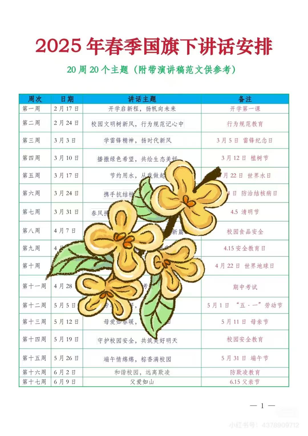 2025年春季中学国旗下讲话稿及升旗主题安排