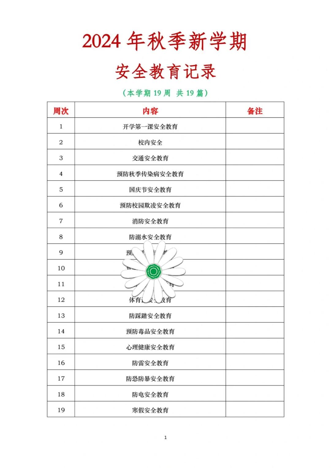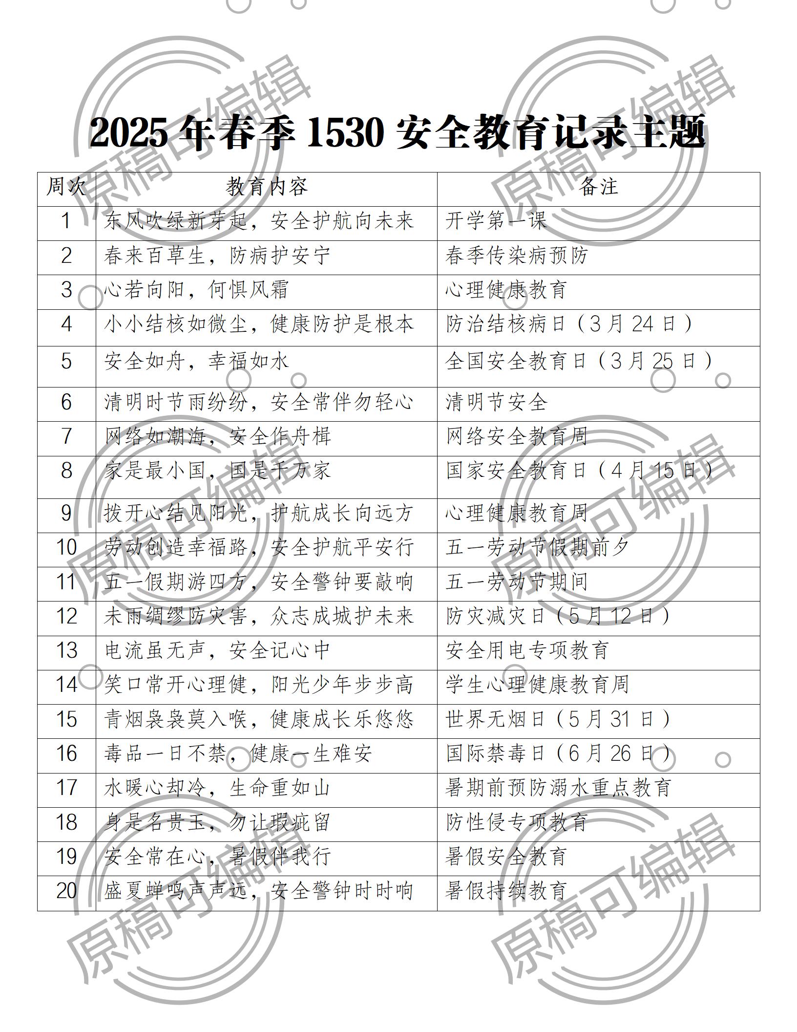 2025年春季1530安全教育主题安排(含20周1530安全教育记录表)