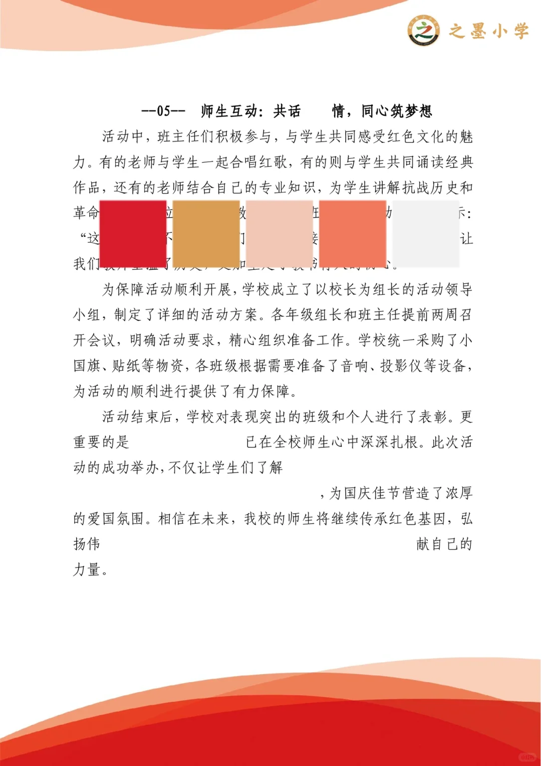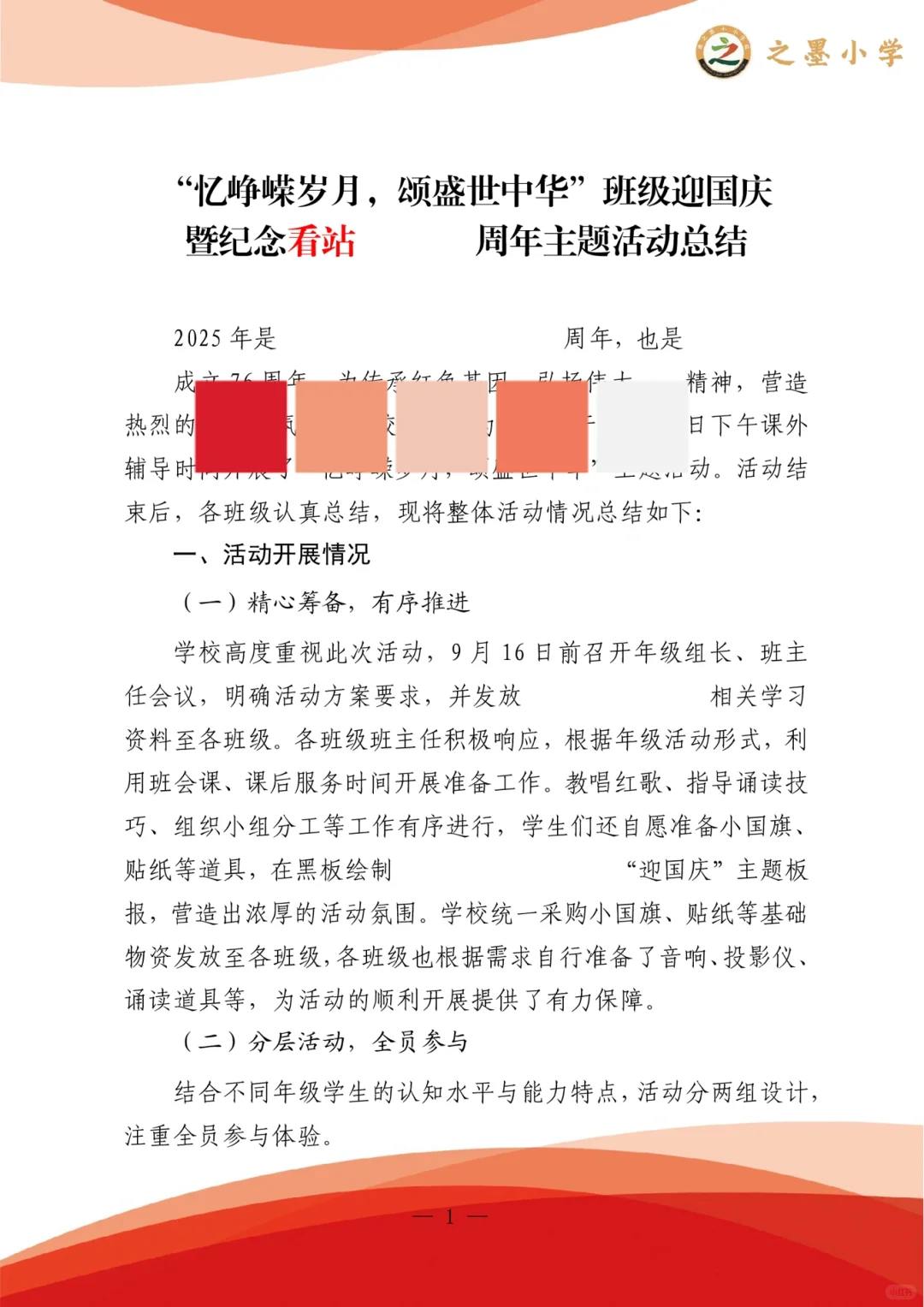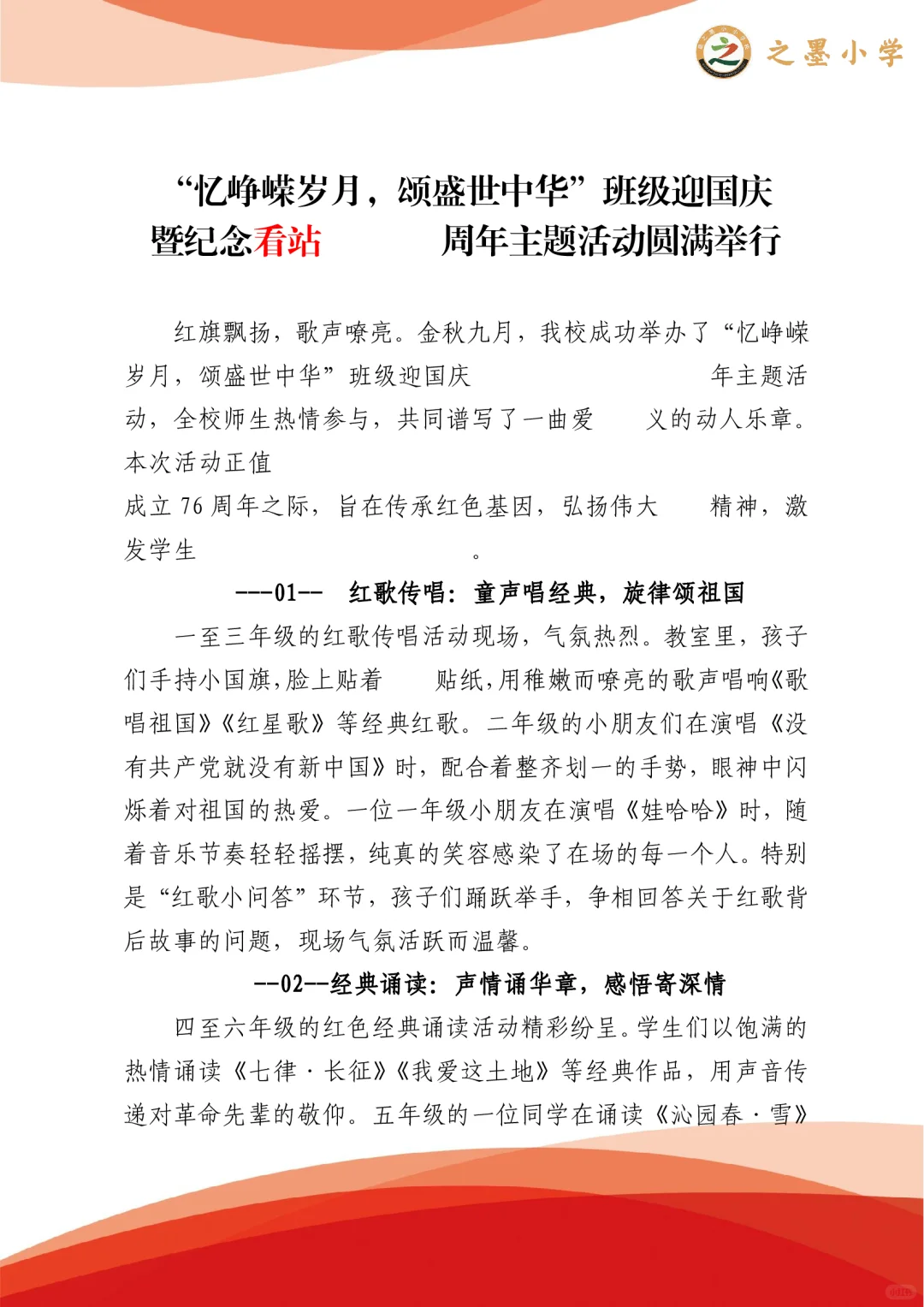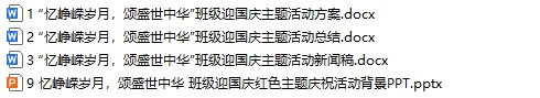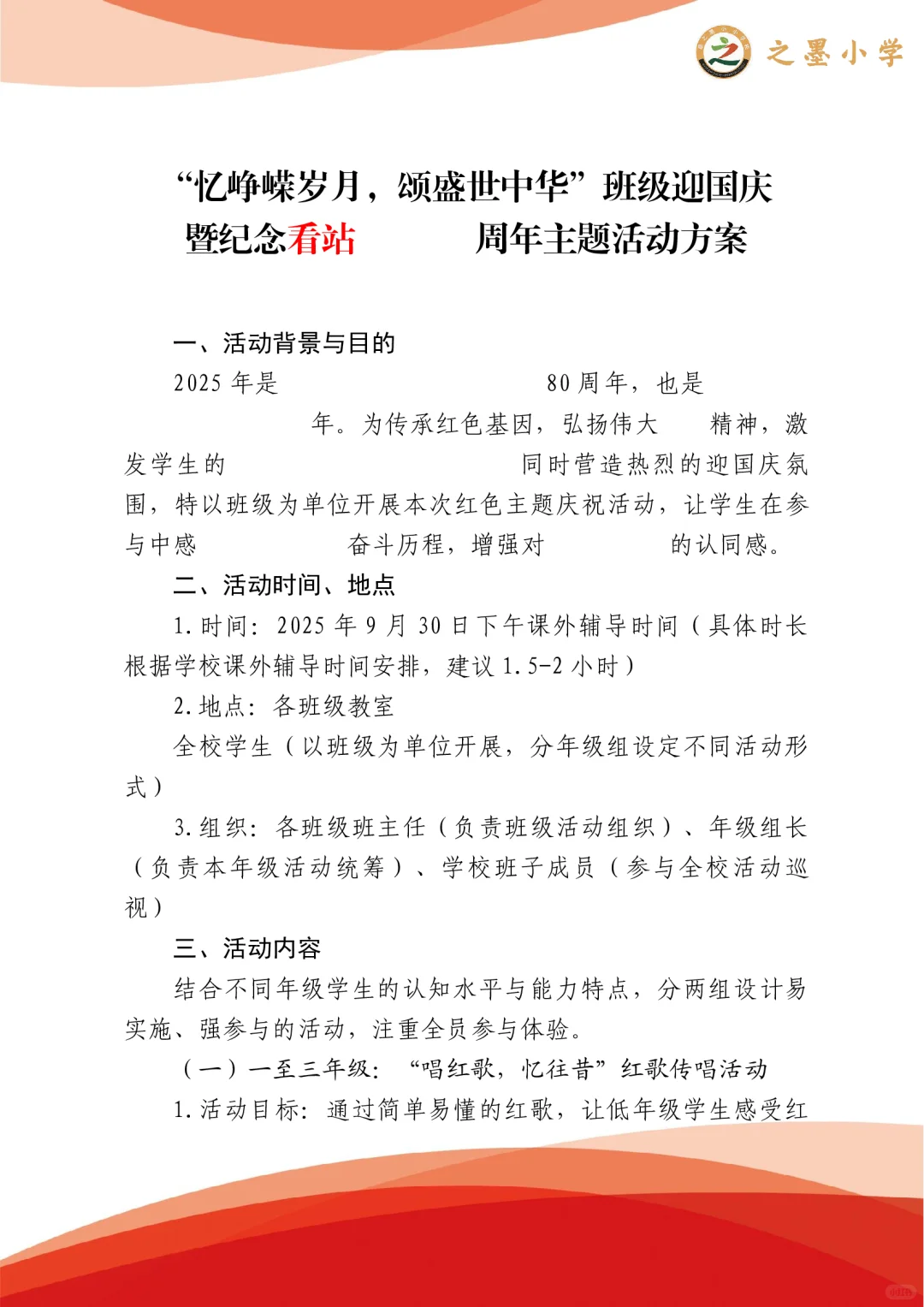 资源简介:“忆峥嵘岁月,颂盛世中华”班级迎国庆主题活动方案 包含配套活动总结,活动新闻稿~还有活动PPT背景模板 2025年国庆节活动方案 2025年国庆学校活动方案 2025年国庆班级活动方案