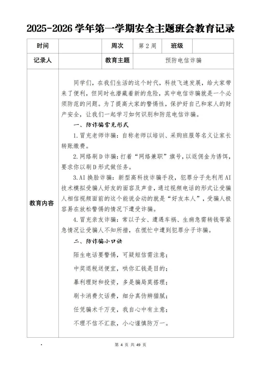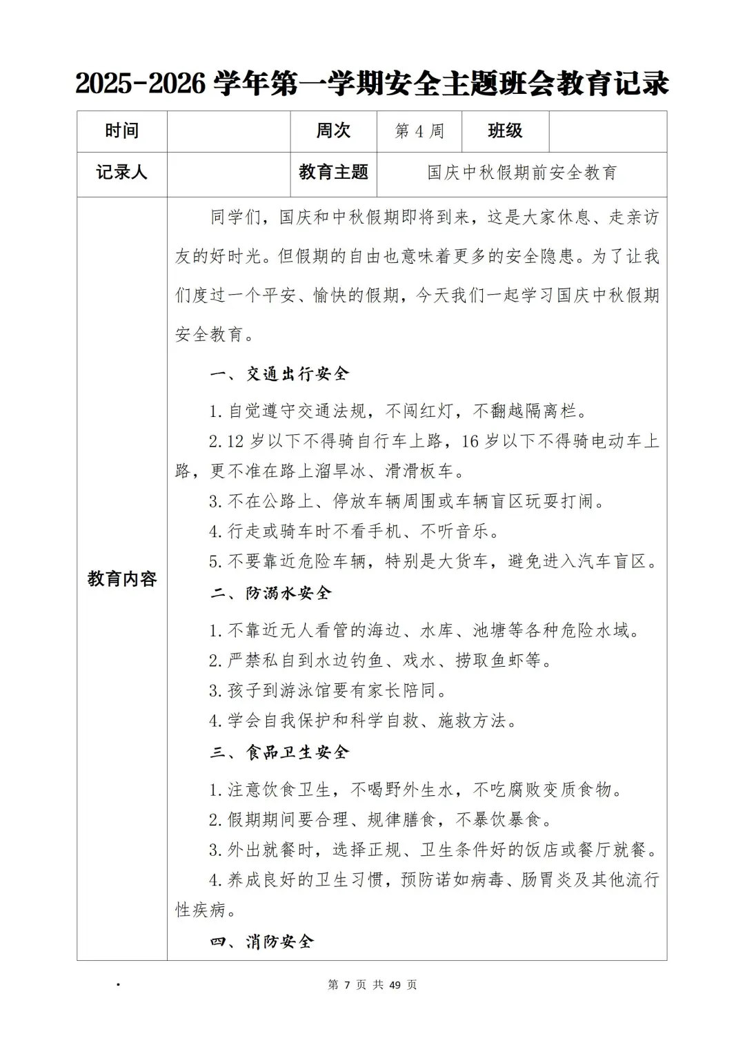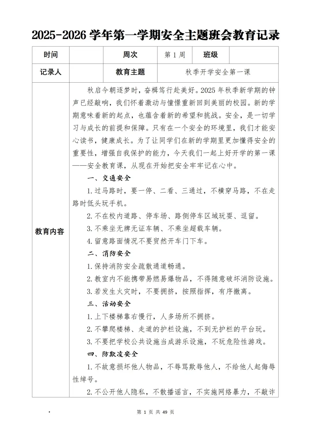 911 2025-2026学年第一学期安全主题班会教育记录(1-22周)——word可比编辑