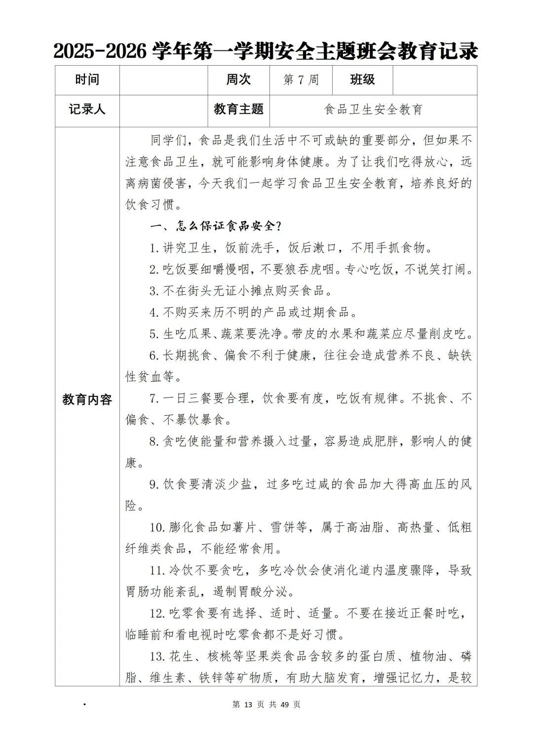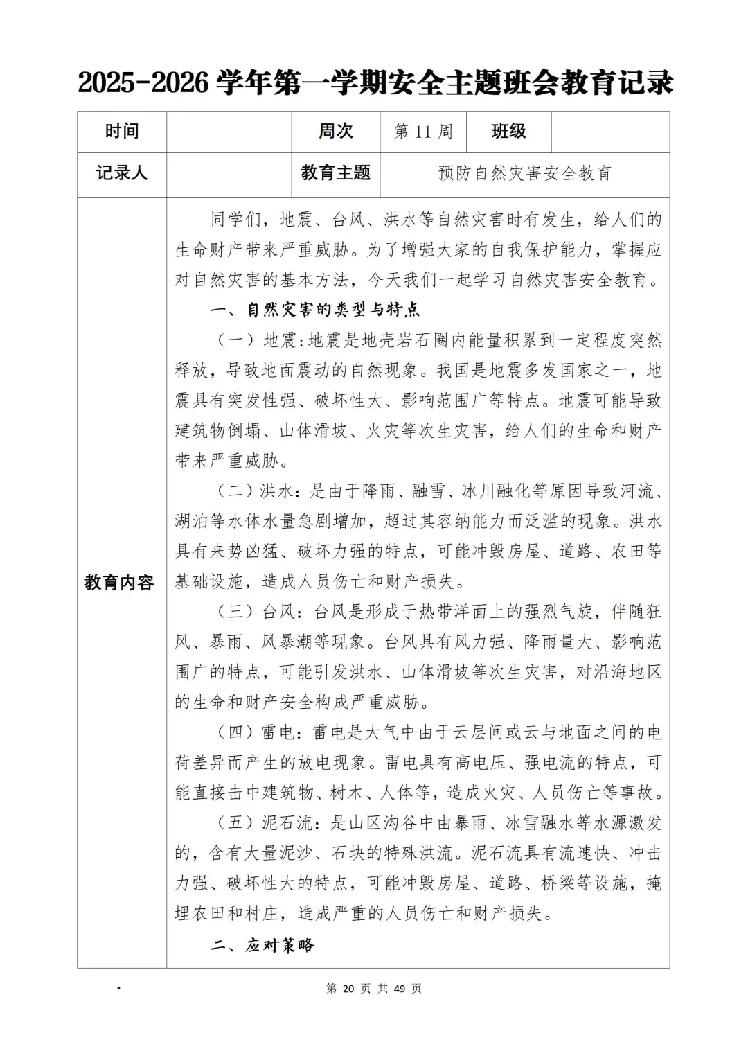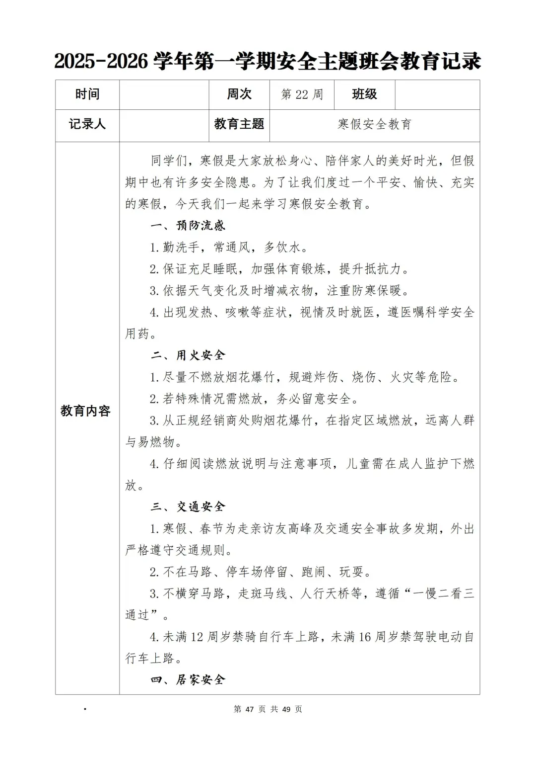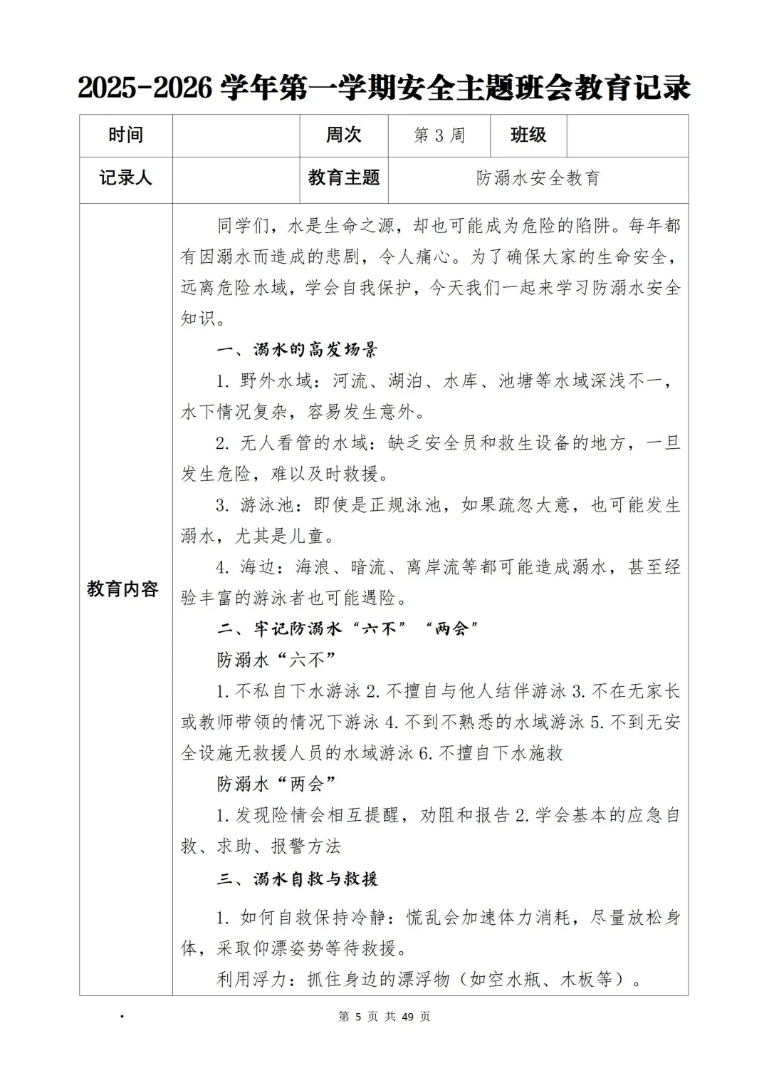 911 2025-2026学年第一学期安全主题班会教育记录(1-22周)——word可比编辑