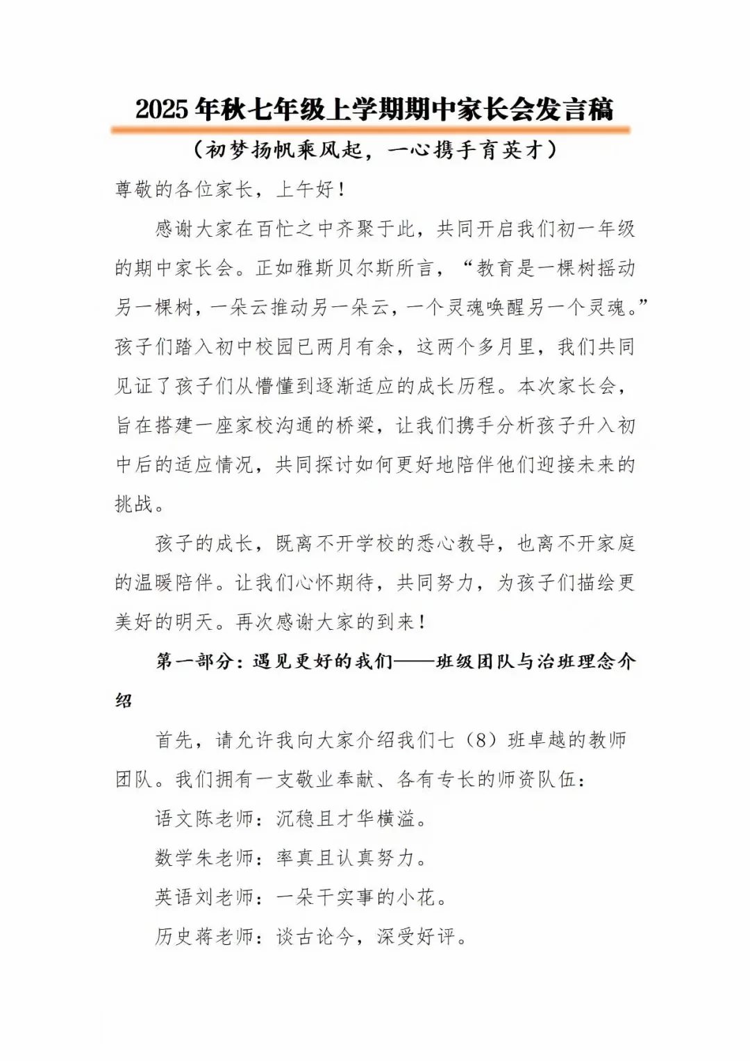 含PPT 逐字稿 1006 七年级上学期期中家长会(初梦扬帆乘风起,一心携手育英才)