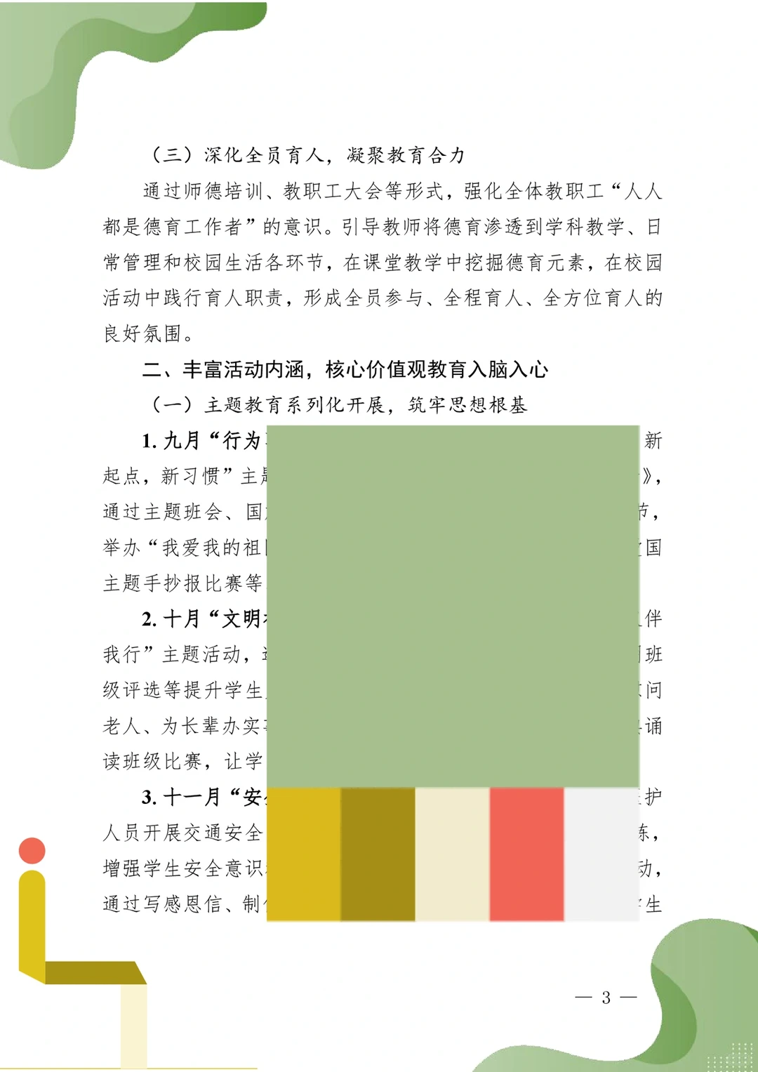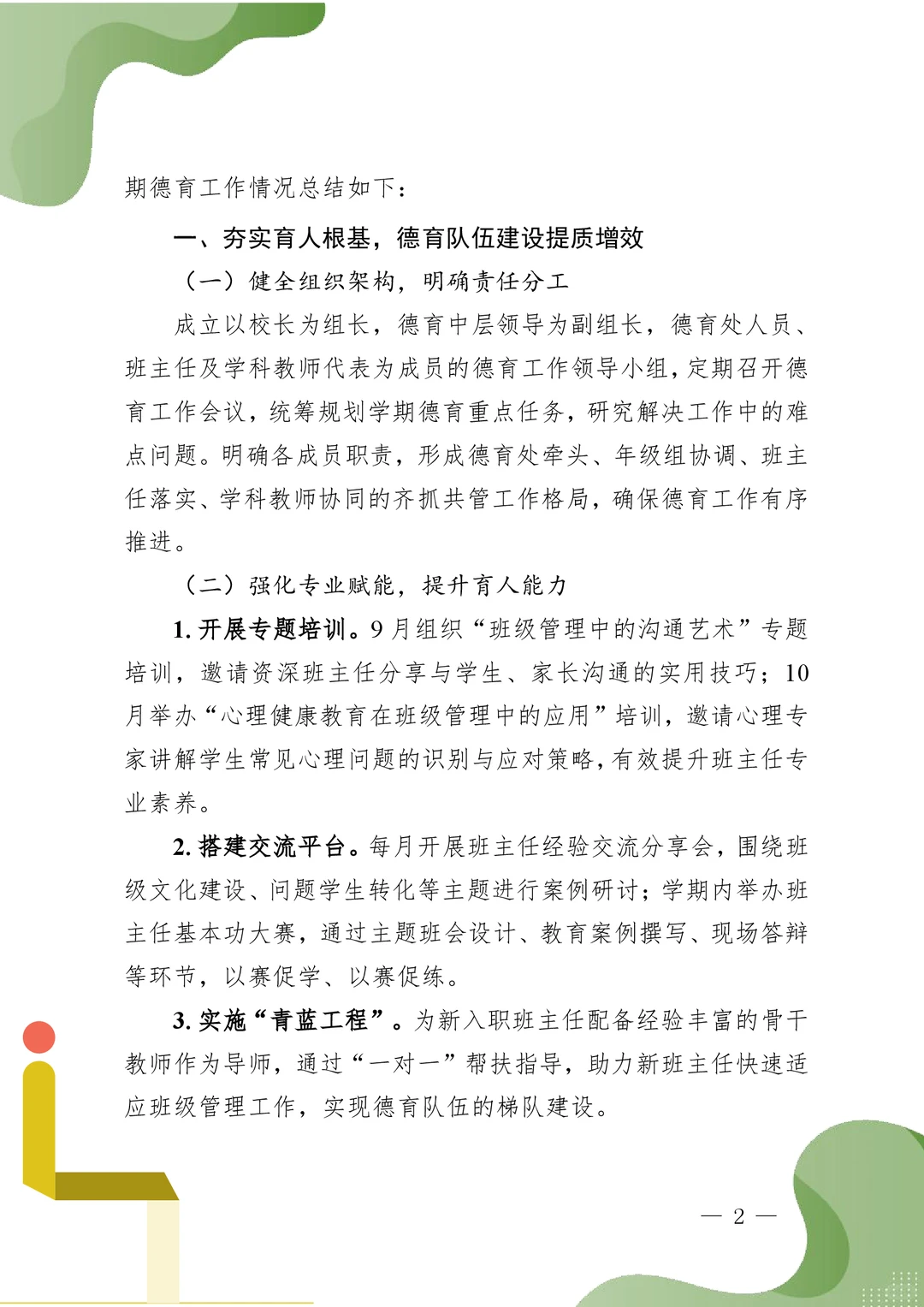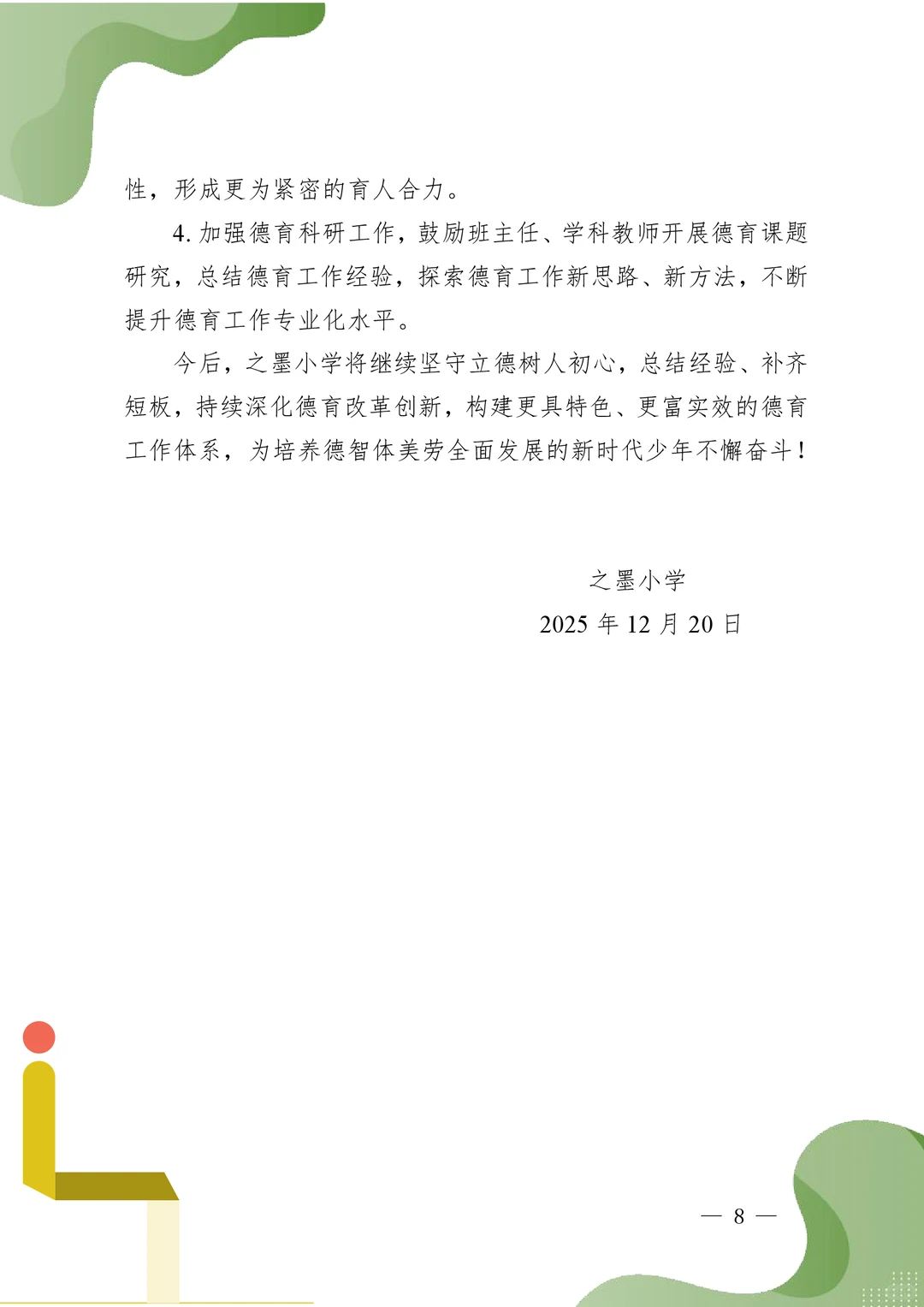 德育为先践初心,深耕细作育桃李 ——2025年秋季之墨小学德育工作总结 一、夯实育人根基,德育队伍建设提质增效 (一)健全组织架构,明确责任分工 (二)强化专业赋能,提升育人能力 (三)深化全员育人,凝聚教育合力 二、丰富活动内涵,核心价值观教育入脑入心 (一)主题教育系列化开展,筑牢思想根基 (二)特色活动品牌化打造,彰显学校风采 (三)仪式教育规范化推进,强化价值引领 三、聚焦身心健康,成长护