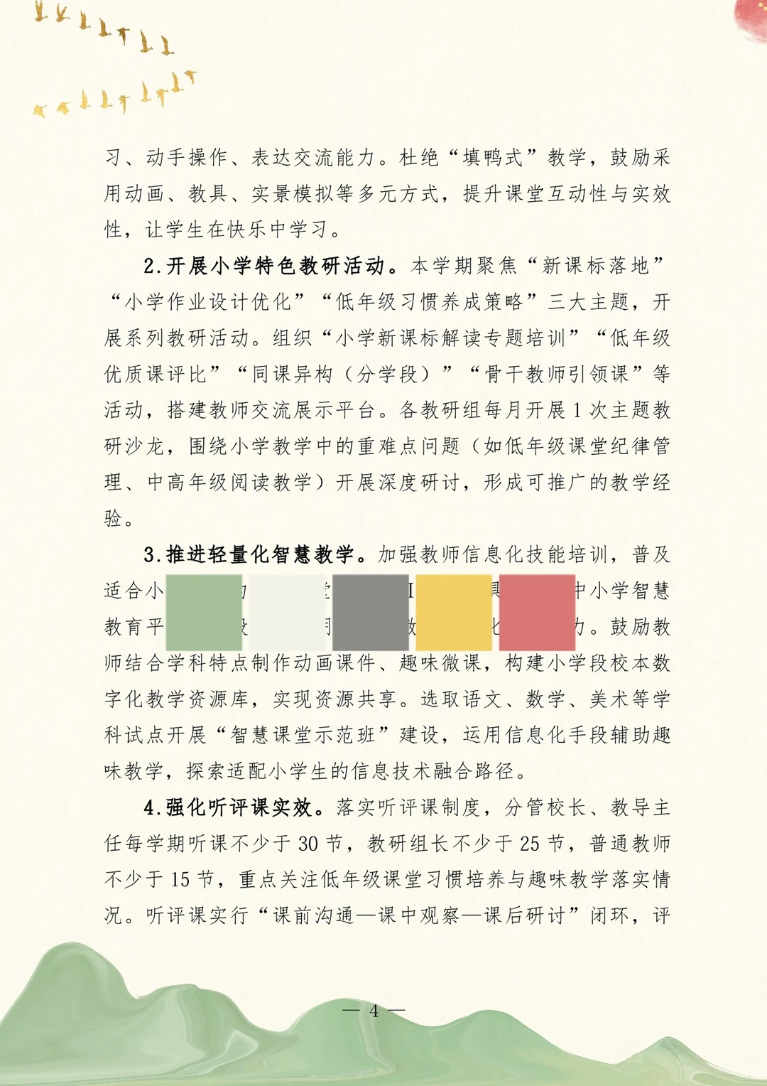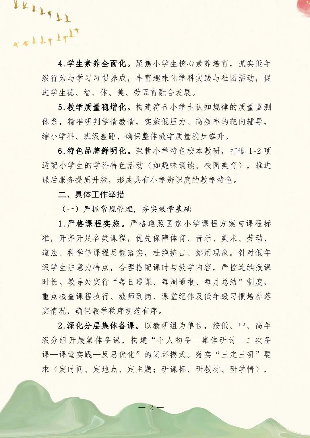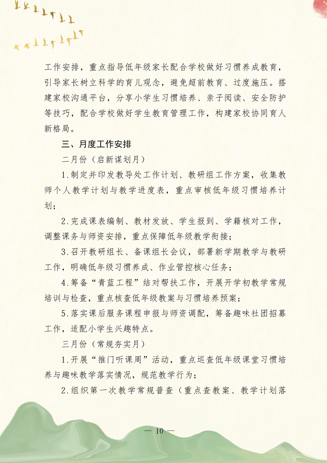 2026年春季教导处工作计划 2025-2026学年第二学期小学教导处工作计划 一、核心工作目标 二、具体工作举措 (一)严抓常规管理,夯实教学基础 (二)深耕课堂改革,激活教学动能 (三)优化作业辅导,落实减负提质 (四)聚焦师资培育,夯实发展支撑 (五)丰富育人载体,促进全面发展 (六)强化质量监测,精准推进提升 (七)优化服务保障,完善支撑体系 三、月度工作安排 教务工作计划~含月工作安排
