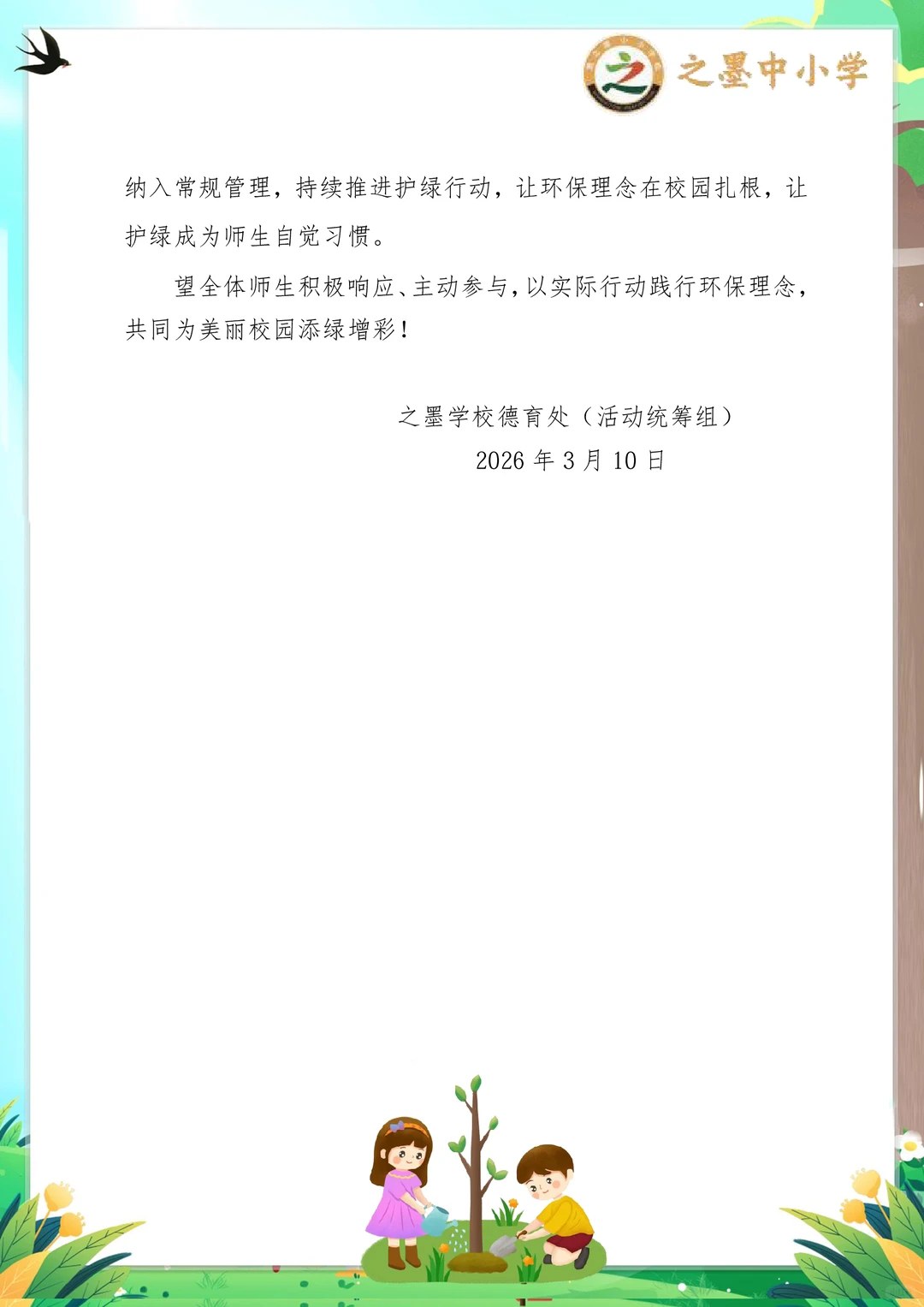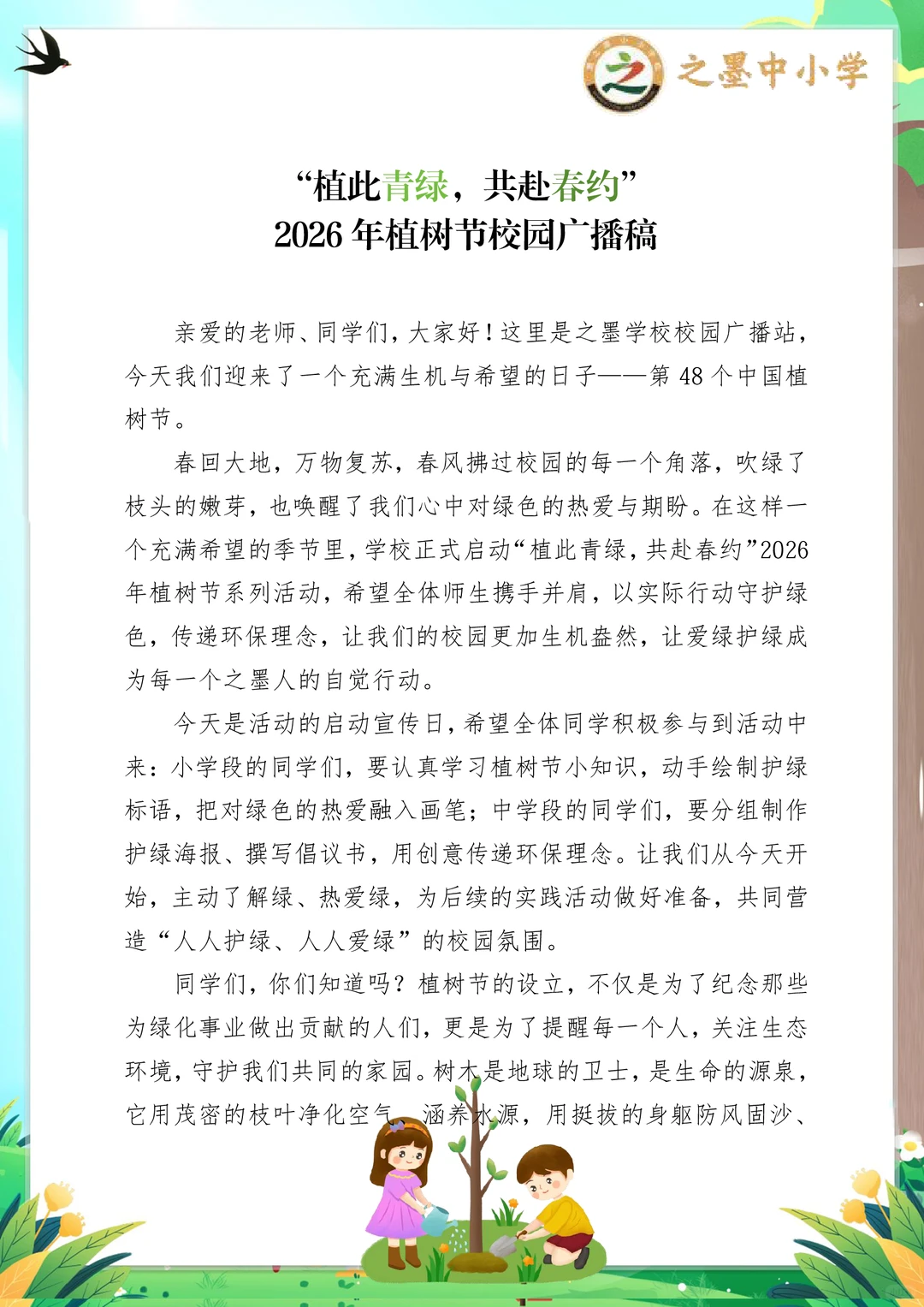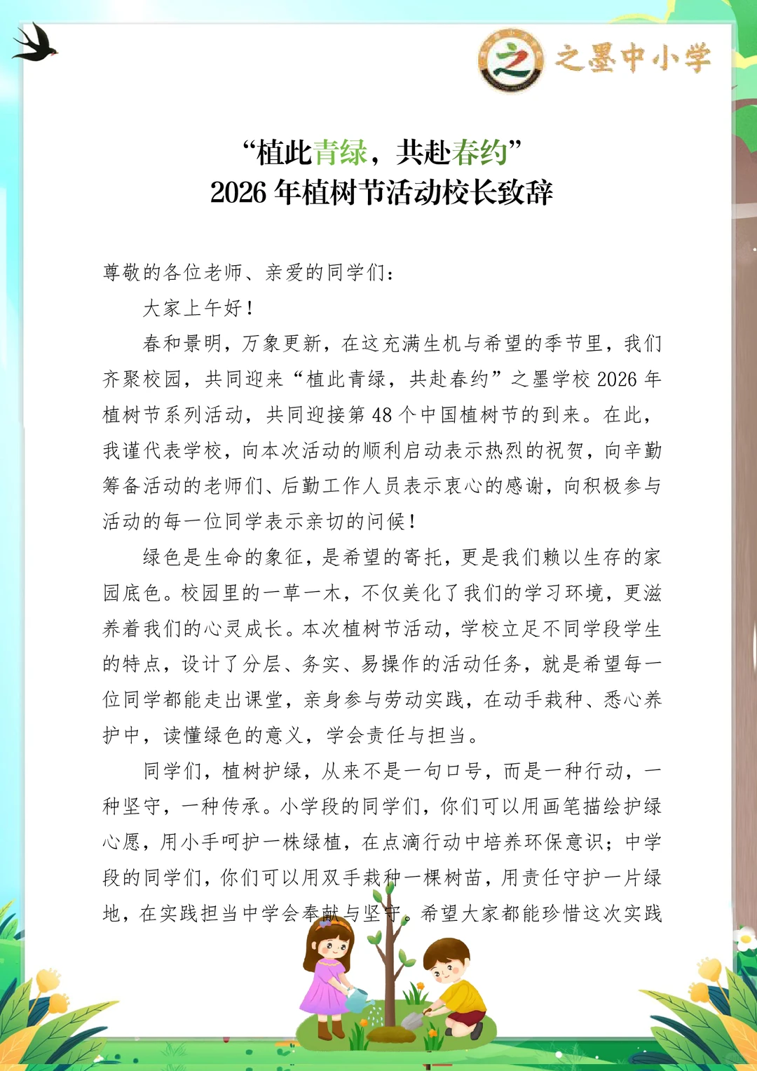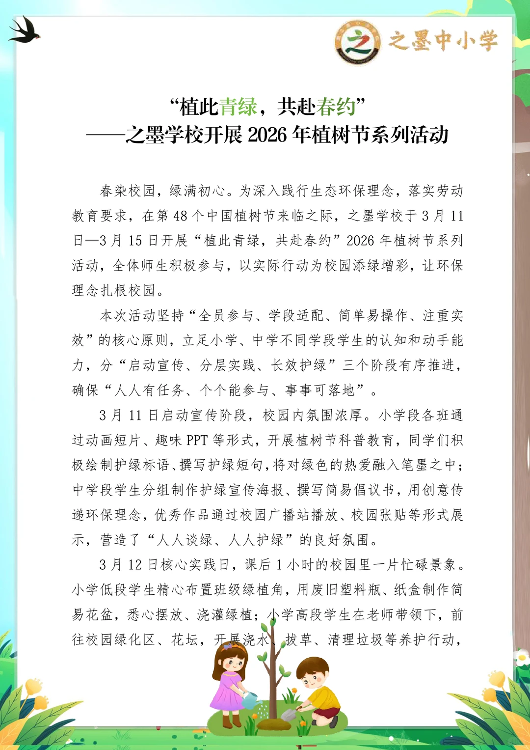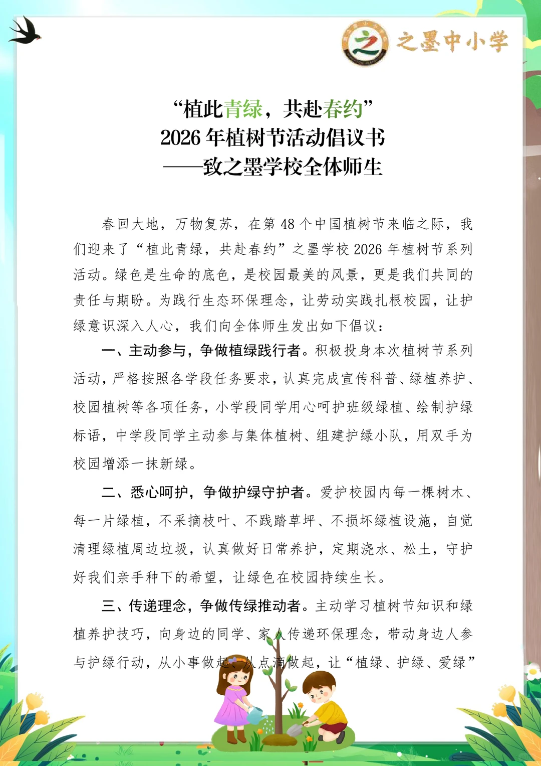 之墨校园|植此青绿,共赴一场春日的绿色约定 第48个中国植树节 之墨学校“植此青绿,共赴春约”活动,是全员参与的绿色盛宴,氛围感直接拉满! 没有复杂流程,没有额外负担,人人都参与其中 小学段:画护绿标语、布置班级绿植角,用小手呵护一株小苗,解锁劳动小成就~ 中学段:集体植树、组建护绿小队,为校园添新绿,还能当小老师指导低年级同学,责任值拉满! 从3.11启动宣传,