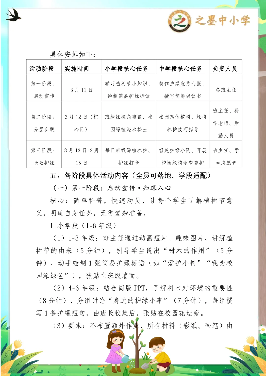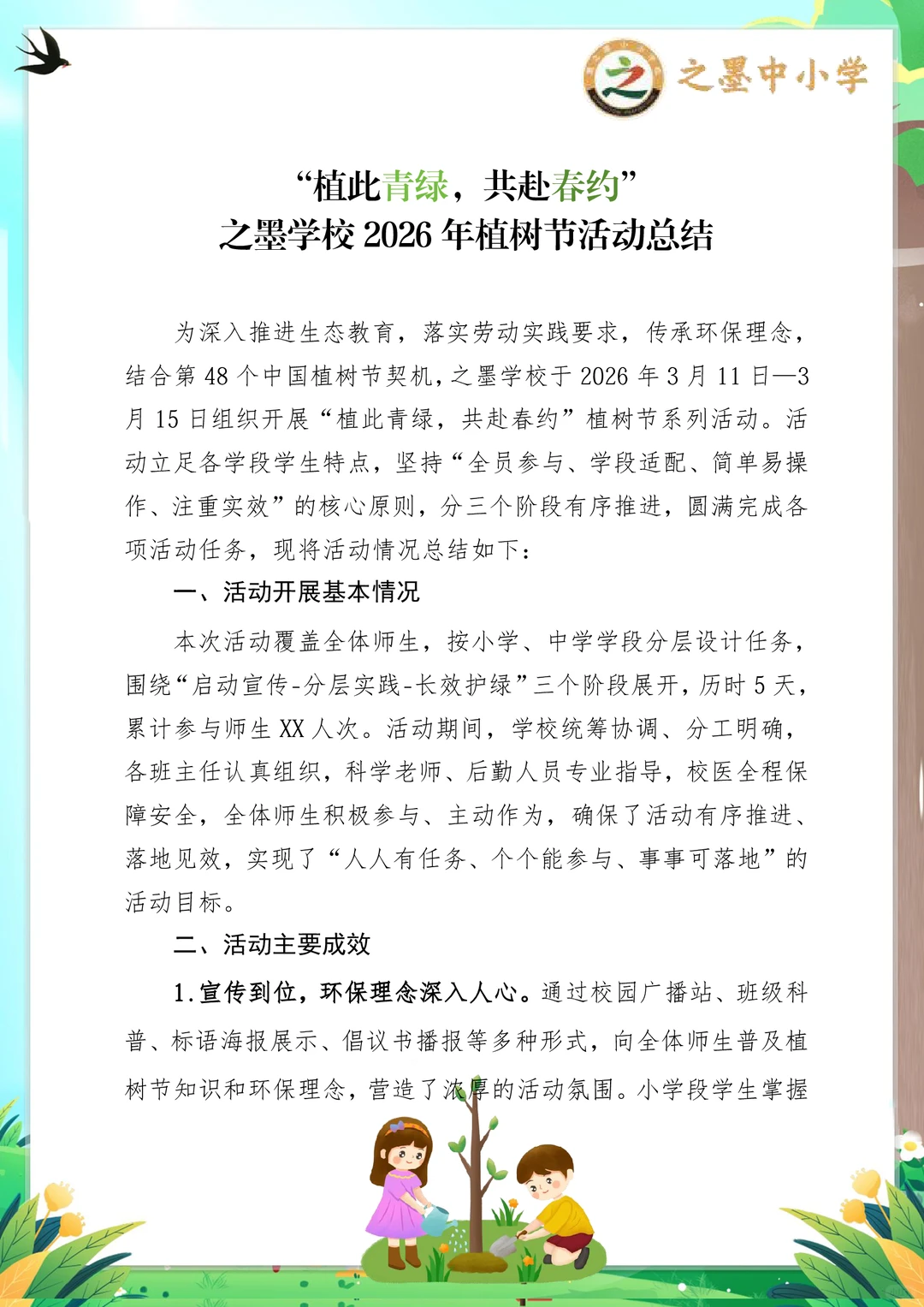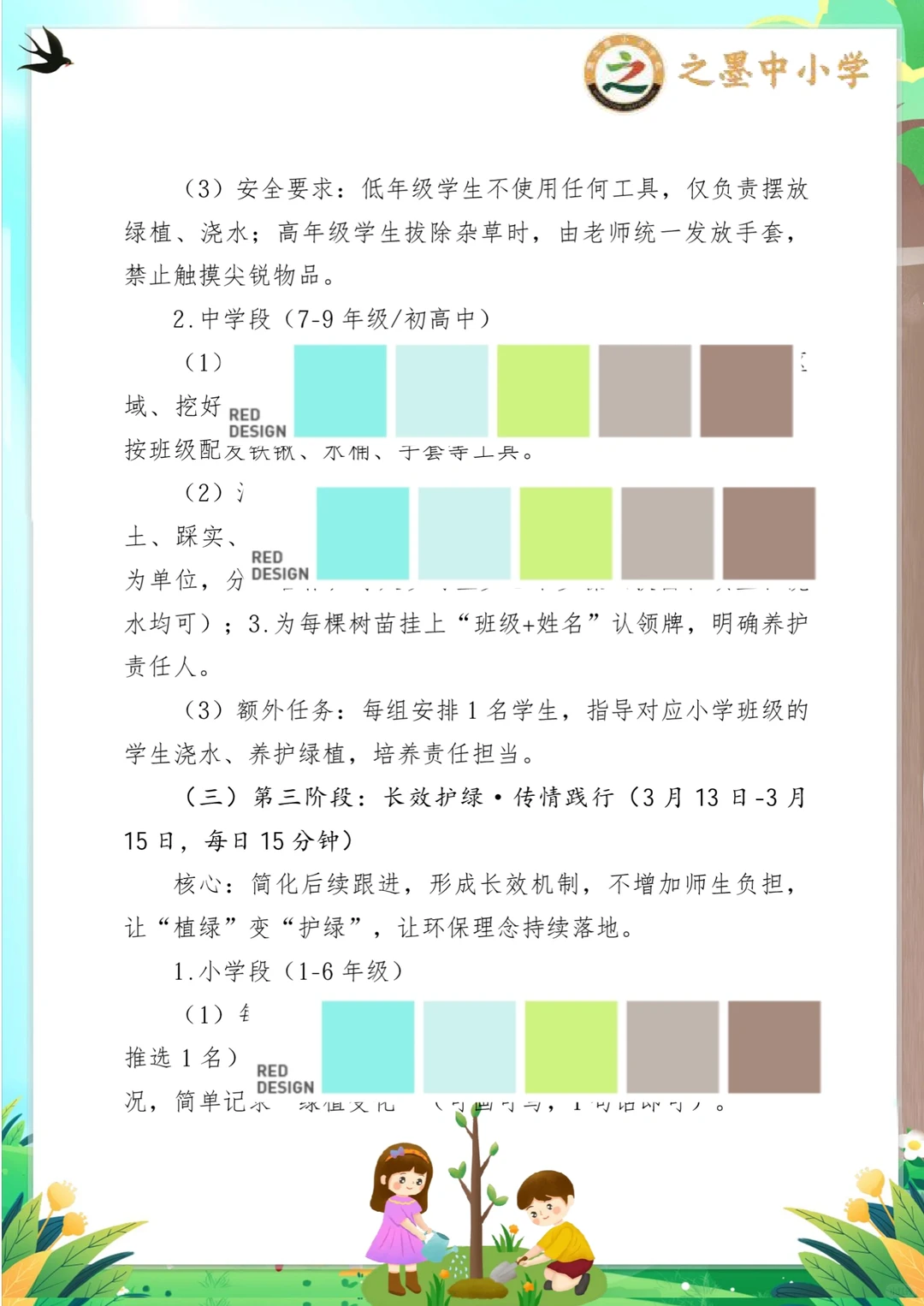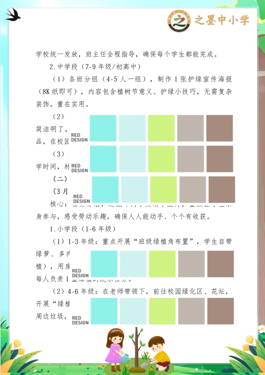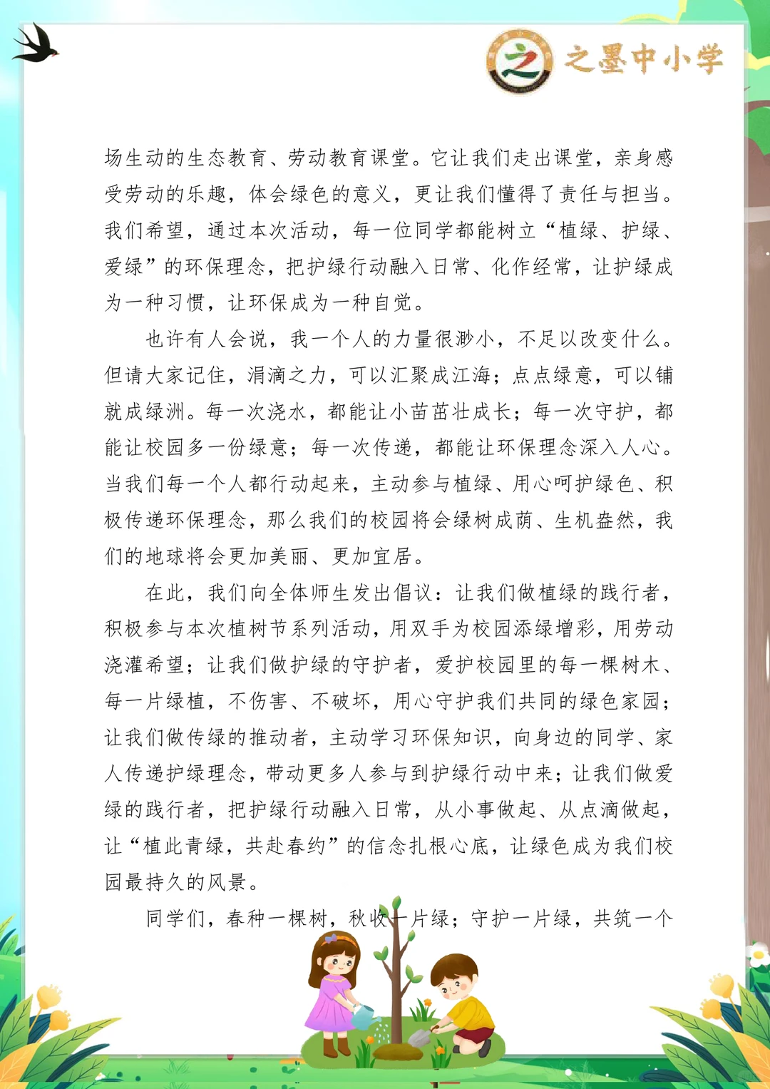 之墨校园|植此青绿,共赴一场春日的绿色约定 第48个中国植树节 之墨学校“植此青绿,共赴春约”活动,是全员参与的绿色盛宴,氛围感直接拉满! 没有复杂流程,没有额外负担,人人都参与其中 小学段:画护绿标语、布置班级绿植角,用小手呵护一株小苗,解锁劳动小成就~ 中学段:集体植树、组建护绿小队,为校园添新绿,还能当小老师指导低年级同学,责任值拉满! 从3.11启动宣传,