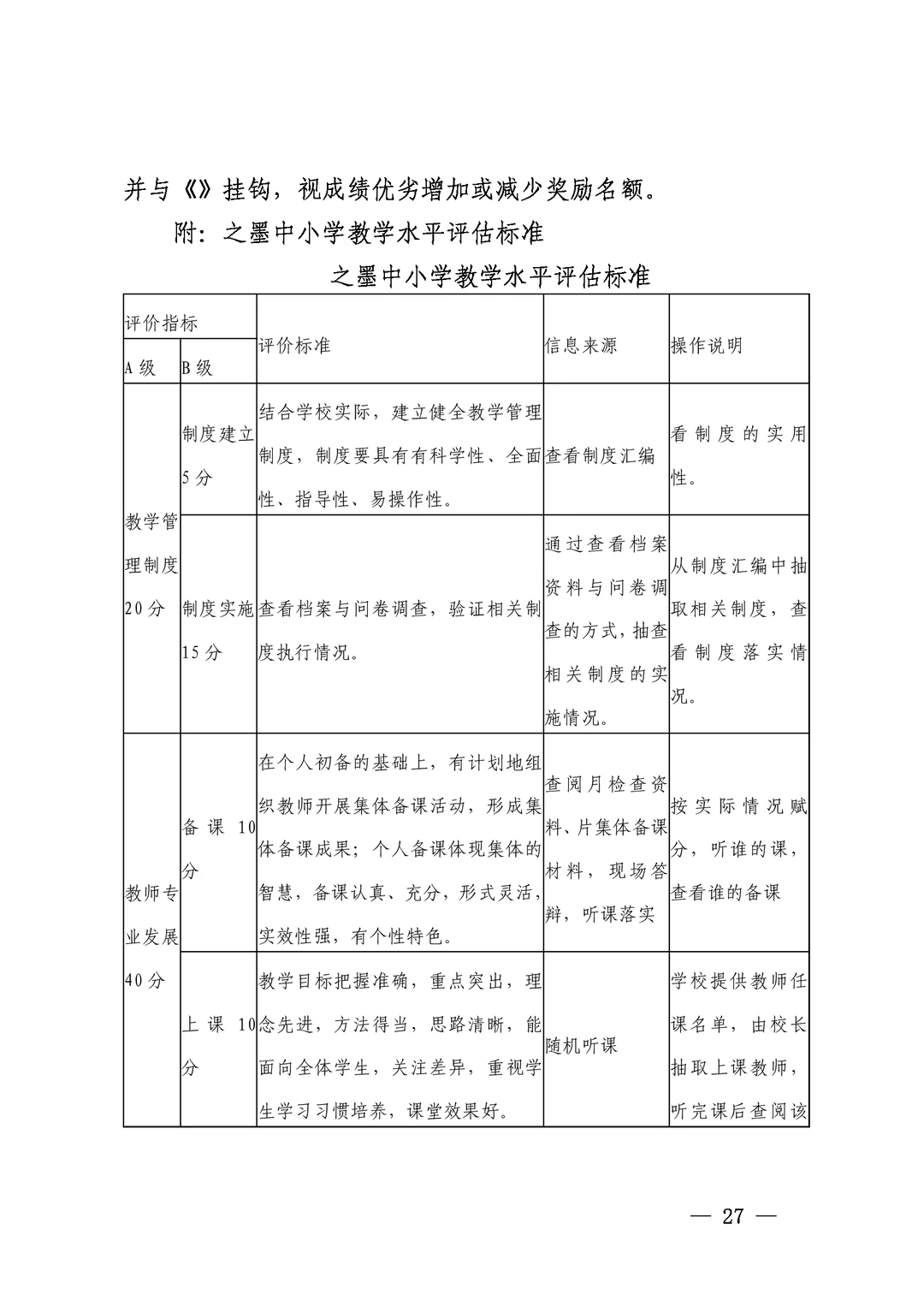 之墨中小学教学管理制度汇编20项制度汇编 共78页 教务管理制度汇编 目录如下 教学常规管理制度 教师备课条例 课堂教学质量评价细则 教学档案管理制度 关于教研组活动的有关要求 教育科学研究课题管理办法 教育教学论文管理办法 教学水平评估管理办法 教干教师学习制度 教学常规基本要求 备课规范化要求 课堂教学规范化要求 作业规范化要求 学生技能测试方案 教学过程监控制度 教学反思制度 课外实践活动制