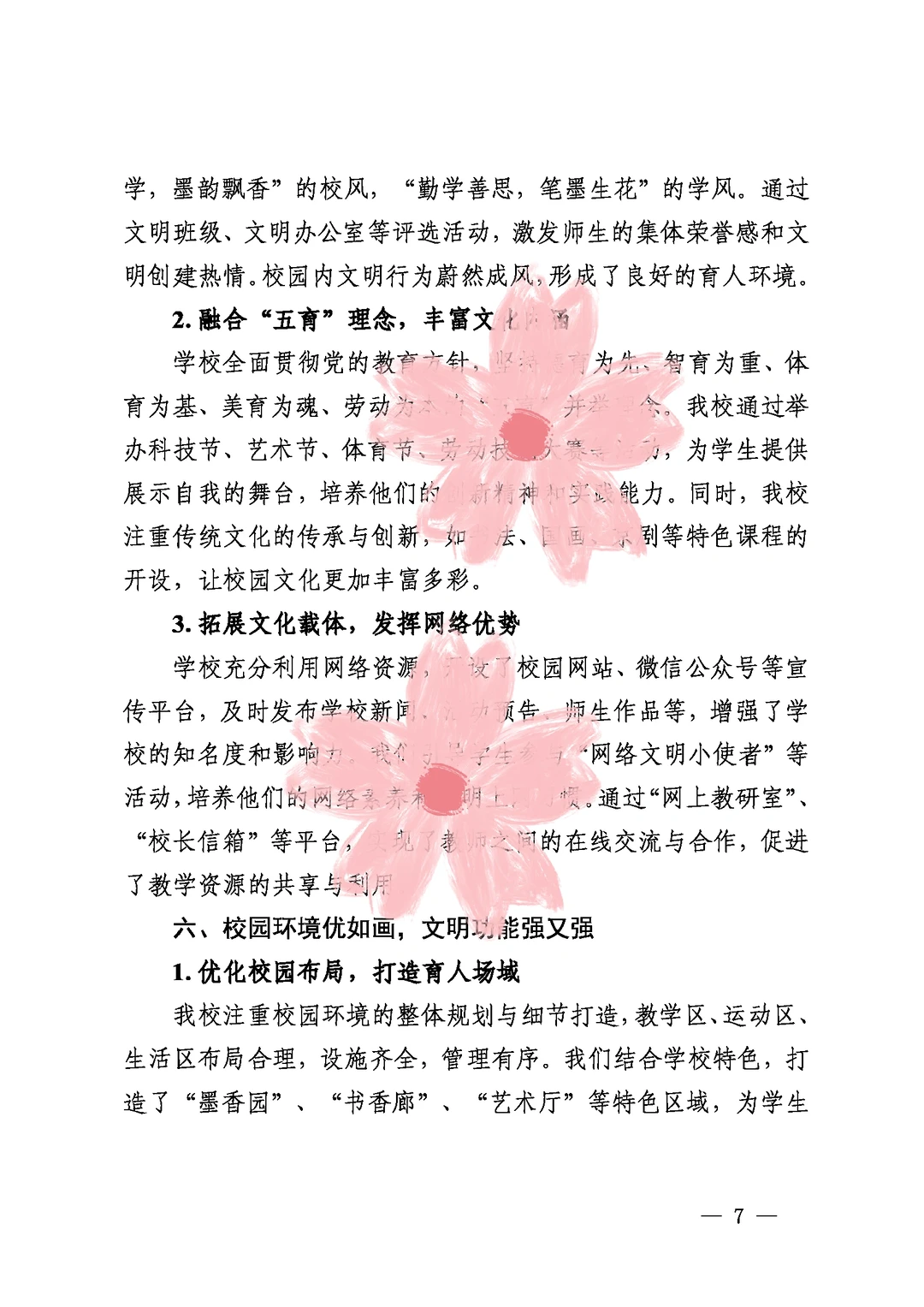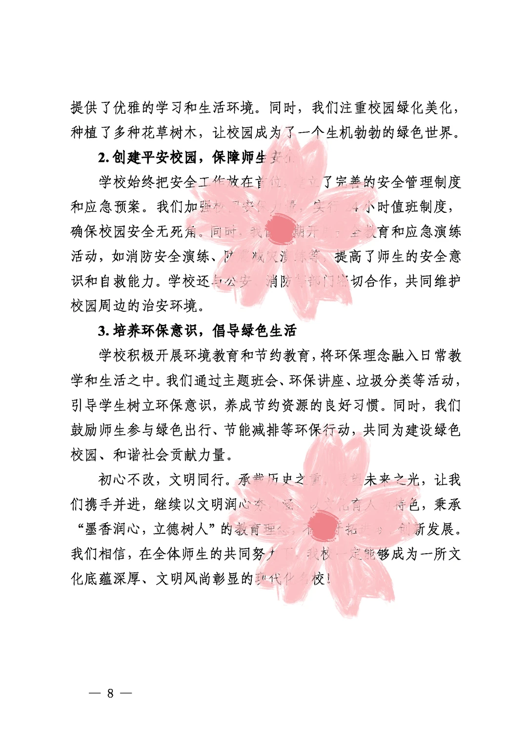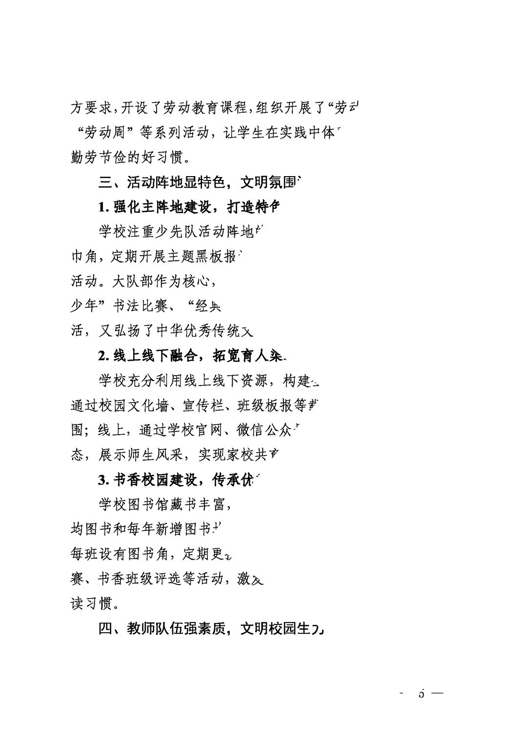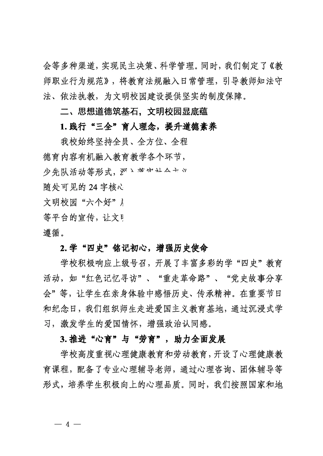 文明深耕心田,文化孕育英才 ——之墨小学创文明校园工作汇报 创建文明校园工作汇报 文明校园工作总结 (备用大标题:以德润身 以文化人 全文三千字) 一、引言 学校简介及教育理念 二、领导班子强引领,文明风尚树标杆 1.打造坚强党组织,深化教育情怀 2.依法依规办学,完善管理体系 三、思想道德筑基石,文明校园显底蕴 1.践行“三全”育人理念,提升道德素养 2.学“四史”铭记初心,增强历史使命