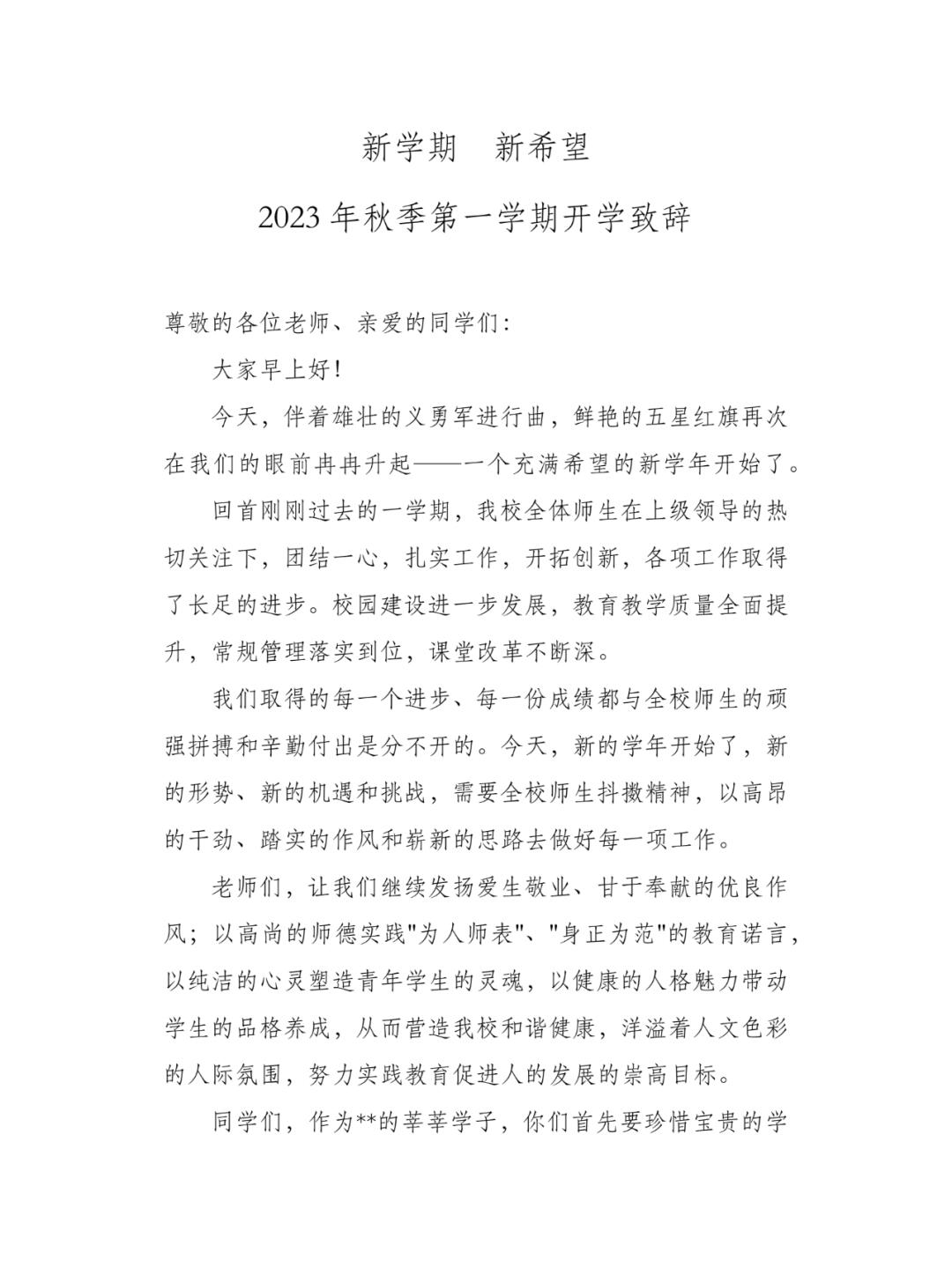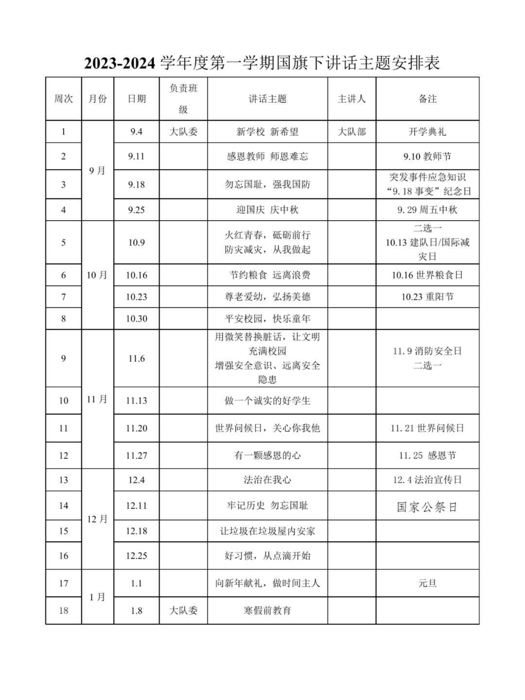 2023年秋季第一学期国旗下讲话稿工作安排表