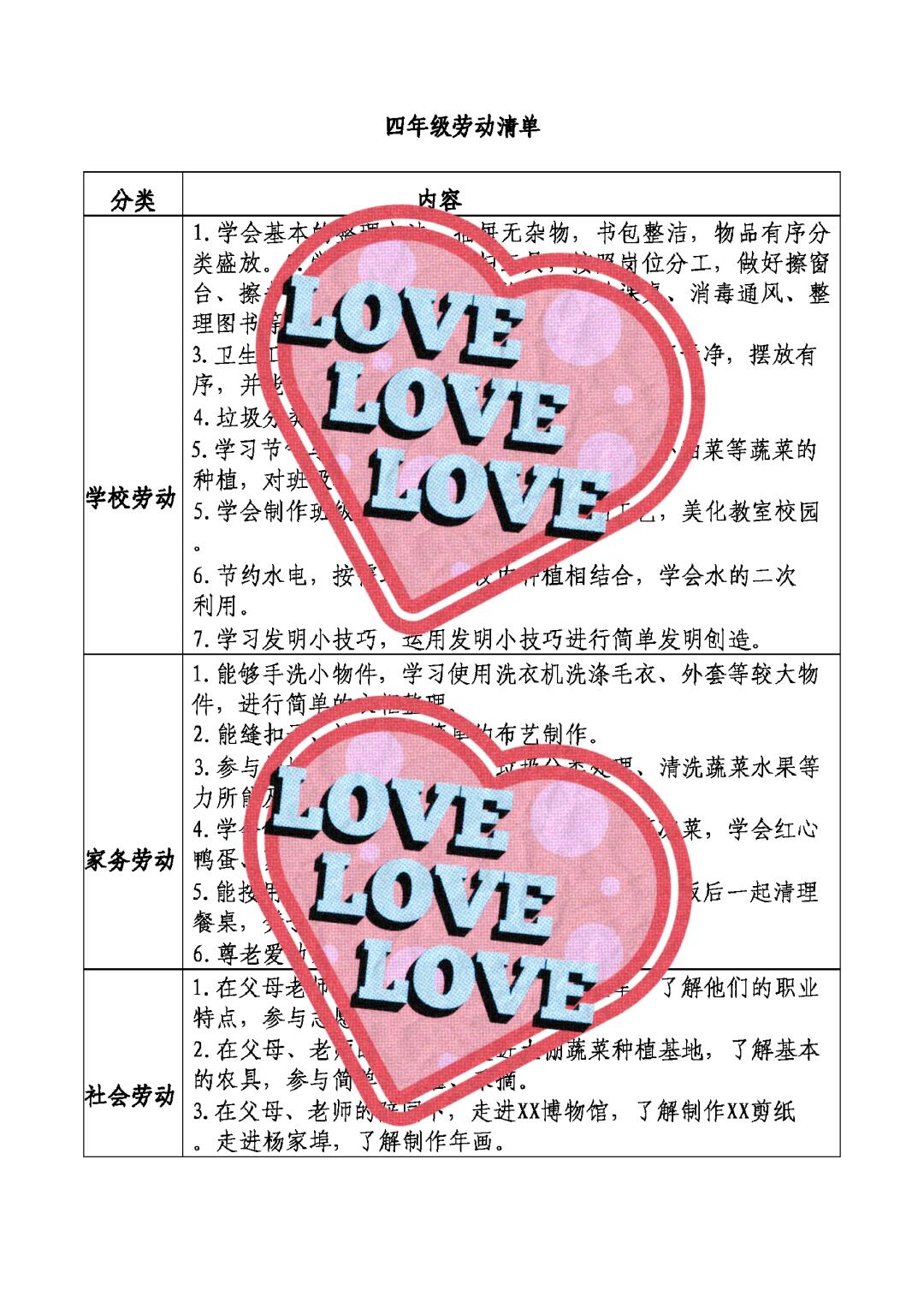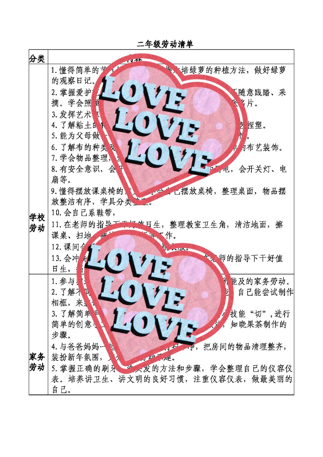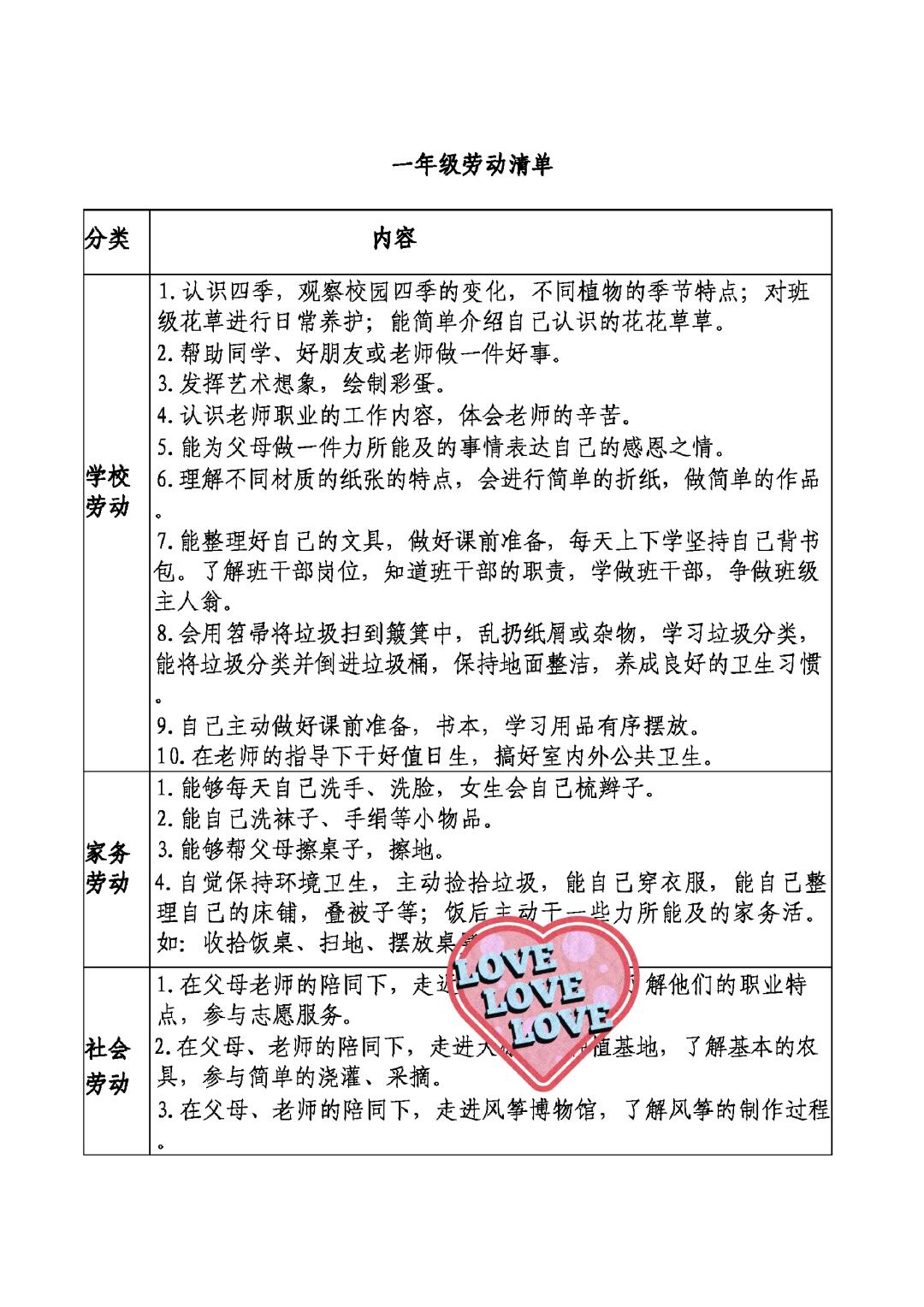 > 小学分年级分种类劳动任务清单