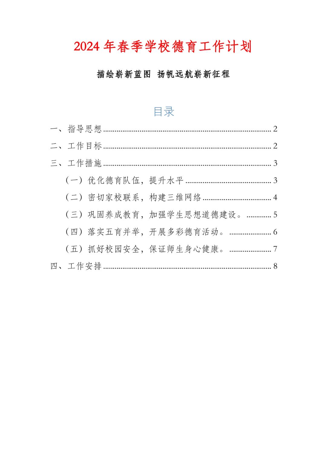 2024春季学校德育工作计划安排