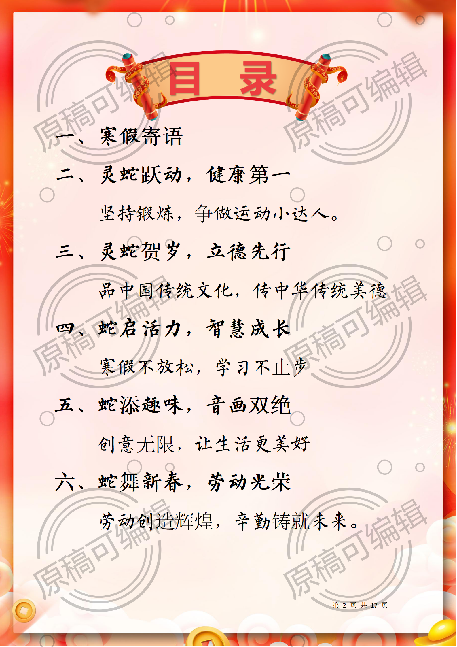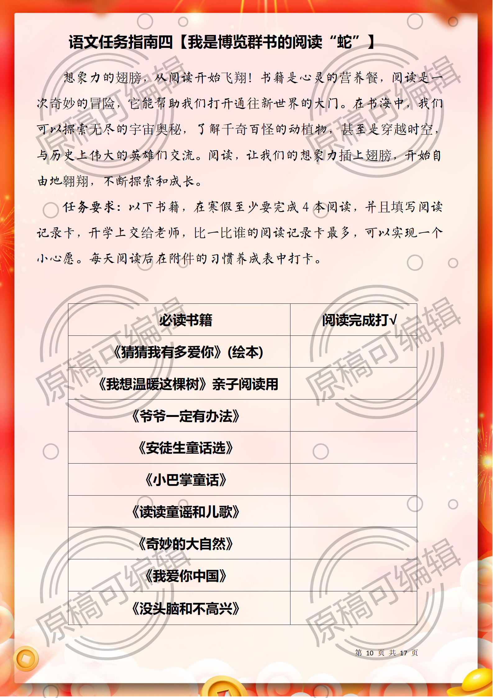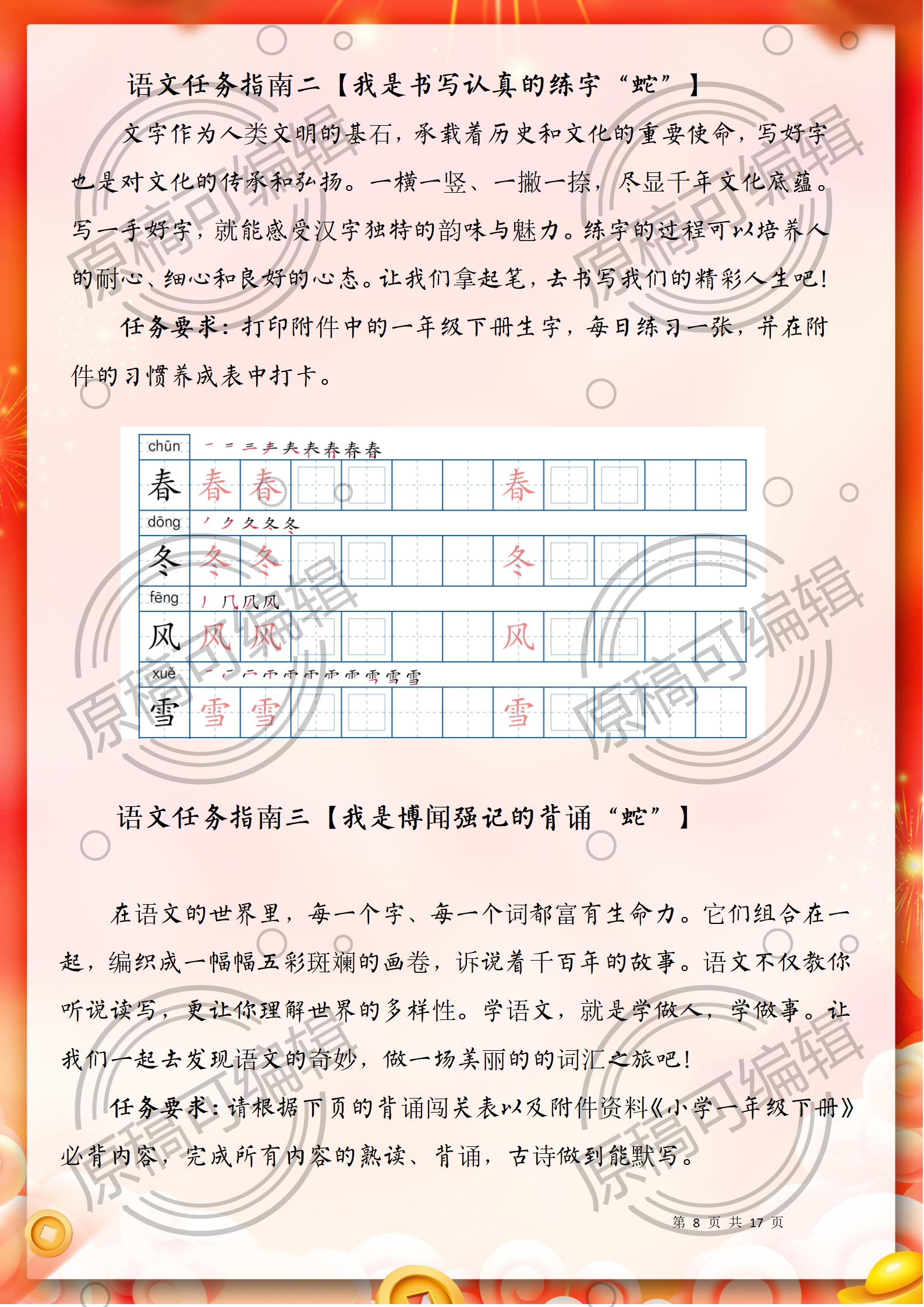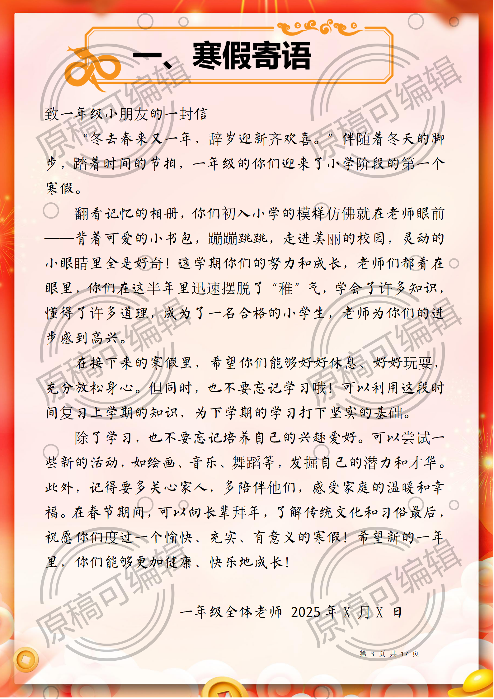 资源简介:含文稿+PPT26 2025年寒假一年级全学科寒假作业17页