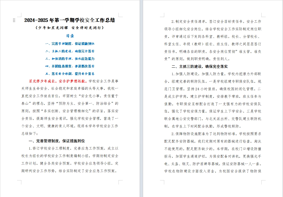 > 112 少年如星光闪耀 安全伴时光同行2024-2025年第一学期学校安全工作总结述职报告