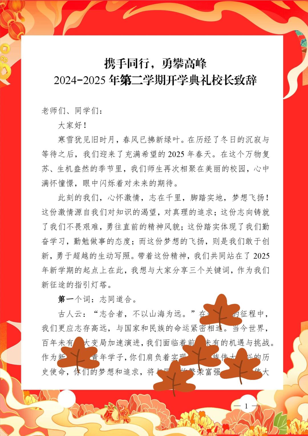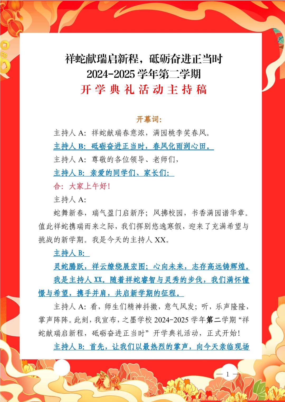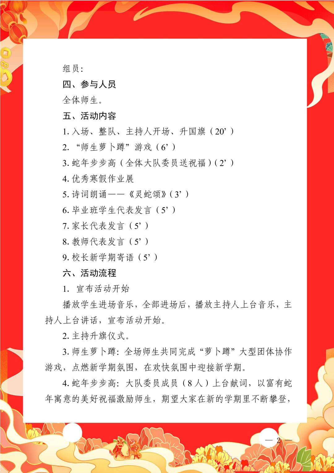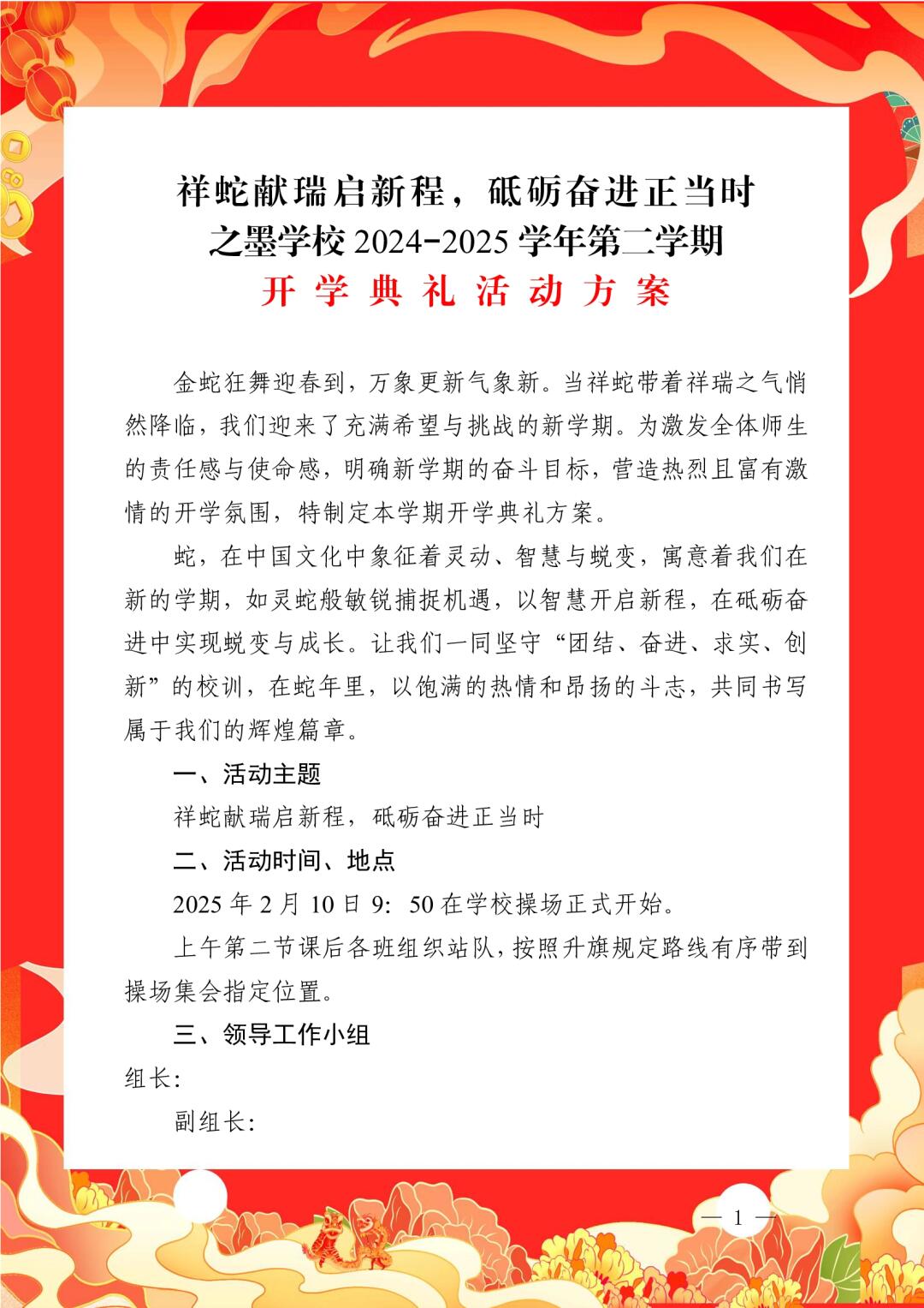 > 祥蛇献瑞启新程,砥砺奋进正当时 2024-2025学年第二学期开学典礼全套