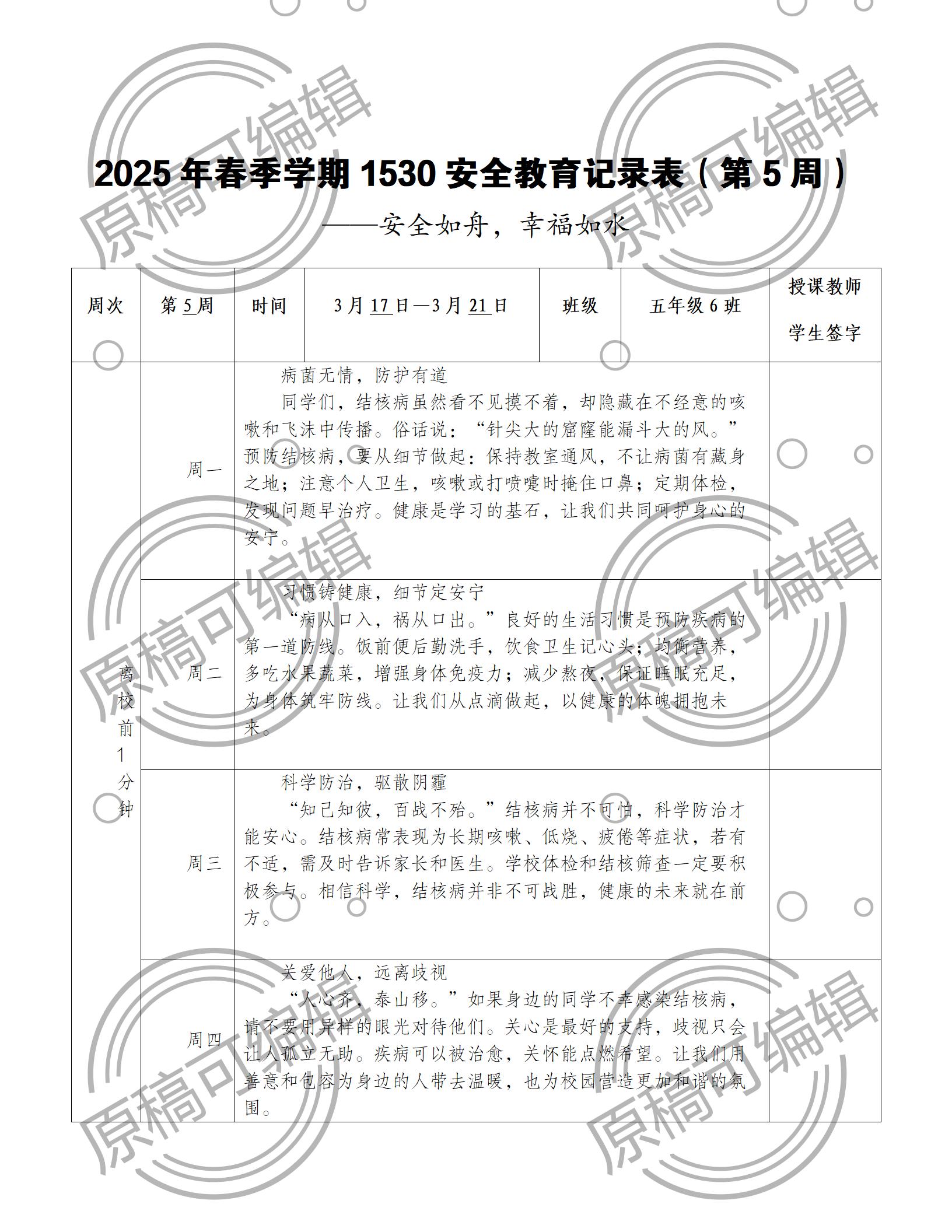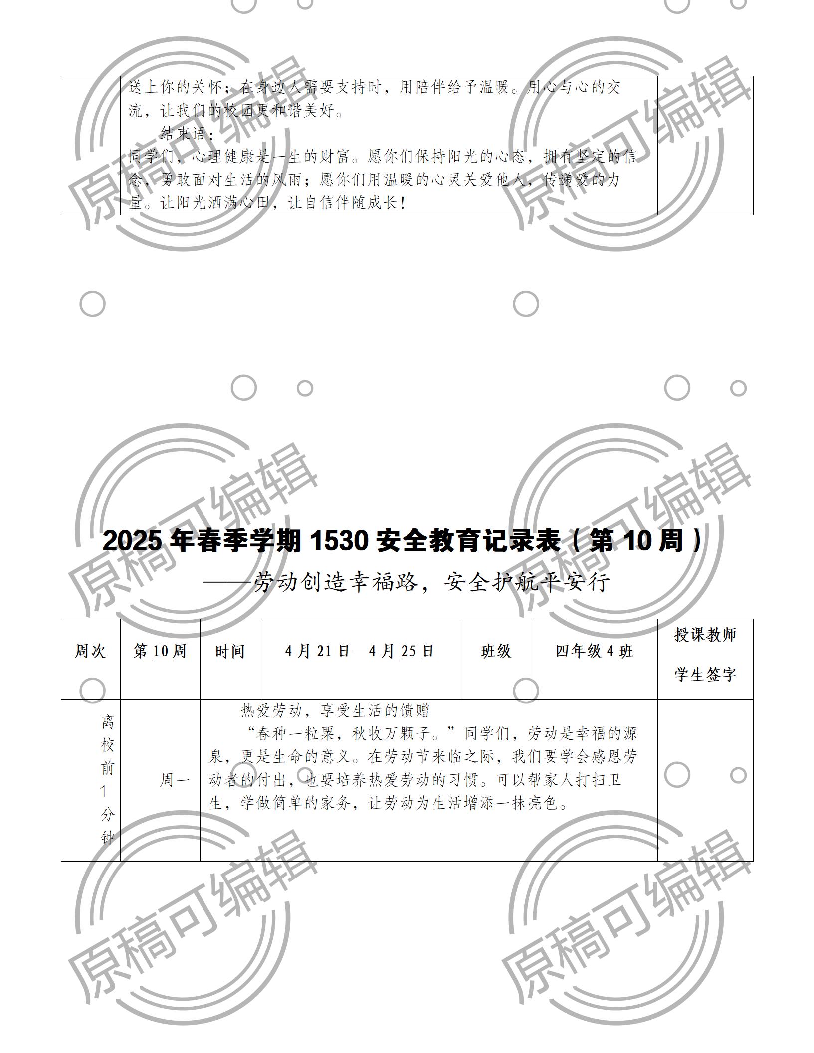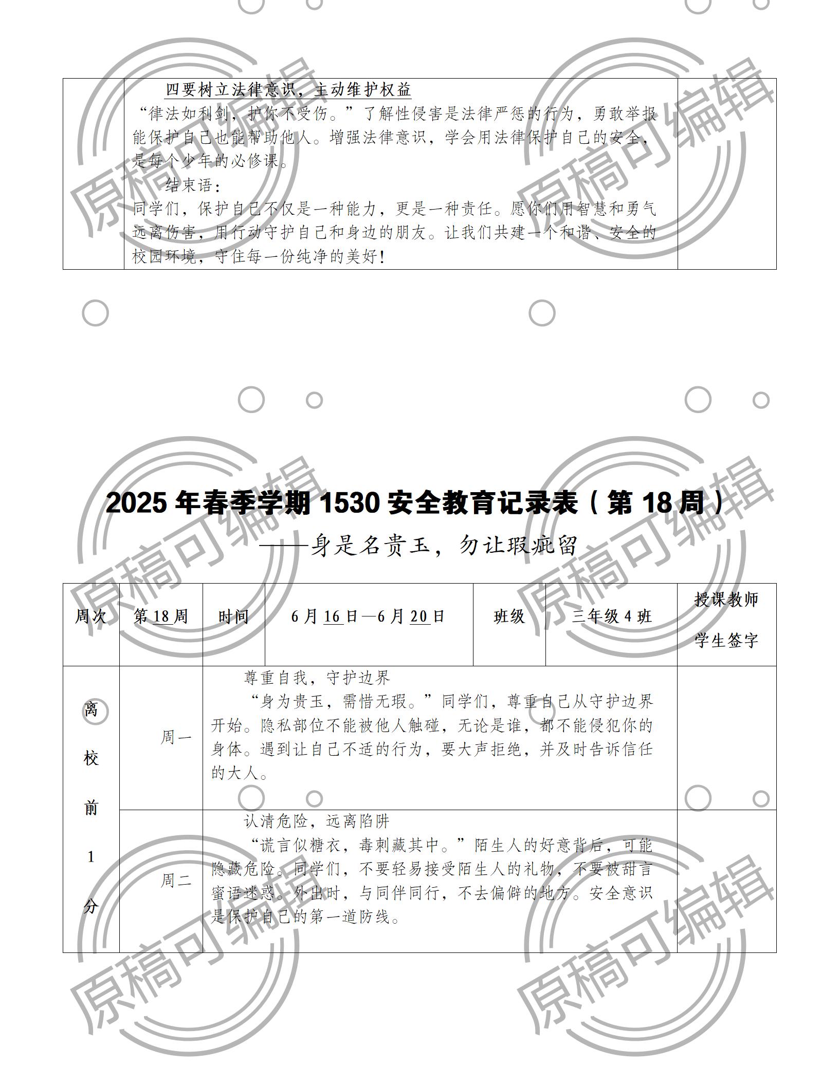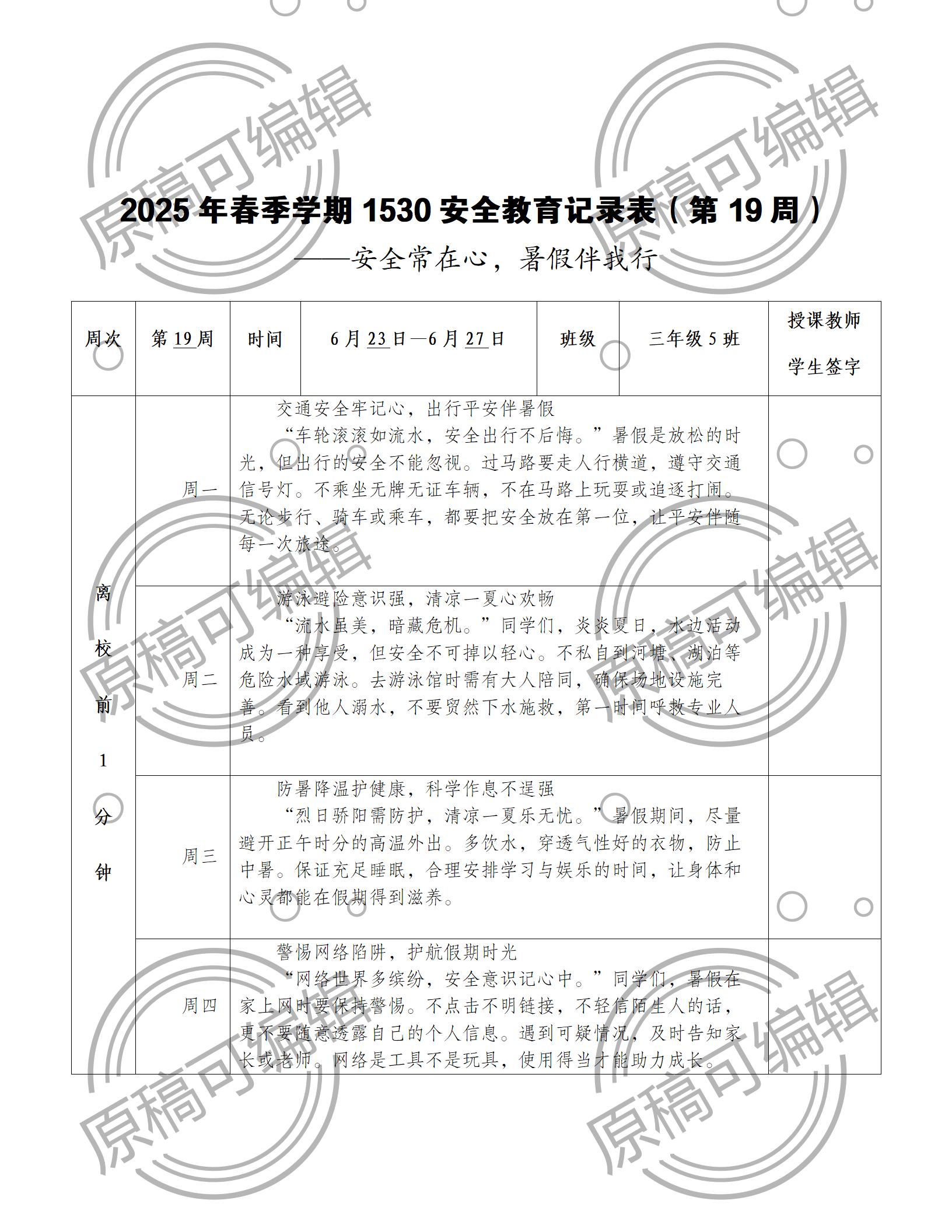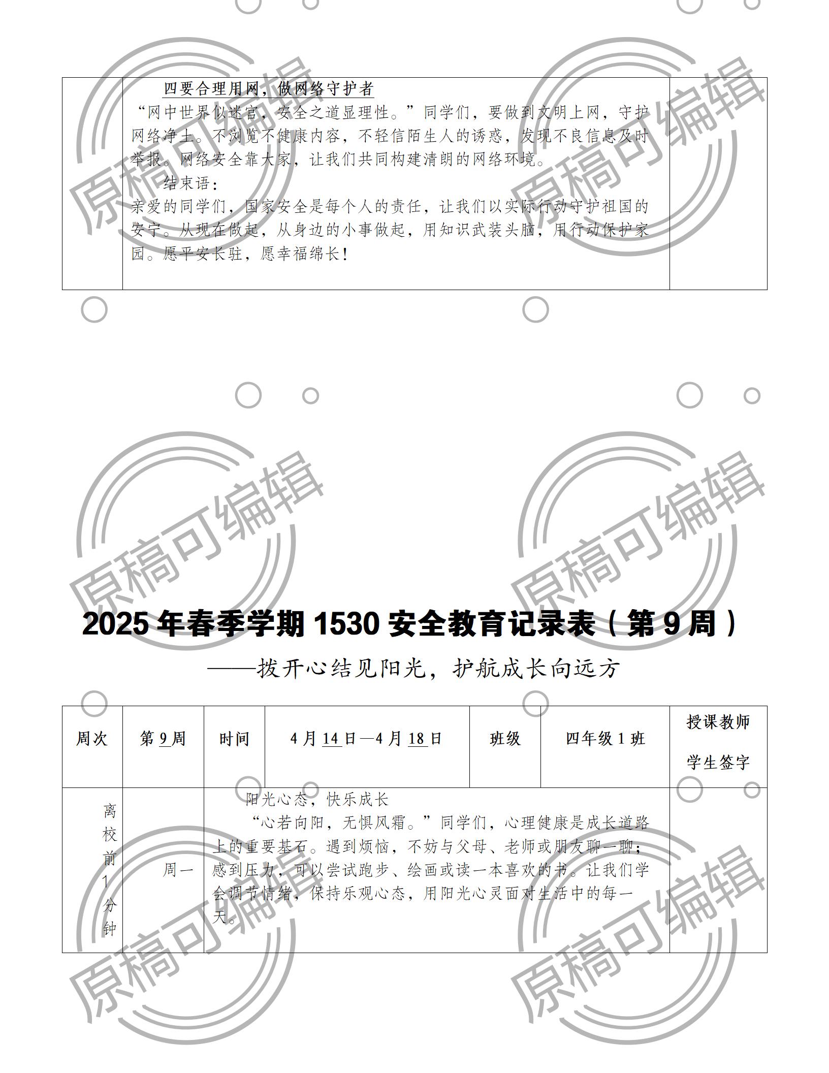 > 2025年春季1530安全教育主题安排(含20周1530安全教育记录表)