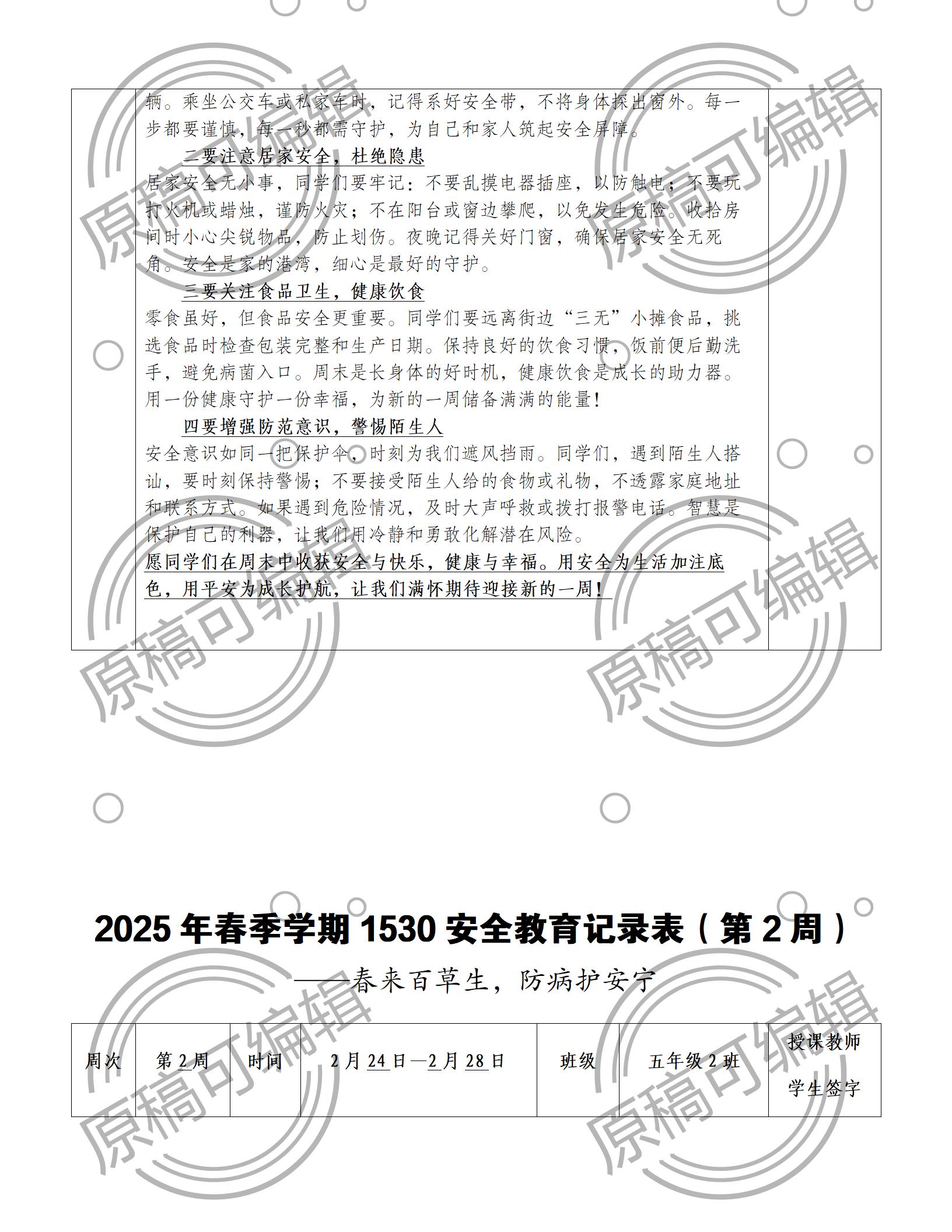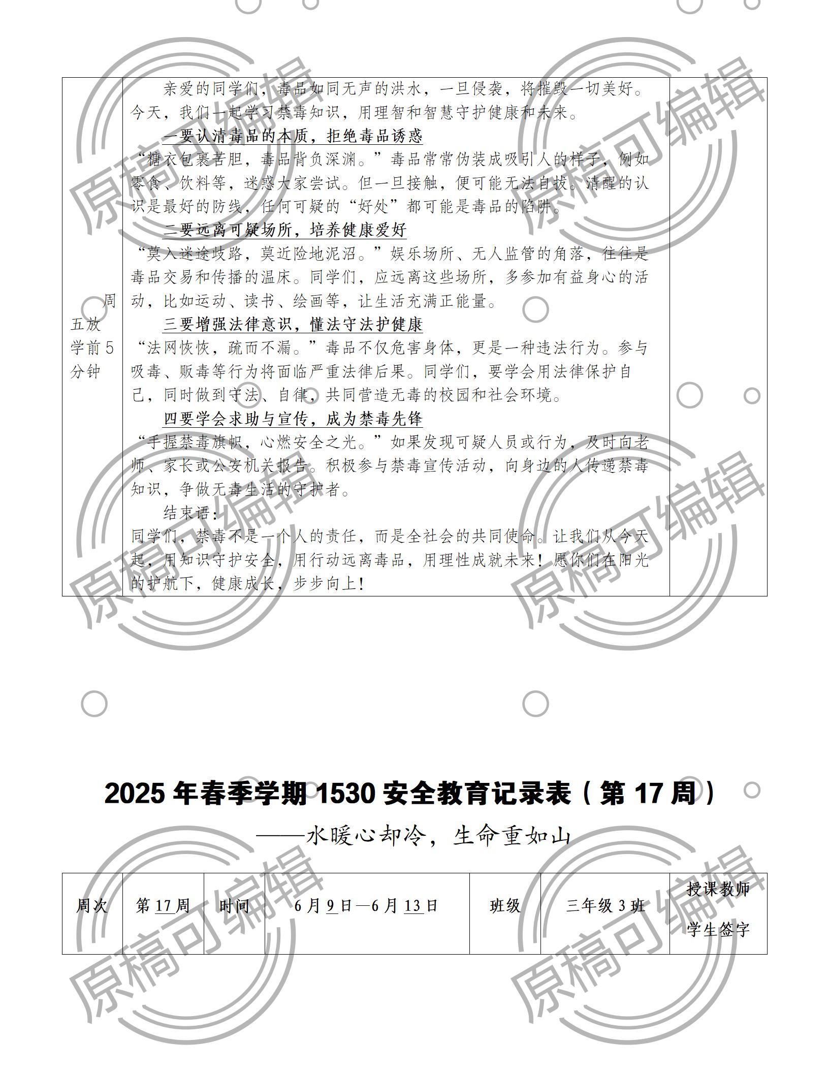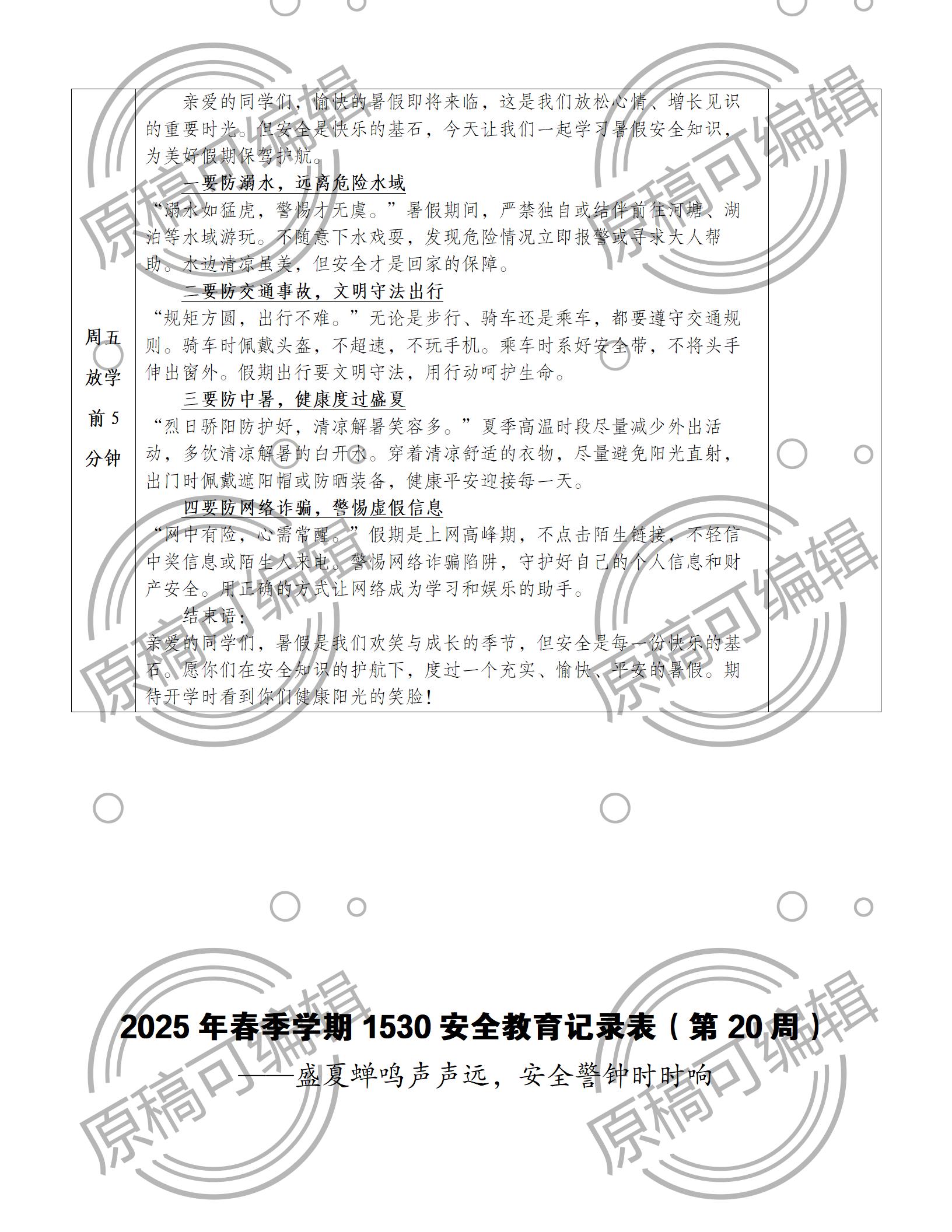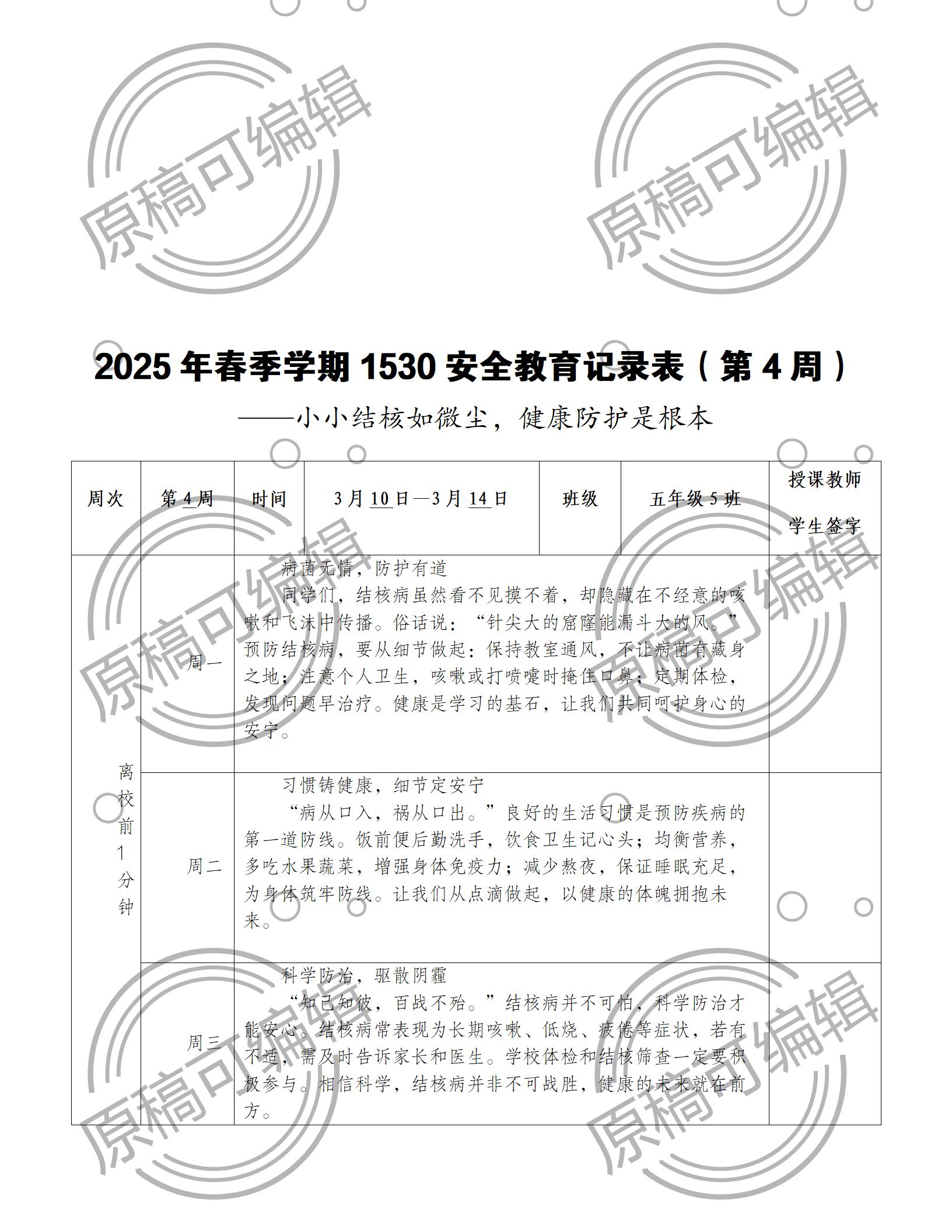 > 2025年春季1530安全教育主题安排(含20周1530安全教育记录表)