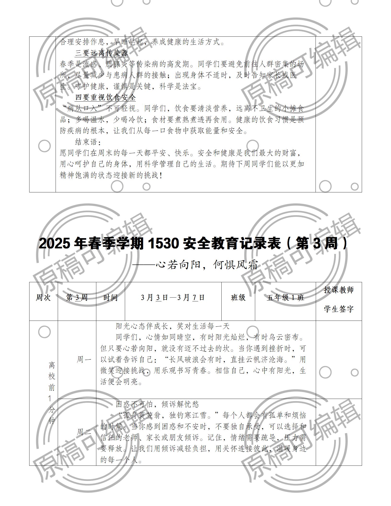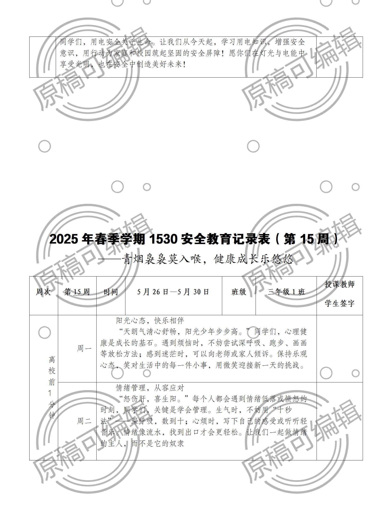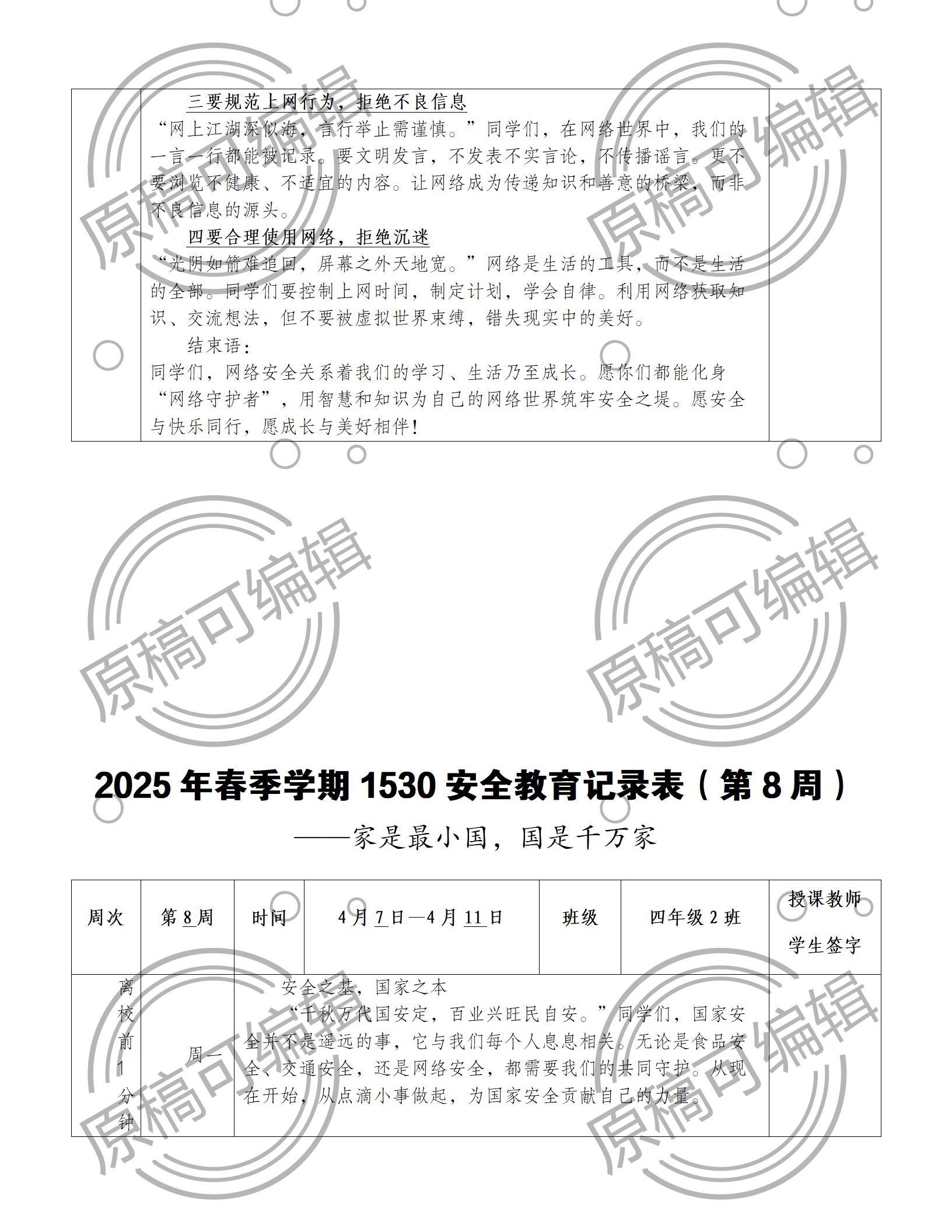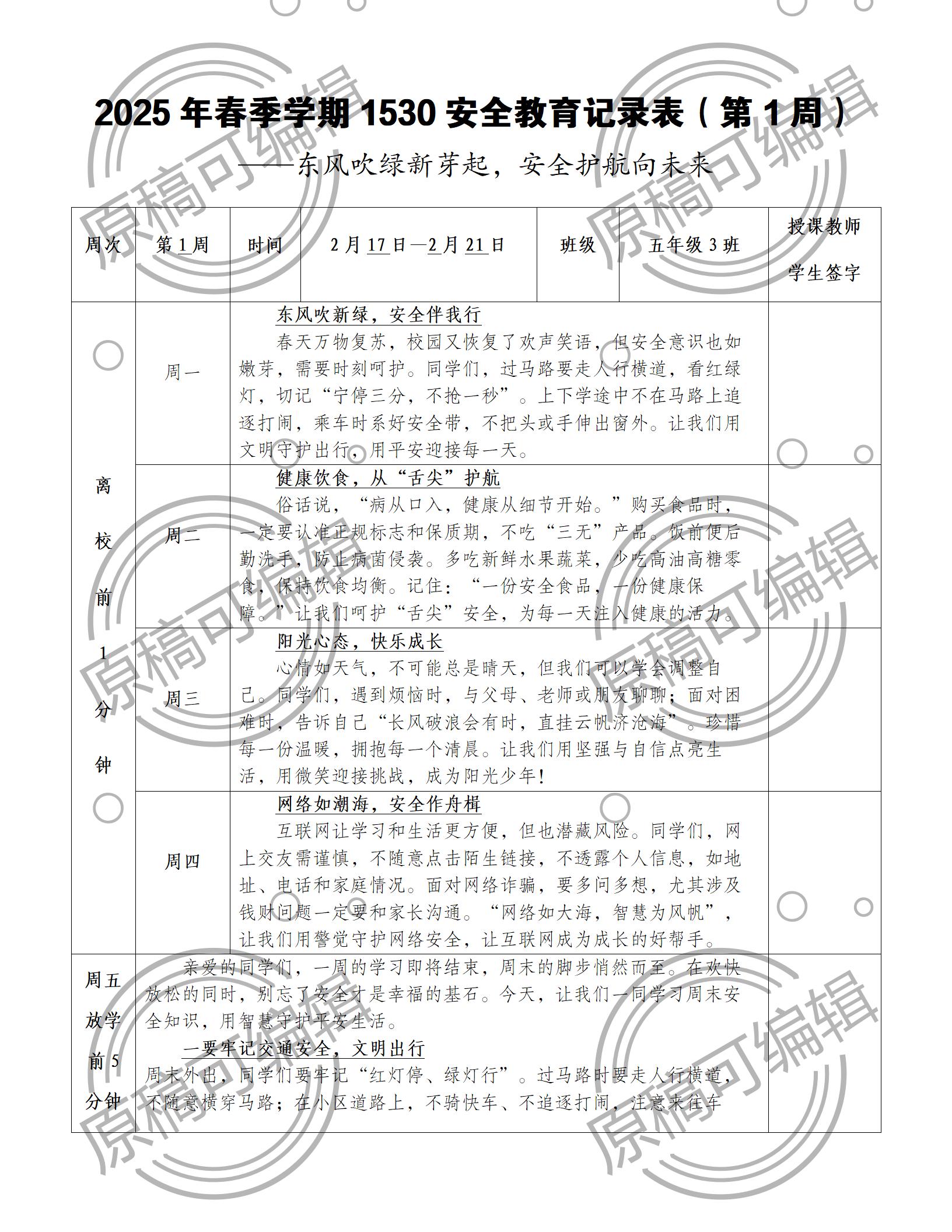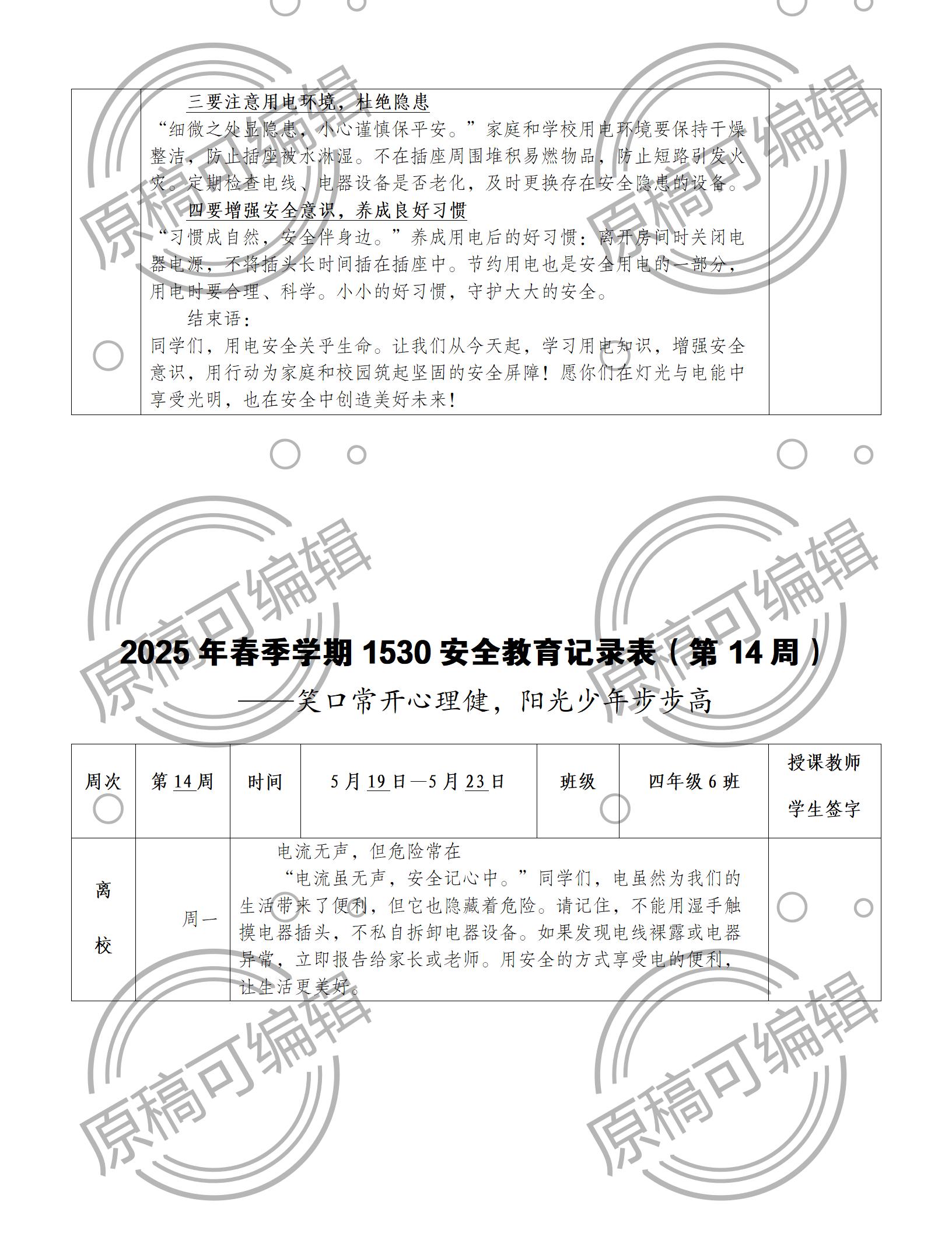 > 2025年春季1530安全教育主题安排(含20周1530安全教育记录表)
