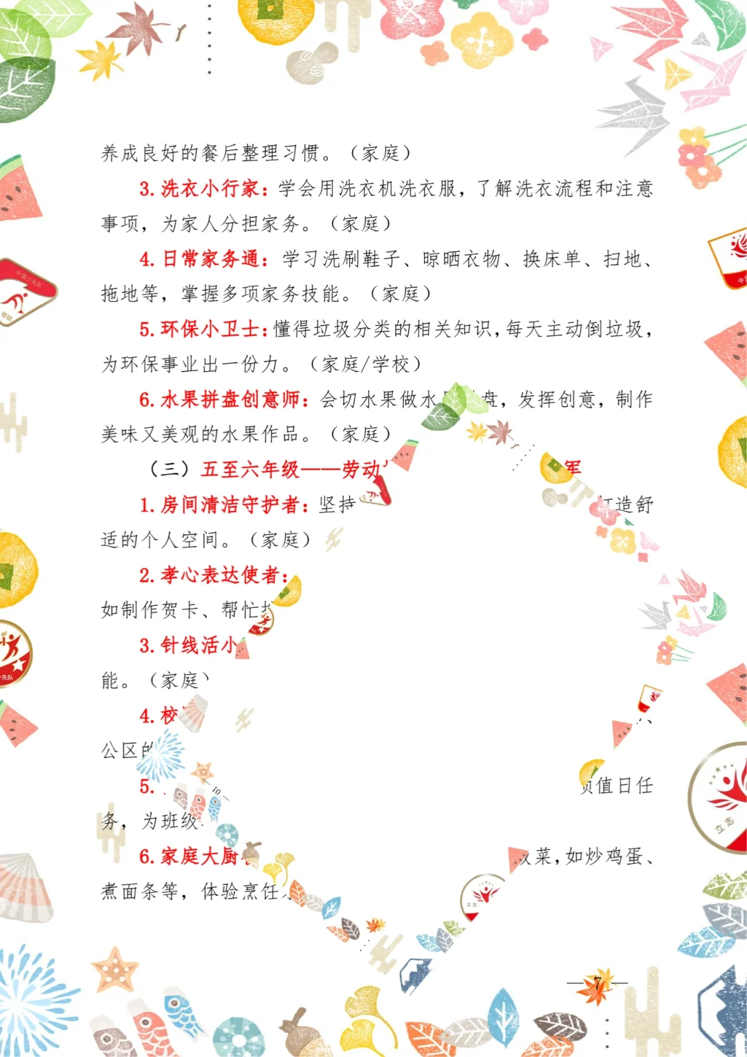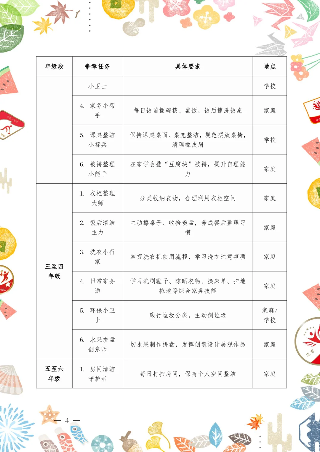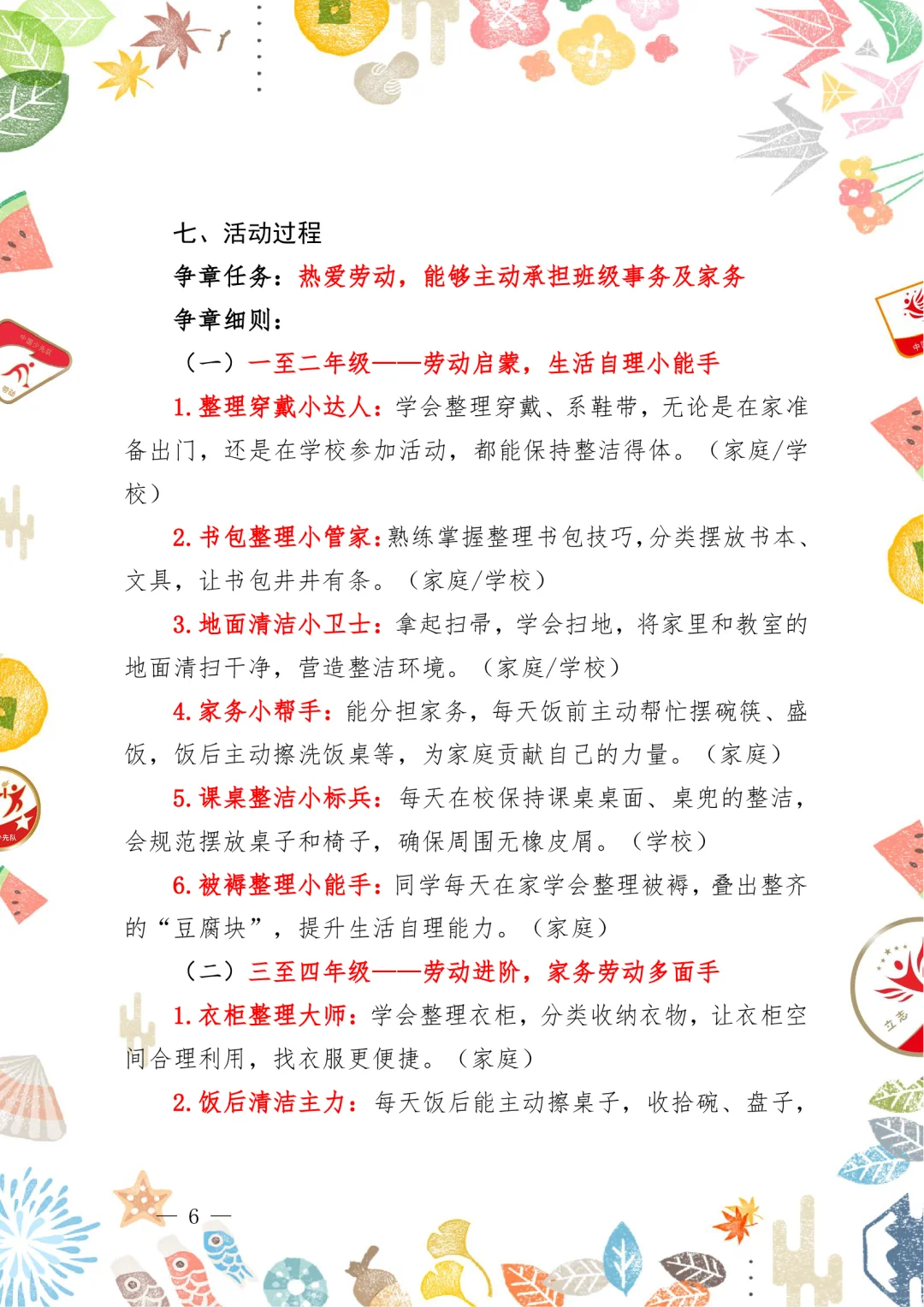 资源简介:劳动月争章活动方案劳动节争章活动方案五一劳动节活动方案五一劳动节实践活动方案 一、二年级的小朋友要学会整理穿戴、系鞋带,还要把书包收拾得井井有条,成为家务小帮手,叠出超整齐的“豆腐块”被褥,自理能力直接拉满!三、四年级的同学得进阶成家务小能手,整理衣柜、用洗衣机洗衣服、做创意水果拼盘,主打一个技能多样化!五、六年级的小伙伴要负责打扫房间,给长辈送惊喜,还能学缝扣子、做