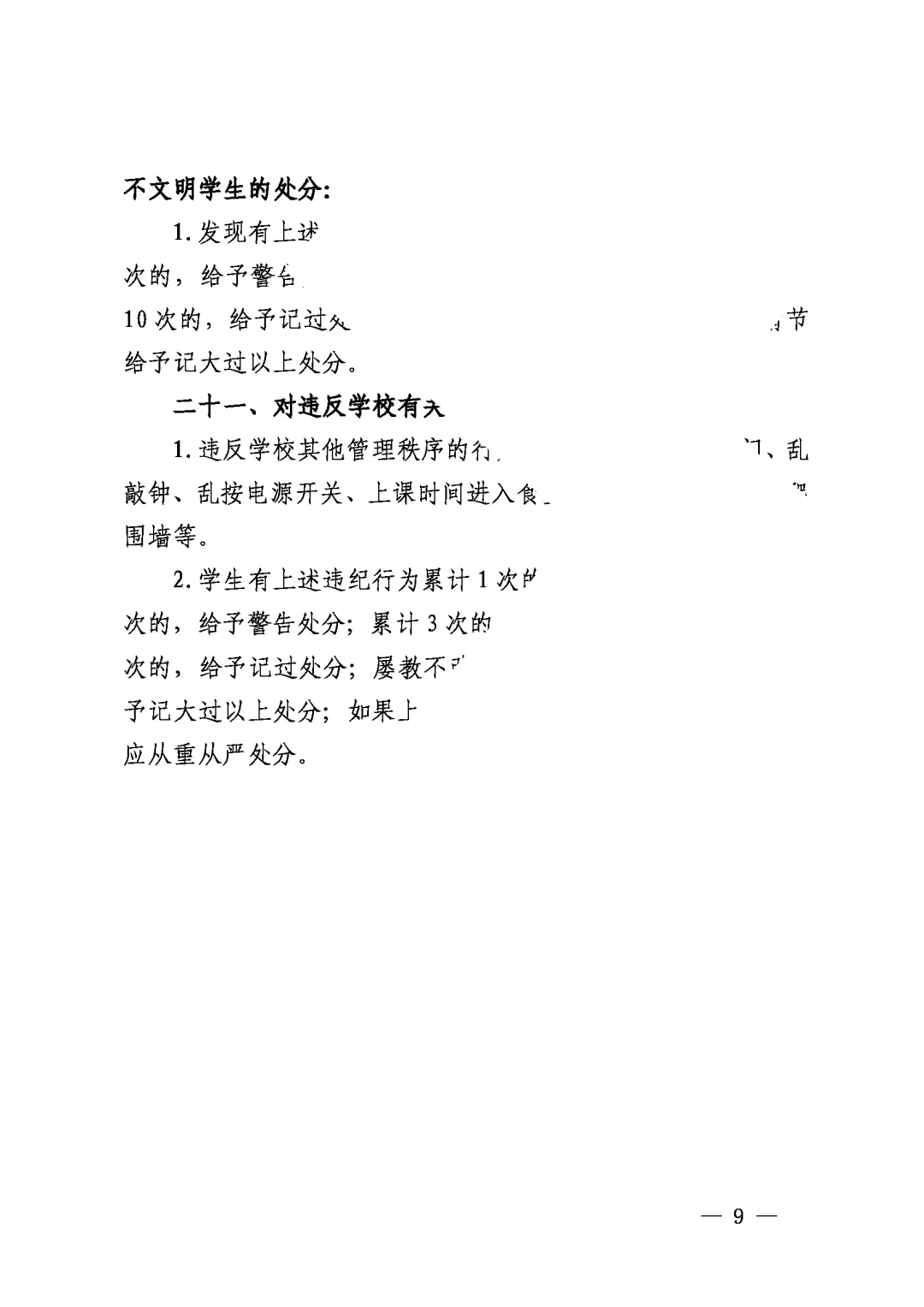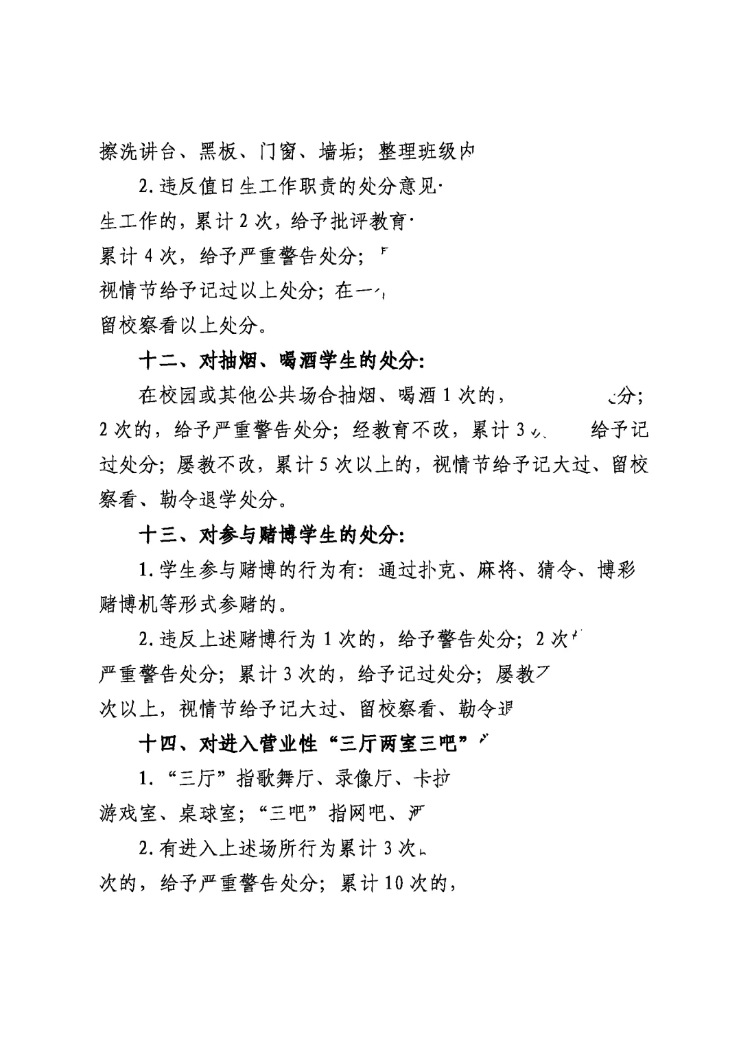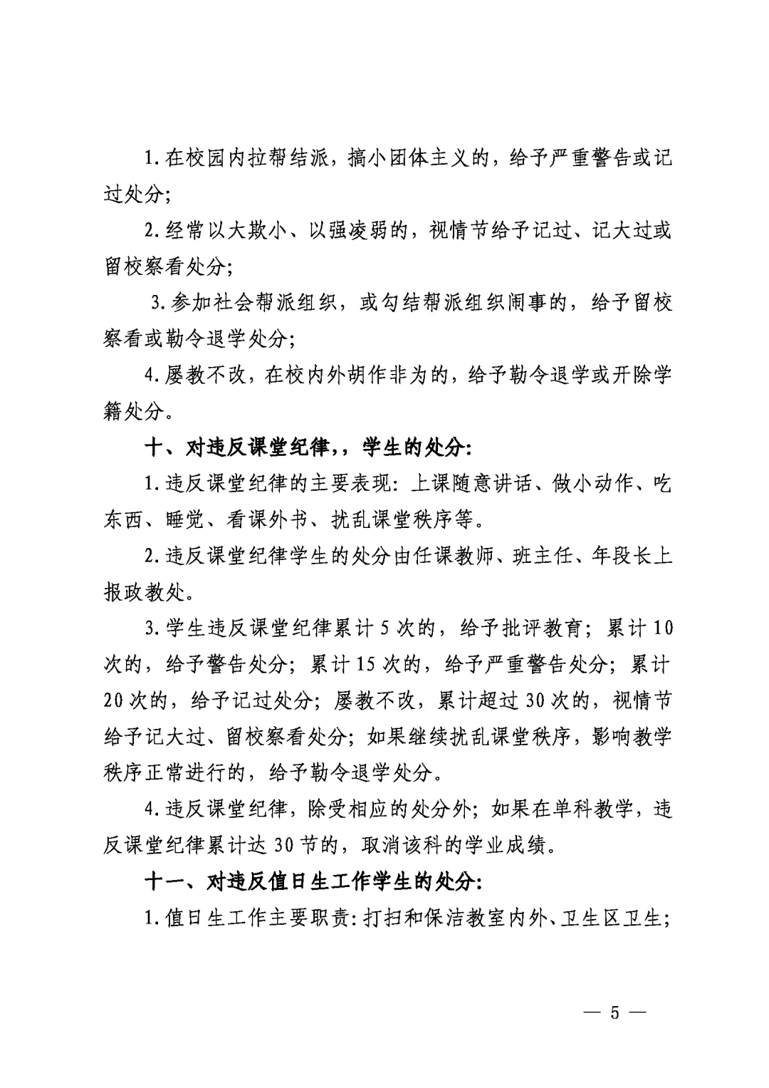 资源简介:之墨中学学生违纪处分细则(校纪校规)一、学校对学生违纪处分的总体规定二、学生处分的程序和执行三、学生申请撤销处分的流程四、对违反考勤制度学生的处分五、对违反校徽管理、仪容仪表等方面学生的处分六、对考试作弊学生的处分七、对偷窃、敲诈、勒索钱物学生的处分八、对打架学生的处分九、对拉帮结派、以大欺小、以强凌弱、胡作非为学生的处分十、对违反课堂纪律学生的处分十一、对违反值日生工作学生