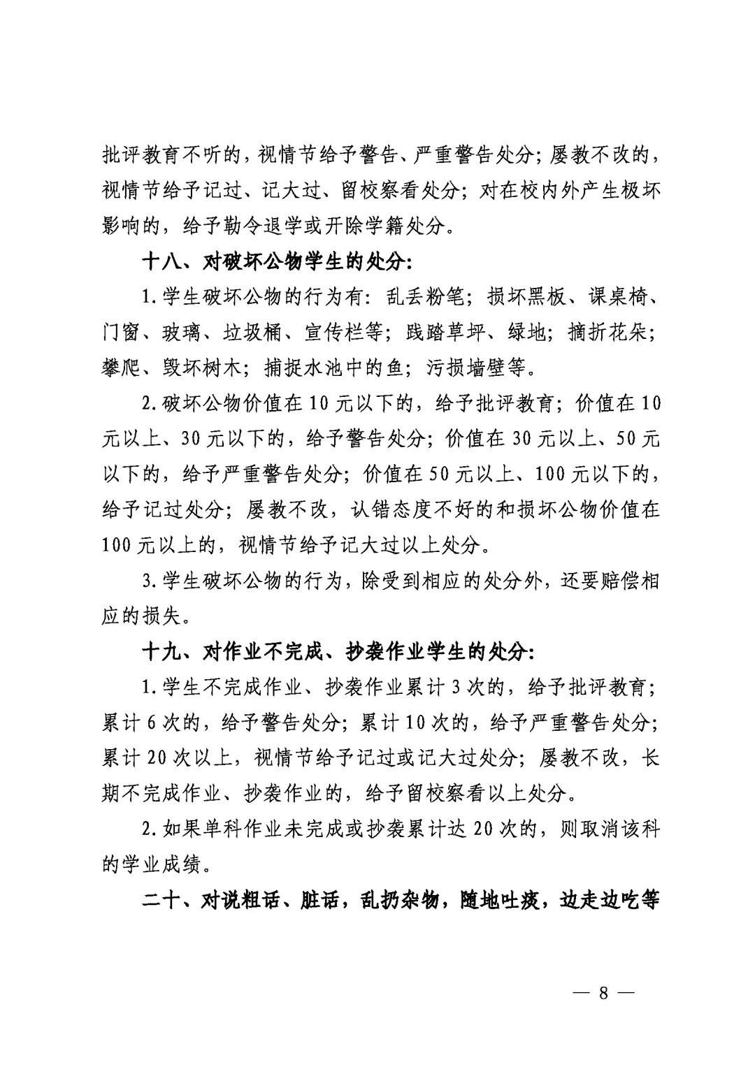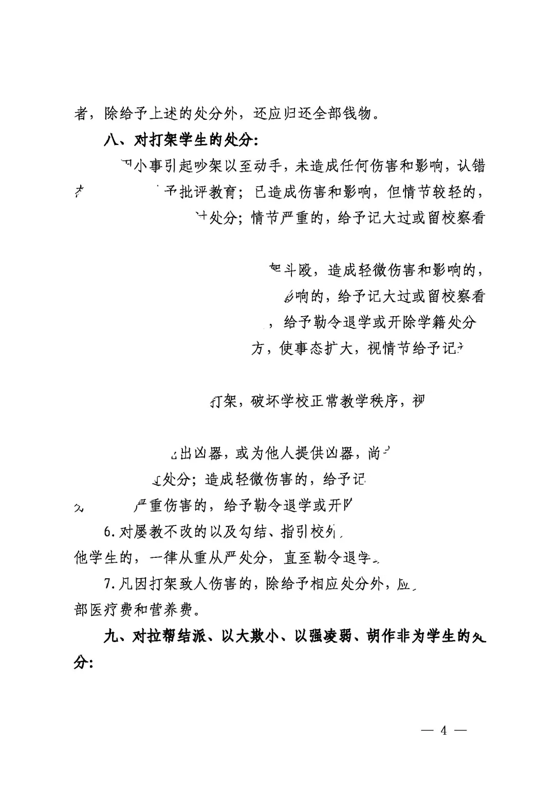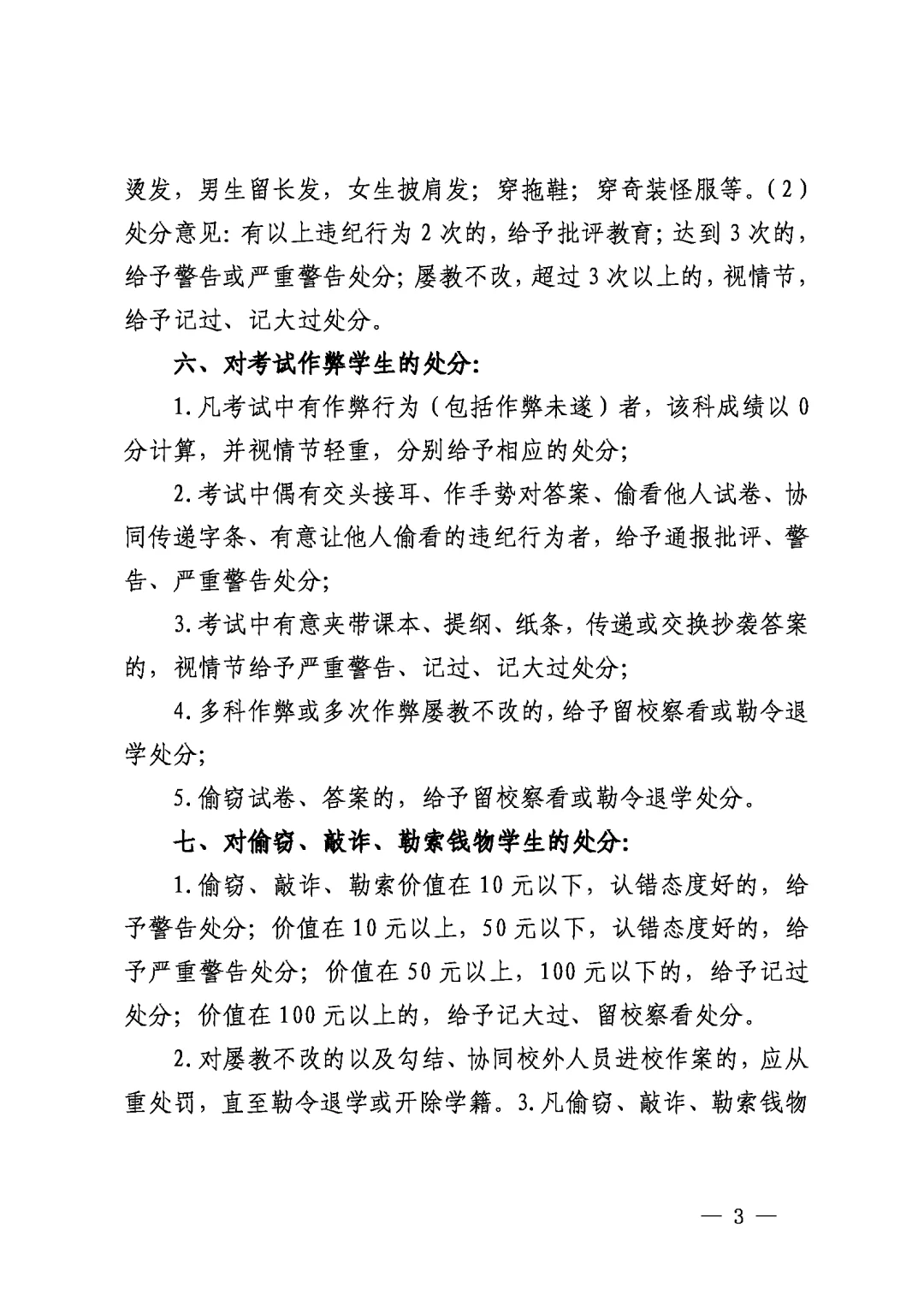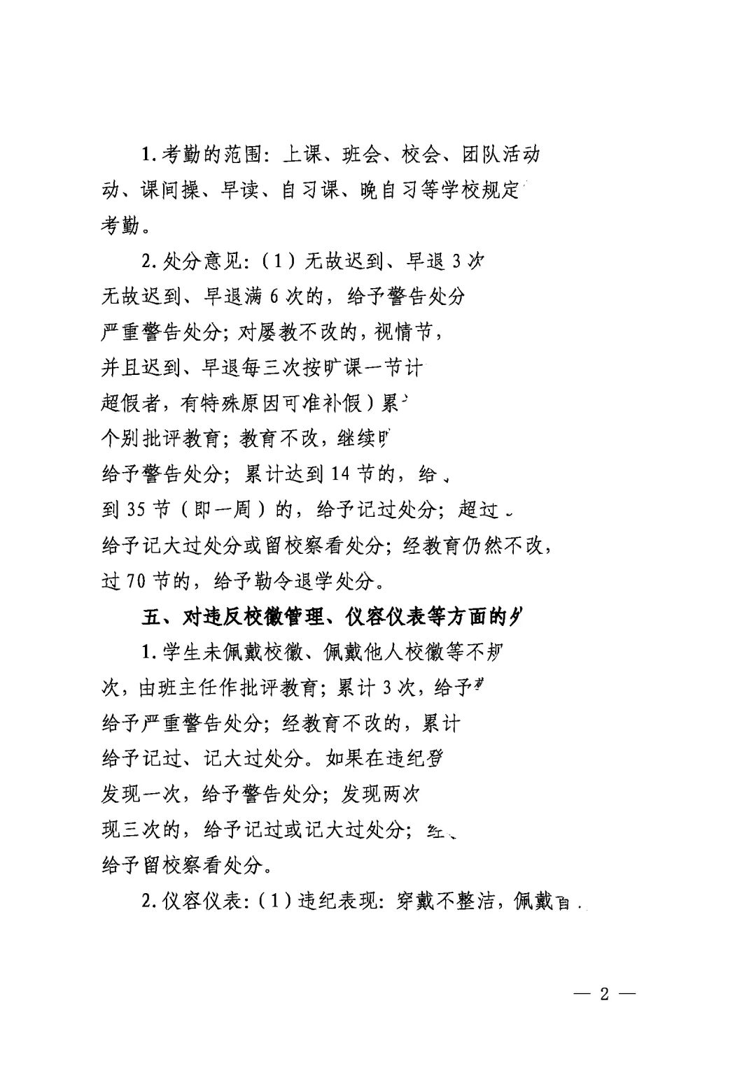 资源简介:之墨中学学生违纪处分细则(校纪校规)一、学校对学生违纪处分的总体规定二、学生处分的程序和执行三、学生申请撤销处分的流程四、对违反考勤制度学生的处分五、对违反校徽管理、仪容仪表等方面学生的处分六、对考试作弊学生的处分七、对偷窃、敲诈、勒索钱物学生的处分八、对打架学生的处分九、对拉帮结派、以大欺小、以强凌弱、胡作非为学生的处分十、对违反课堂纪律学生的处分十一、对违反值日生工作学生