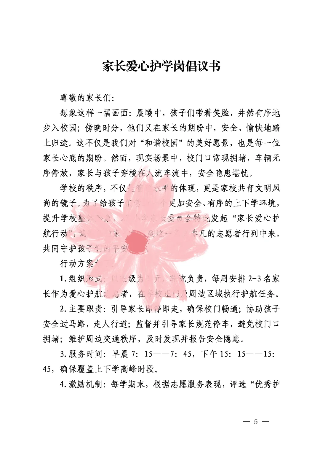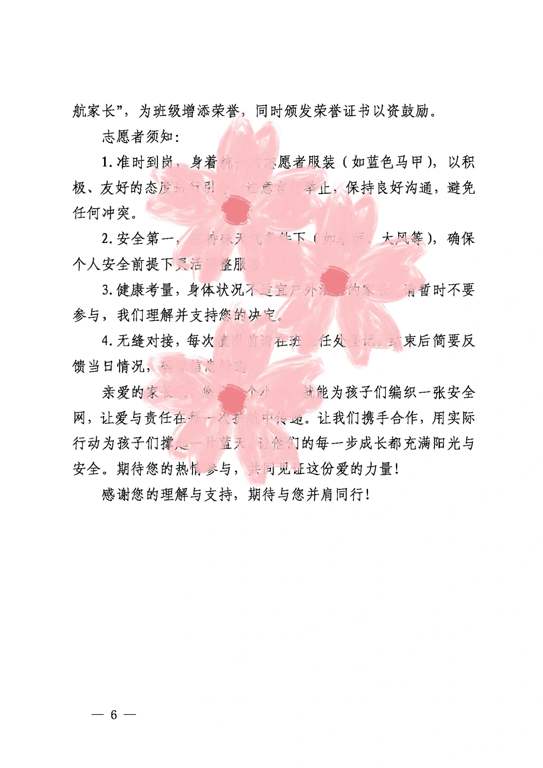 资源简介:之墨小学家长护学岗实施方案(家长自愿者护学岗方案)家长爱心护学岗倡议书家长爱心护学岗倡议书尊敬的家长们:想象这样一幅画面:晨曦中,孩子们带着笑脸,井然有序地步入校园;傍晚时分,他们又在家长的期盼中,安全、愉快地踏上归途。这不仅是我们对“和谐校园”的美好愿景,也是每一位家长心底的期盼。然而,现实场景中,校门口常现拥堵,车辆无序停放,家长与孩子穿梭在人流车流中,安全隐患堪忧。学校的秩序,不仅