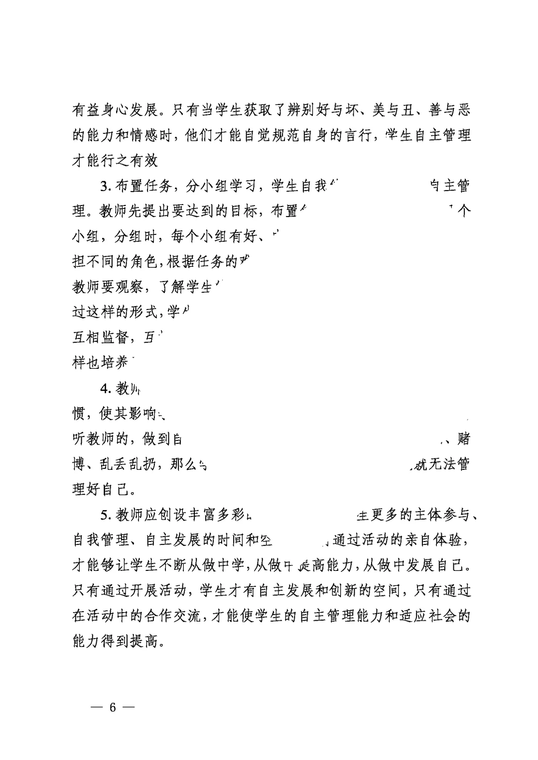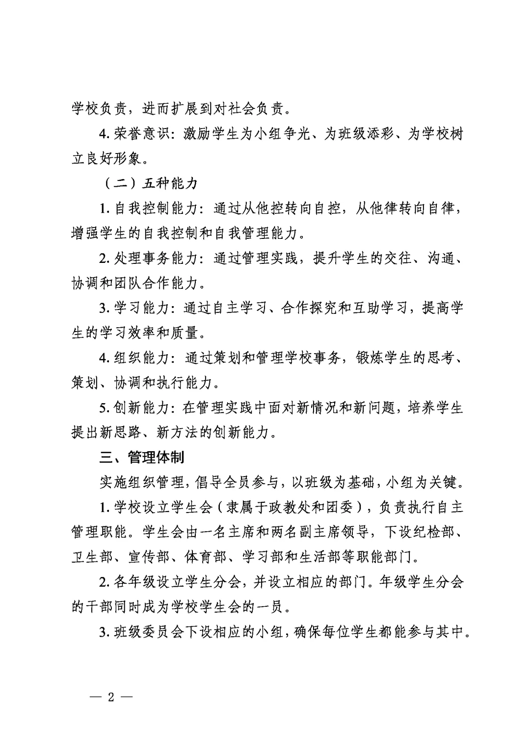 资源简介:之墨中学学生自主管理实施方案 学生自主管理方案学生自主管理模式,是在教师的激励、指导和辅助下,学生自主处理日常生活中的事务、参与活动和学习的一种管理方式。该模式彰显了现代学生观的转型,将学生置于学校教育的核心地位,坚持以学生为中心,能力为根本。通过尊重、信任、引导和激励等手段,充分激发学生的内在潜能和热情,为每位学生创造展示个性和才华的平台与环境。这种模式旨在促进学生自觉进行品德修养、心灵成