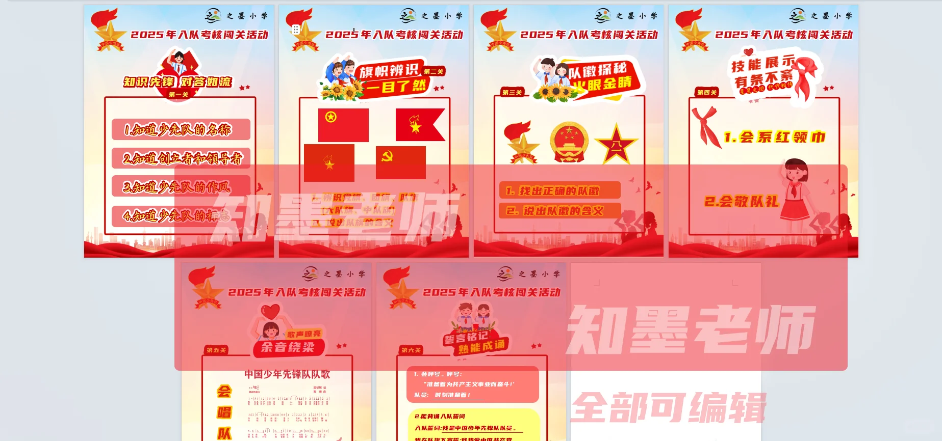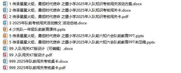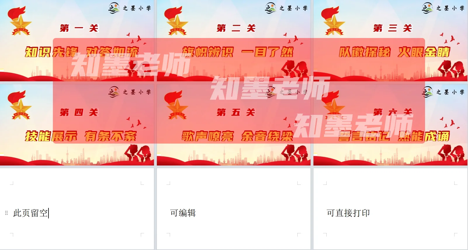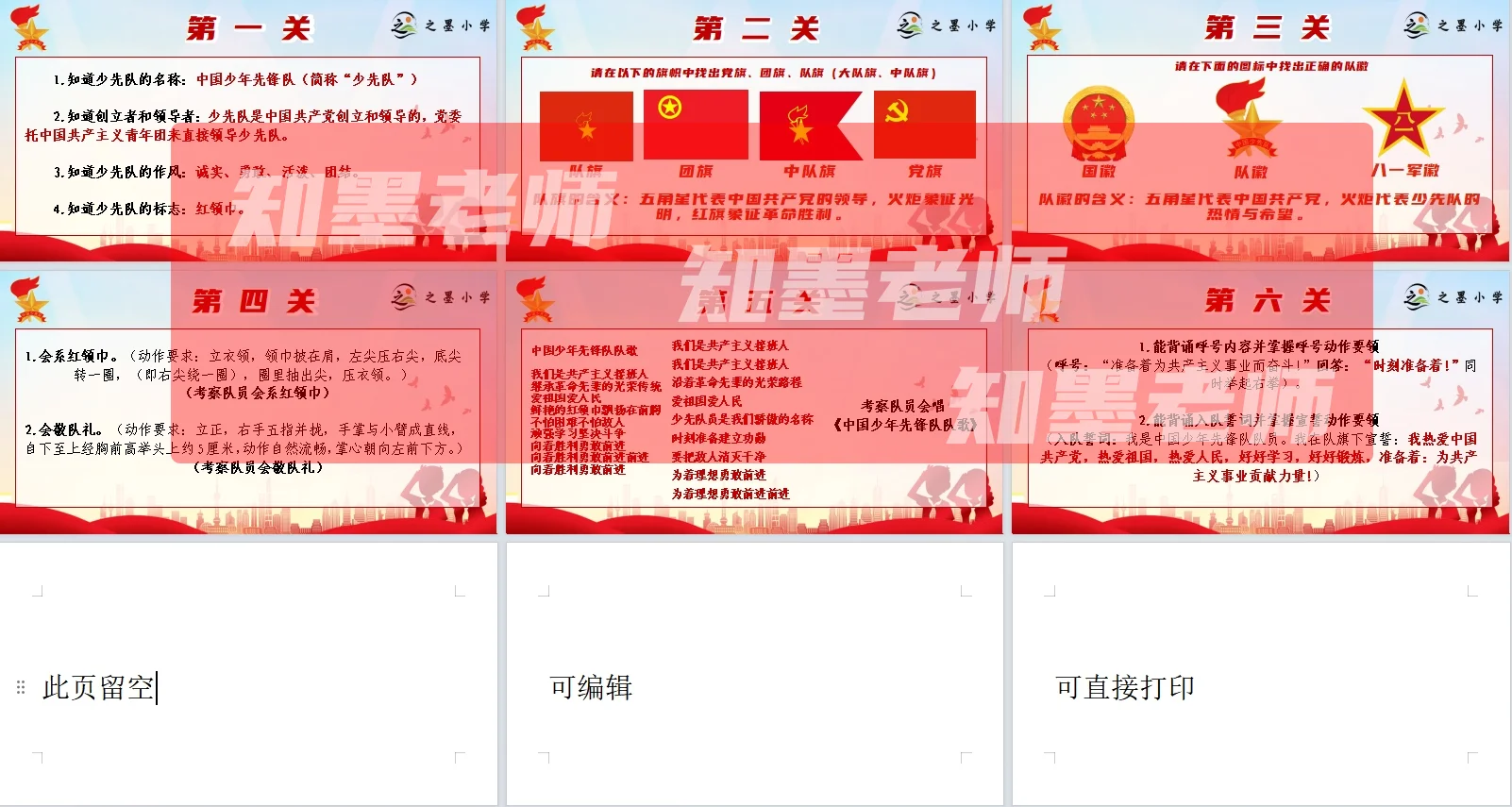 资源简介:宝子们,最近很多宝子都在问,有没有简单方便一点的队前考核闯关素材,今天就给你们安排上!简单而不失仪式感,桌子上摆上闯关桌卡,氛围直接拉满。很多朋友会问,为啥要搞这么多关卡?其实每一关都藏着大大的“教育魔法”!对于孩子们来说,闯关的形式就像玩超酷的冒险游戏!不再是枯燥地听知识,而是变身“小侦探”“小勇士”,主动去解锁关于少先队的秘密。在“知识先锋——对答如流”