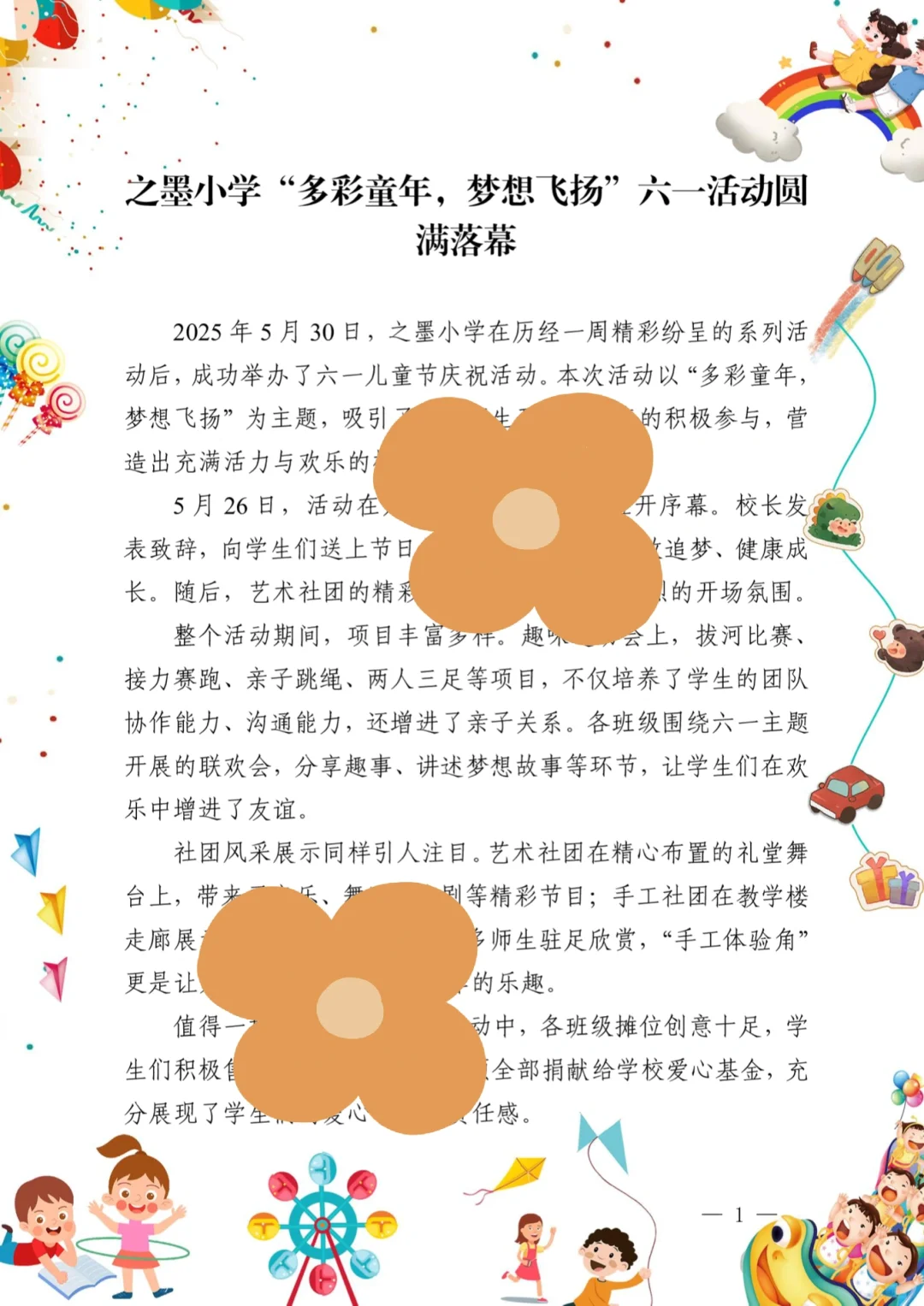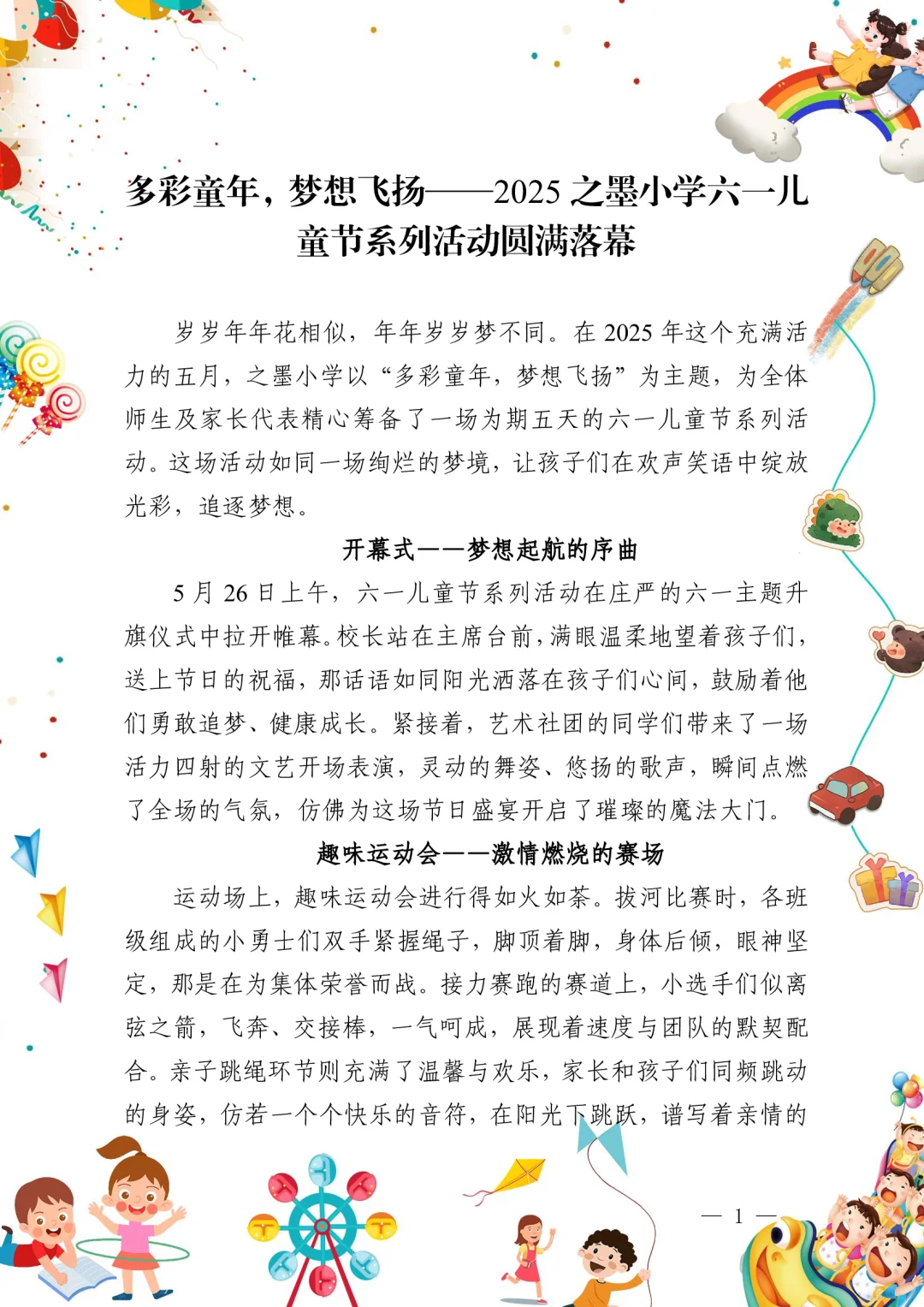 资源简介:六一儿童节来啦!之墨小学的六一活动简直太有心了,必须给大家分享一下为啥他们要这样搞活动!今年的主题是“多彩童年,梦想飞扬”,从月日到月日,整整一周的活动,每天都充满了欢声笑语! 先说说趣味运动会吧,超有爱!拔河比赛、接力赛跑、亲子跳绳、两人三足每个项目都能看到孩子们拼尽全力,家长们也积极参与,那种氛围真的太感染人啦!尤其是亲子跳绳,孩子们和家长的默契配合,让我都
