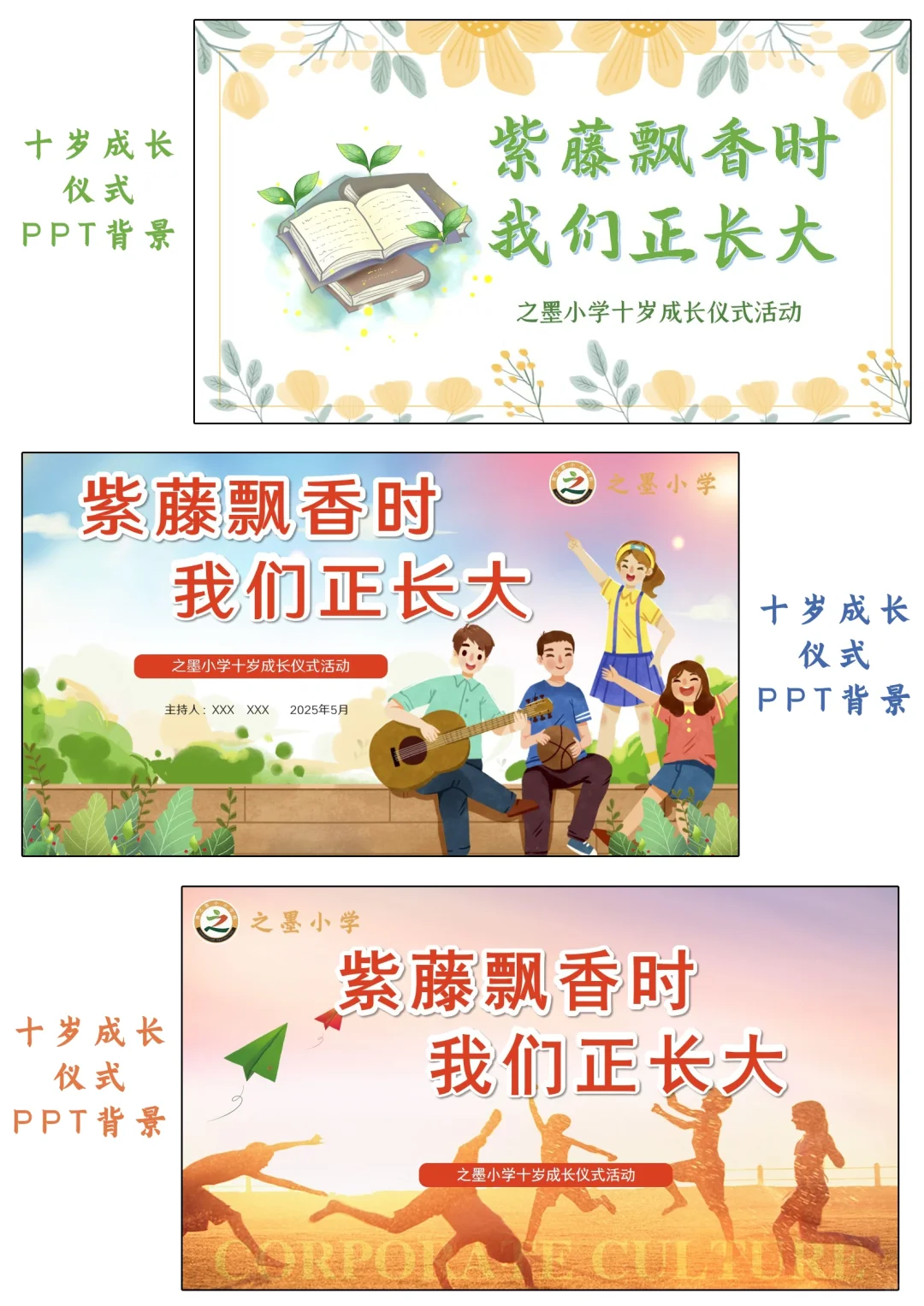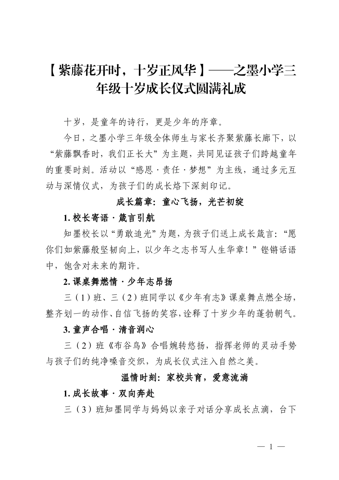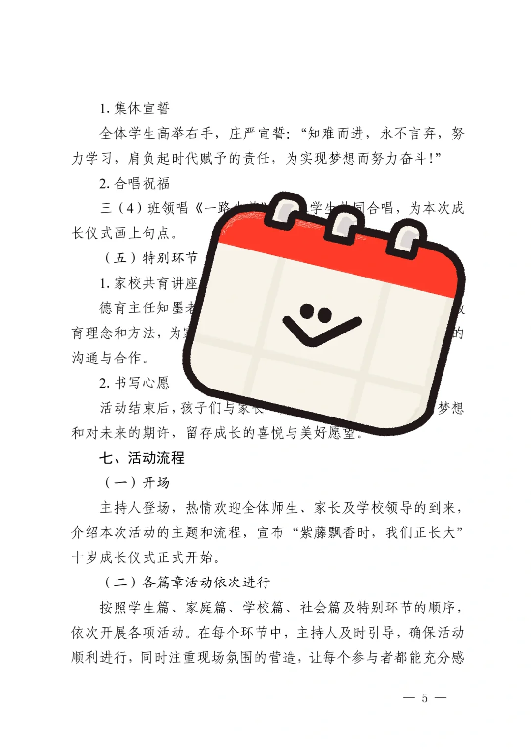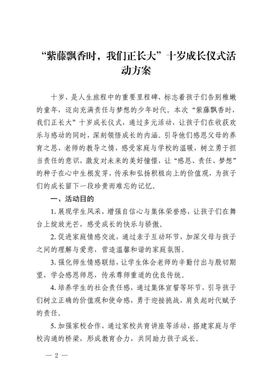 资源简介:“紫藤飘香时,我们正长大”十岁成长仪式活动方案共五个篇章一学生篇·风采无限(领导寄语、课桌舞表演、班级合唱布谷鸟、星级少年颁奖)二家庭篇·温情永恒(亲子家庭代表发言、家书传情)三学校篇·师恩如光(教师发言、舞蹈表演)四社会篇·责任启程五特别环节·活动延伸 之墨小学十岁成长仪式活动方案小学十岁成长仪式活动主持稿十岁成长仪式活动简讯(活动总结、活动新