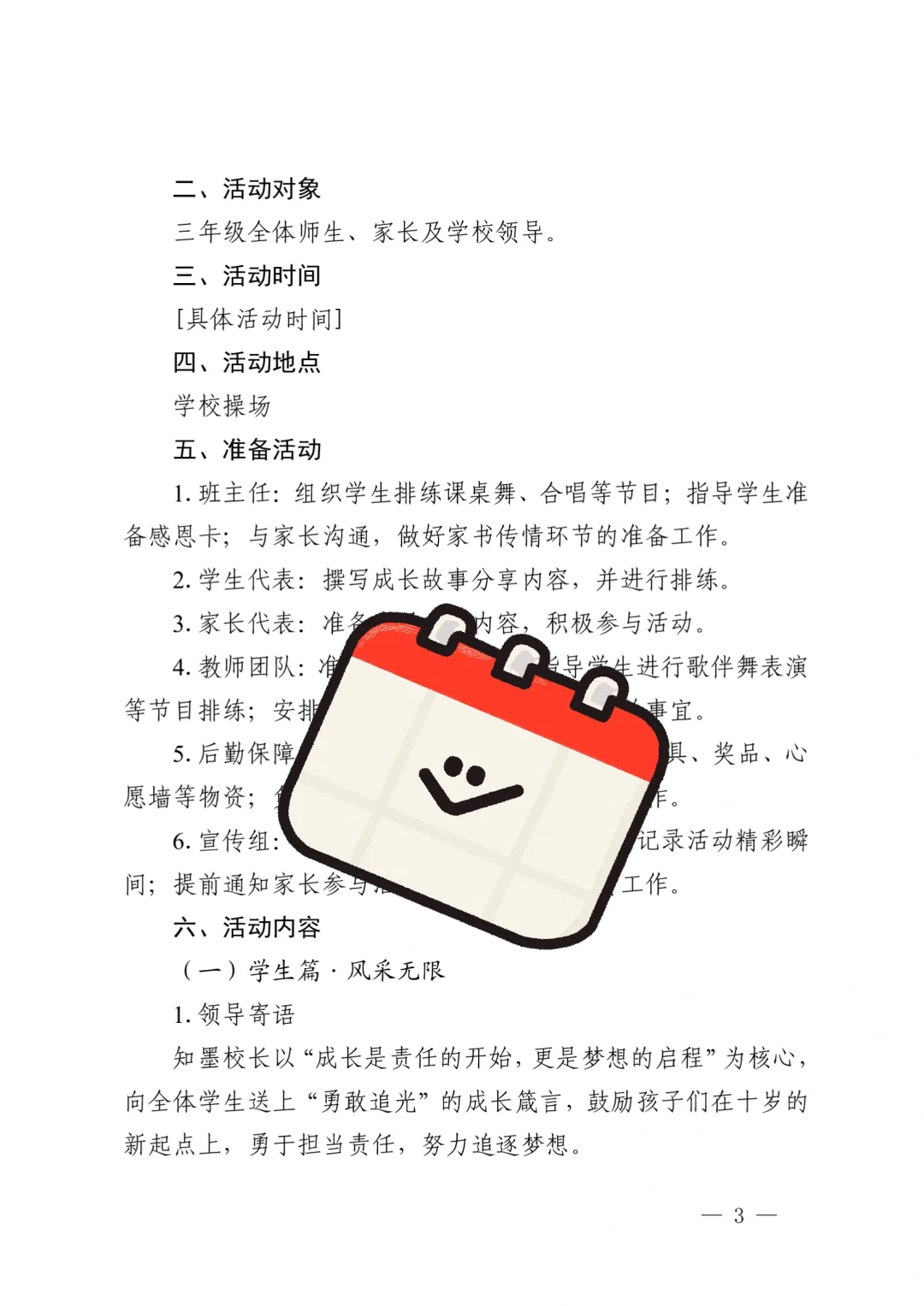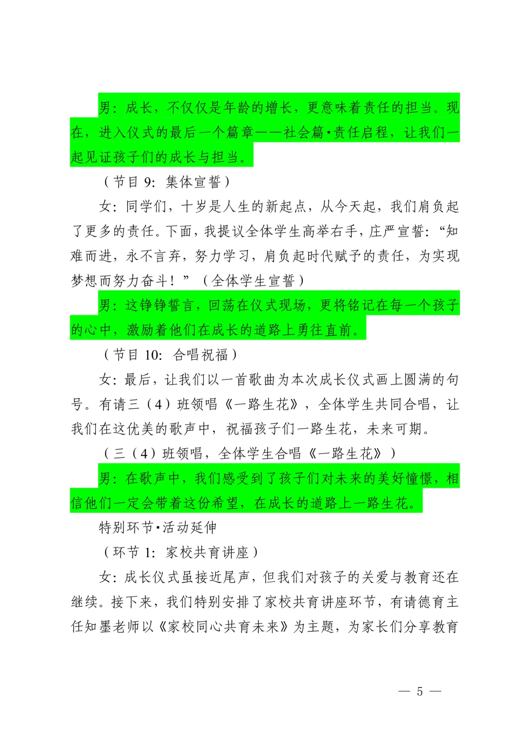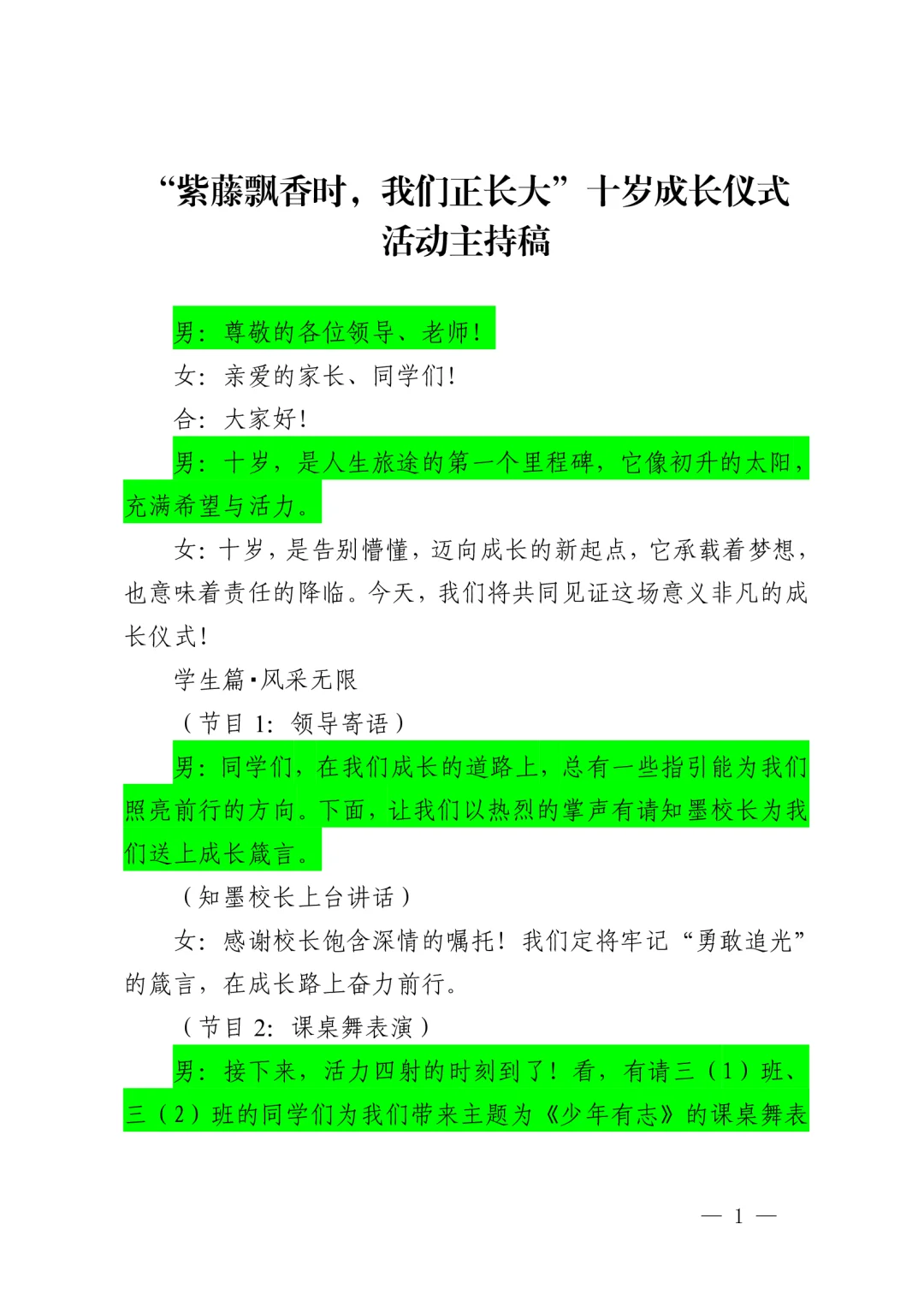 资源简介:“紫藤飘香时,我们正长大”十岁成长仪式活动方案共五个篇章一学生篇·风采无限(领导寄语、课桌舞表演、班级合唱布谷鸟、星级少年颁奖)二家庭篇·温情永恒(亲子家庭代表发言、家书传情)三学校篇·师恩如光(教师发言、舞蹈表演)四社会篇·责任启程五特别环节·活动延伸 之墨小学十岁成长仪式活动方案小学十岁成长仪式活动主持稿十岁成长仪式活动简讯(活动总结、活动新
