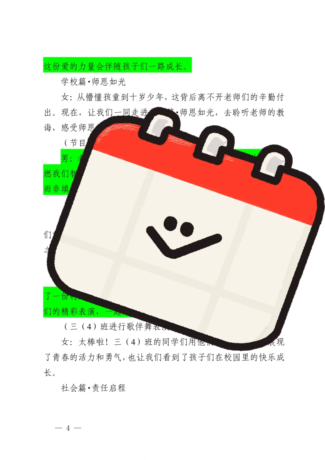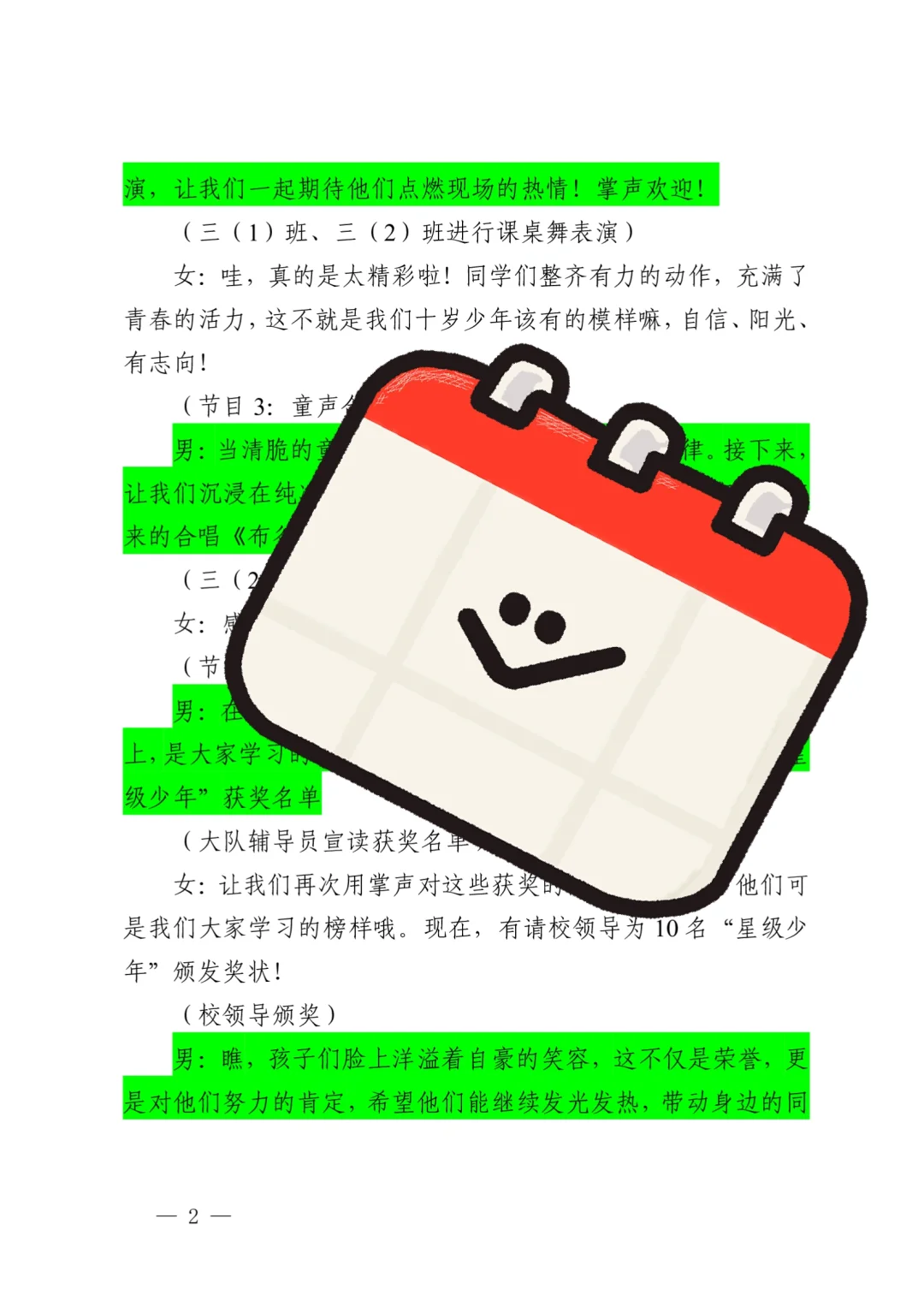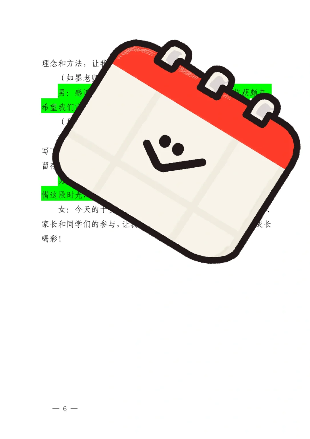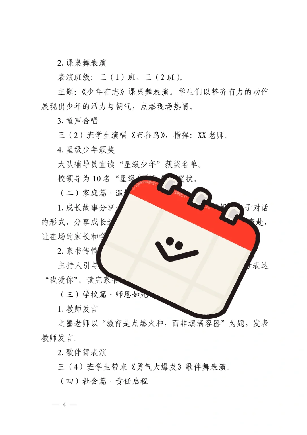 资源简介:“紫藤飘香时,我们正长大”十岁成长仪式活动方案共五个篇章一学生篇·风采无限(领导寄语、课桌舞表演、班级合唱布谷鸟、星级少年颁奖)二家庭篇·温情永恒(亲子家庭代表发言、家书传情)三学校篇·师恩如光(教师发言、舞蹈表演)四社会篇·责任启程五特别环节·活动延伸 之墨小学十岁成长仪式活动方案小学十岁成长仪式活动主持稿十岁成长仪式活动简讯(活动总结、活动新