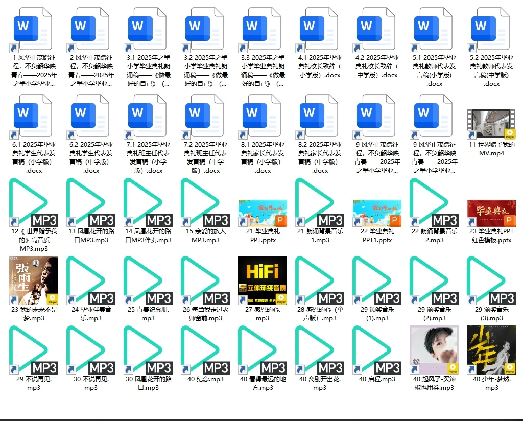 资源简介:参加完孩子小学毕业典礼我才知道原来离别可以这么浪漫每个环节都像精心设计的电影镜头每一帧都戳中泪点…开场《凤凰花开的路口》响起时孩子们清澈的歌声回荡在校园看着他们整齐的校服、认真的模样突然发现曾经的小不点已经长成有模有样的少年了大屏幕播放成长视频的瞬间运动会上加油呐喊的身影课堂上积极举手的模样那些被时光藏起来的回忆全都在这一刻涌了出来
