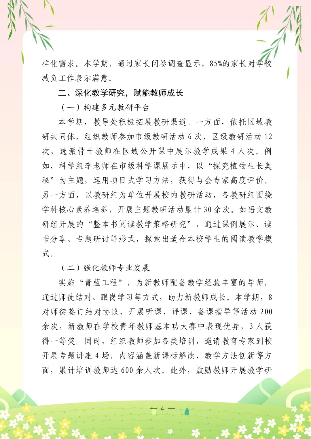 资源简介:精研教学促发展,笃行不怠勤耕耘——之墨小学年春季教导处工作总结年春季教导处工作总结年春季教务工作总结年春季教导处工作总结年春季教务处工作总结目录如下一、抓实教学常规,夯实质量根基(一)优化教学流程管理(二)规范课程实施过程(三)完善考试评价体系(四)落实减负增效举措二、深化教学研究,赋能教师成长(一)构建多元教研
