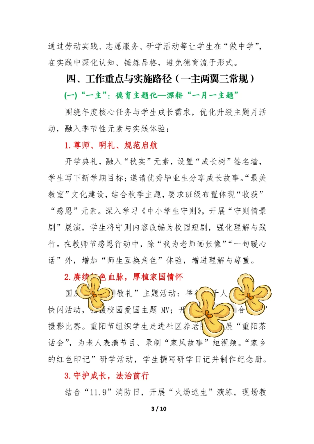 资源简介:德润心田·智启未来·行塑栋梁学年第一学期学校德育工作计划及安排表“一主”:德育主题化—深耕“一月一主题”“两翼”:特色驱动与协同赋能翼一:劳动教育特色—打造“秋实”劳动课程体系翼二:家校协同育人—建设“同心圆”育人生态“三常规”:夯实根基提升效能常规一:德育活动系列化、精品化常规二:德育工作制度化、精细化常规三:德育宣传多样化、立体化学校德育德育工作安