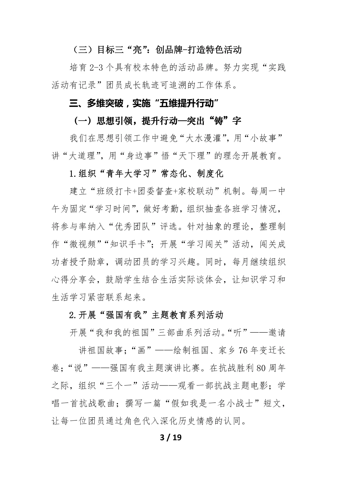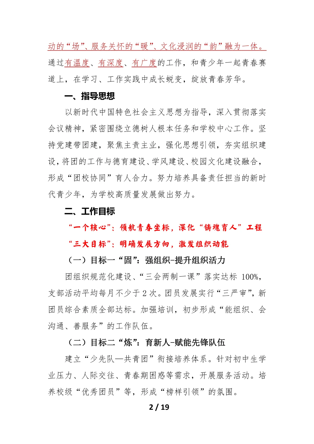 资源简介:2025-2026学年第一学期团委工作计划及安排表——擎画青春赛道绽放年少芳华一、指导思想二、工作目标“一个核心”:领航青春坐标,深化“铸魂育人”工程“三大目标”:明确发展方向,激发组织动能(一)目标一“固”:强组织提升组织活力(二)目标二“炼”:育新人赋能先锋队伍(三)目标三“亮”:创品牌打造特色活动三、多维突破,实施“五维提升行动”(一)思想引领,提升行动—突出“铸