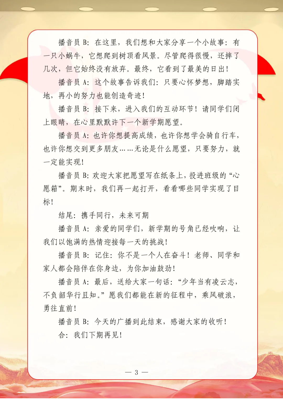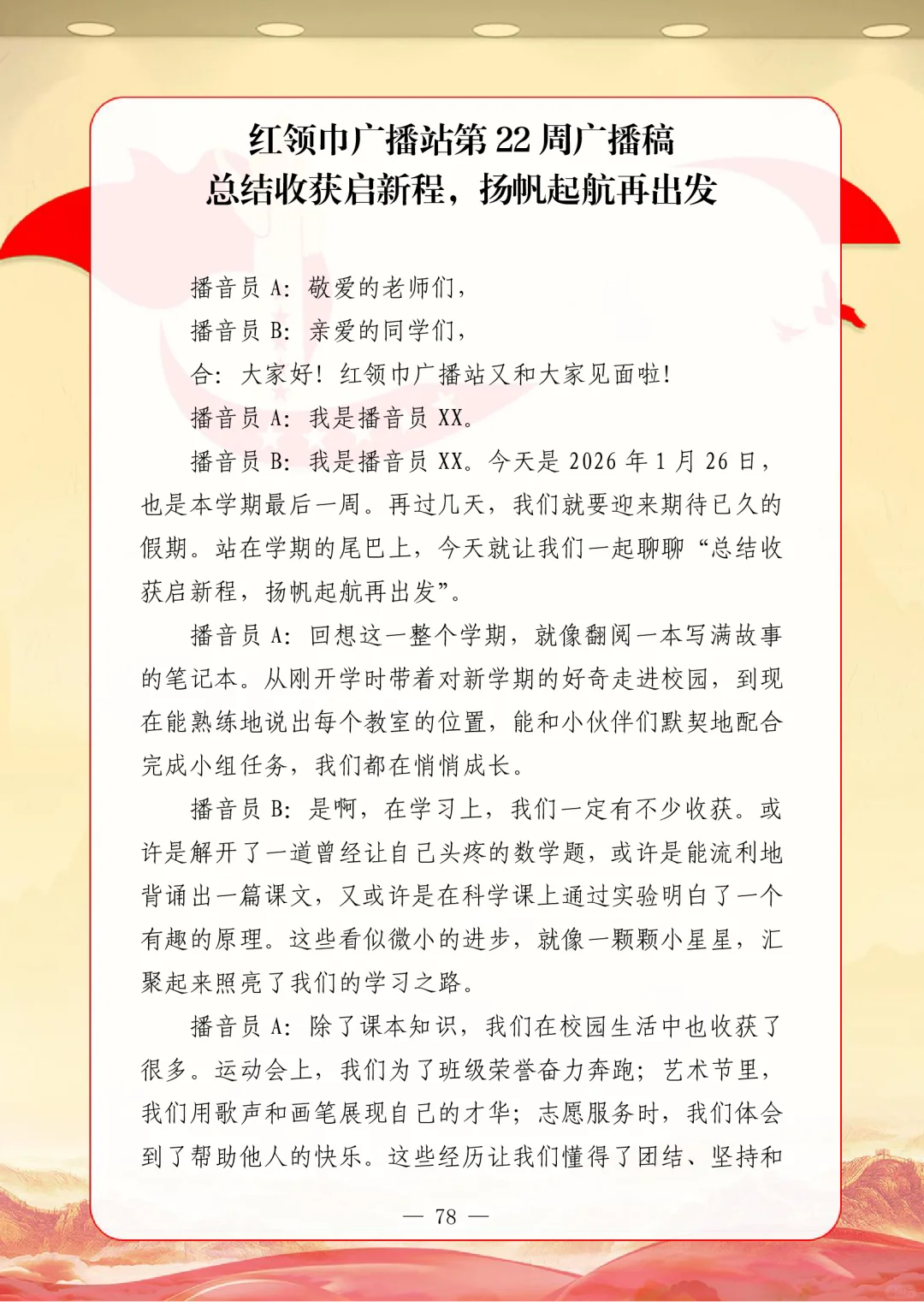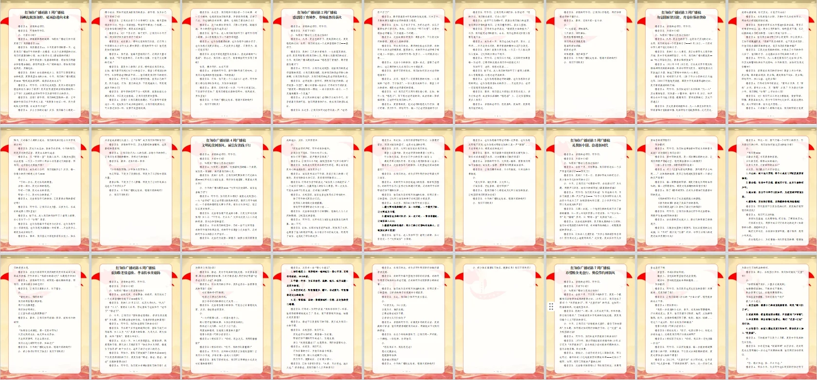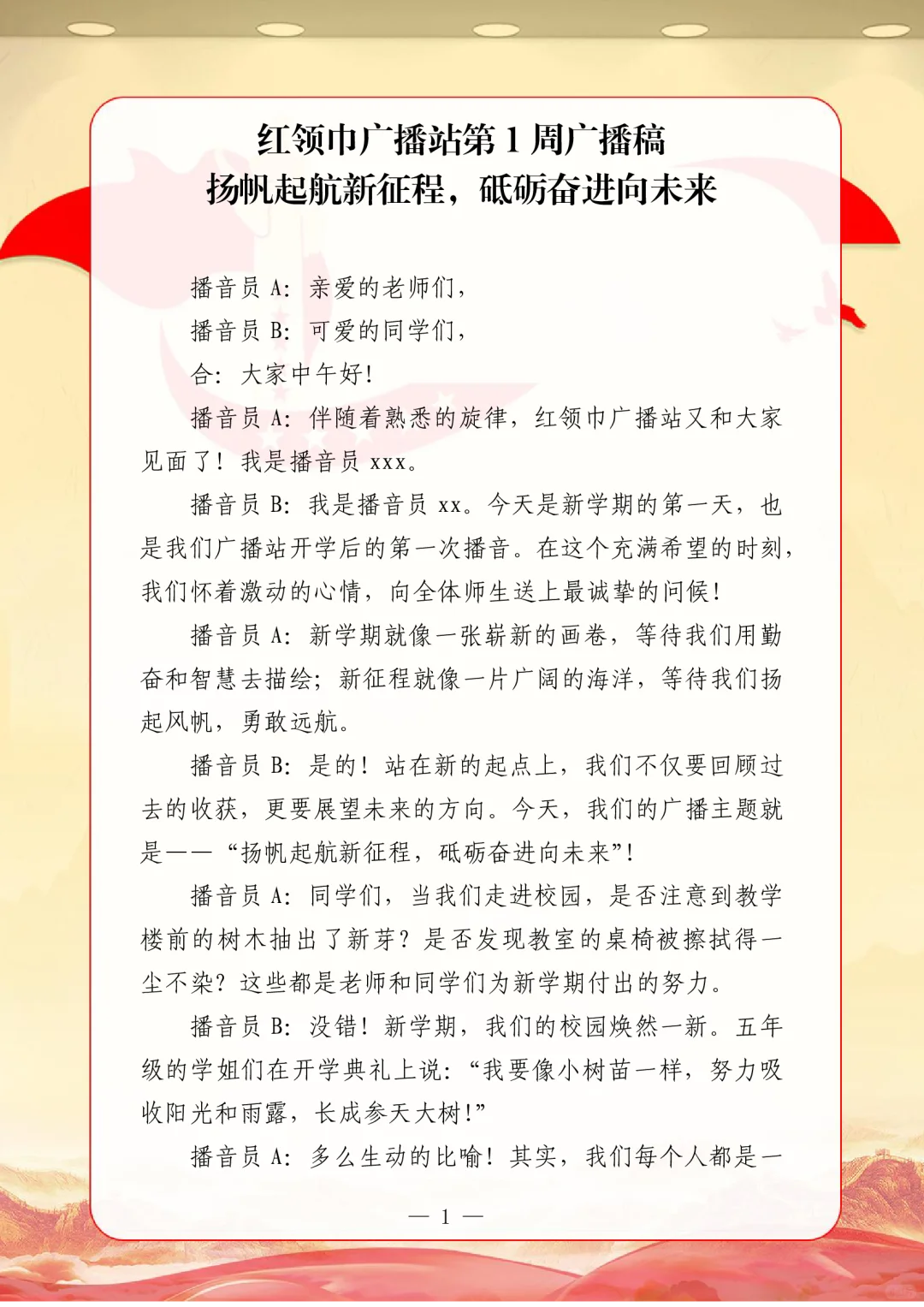 资源简介:年秋季广播站安排表含配套周广播稿学年第一学期广播站安排表含篇广播稿宝子们!秋季学期的广播站主题清单新鲜出炉~从开学到放假,周不重样,每天的课间都有期待感啦!第一周就用“扬帆起航新征程,砥砺奋进向未来”开嗓,新学期的元气直接通过电波传满校园!遇到教师节这周,“感恩园丁育桃李”的主题一响起,谁的眼眶不会悄悄发热呀~传统节日也藏在电波里哦!
