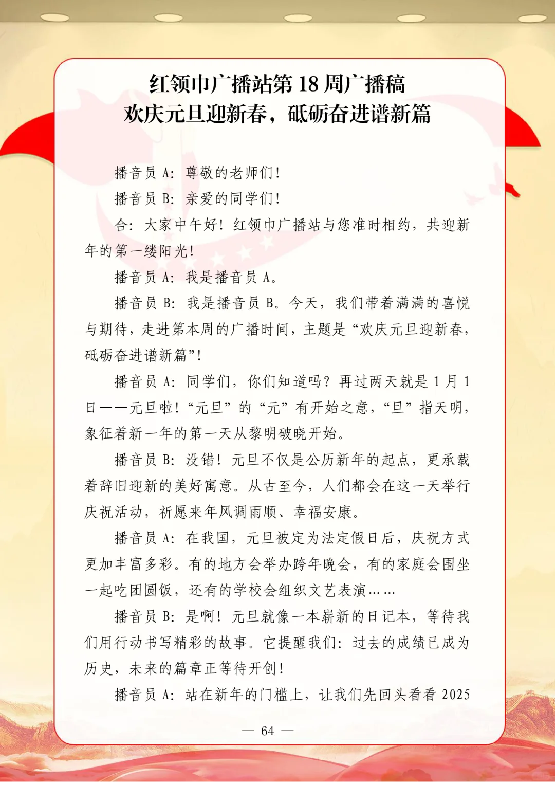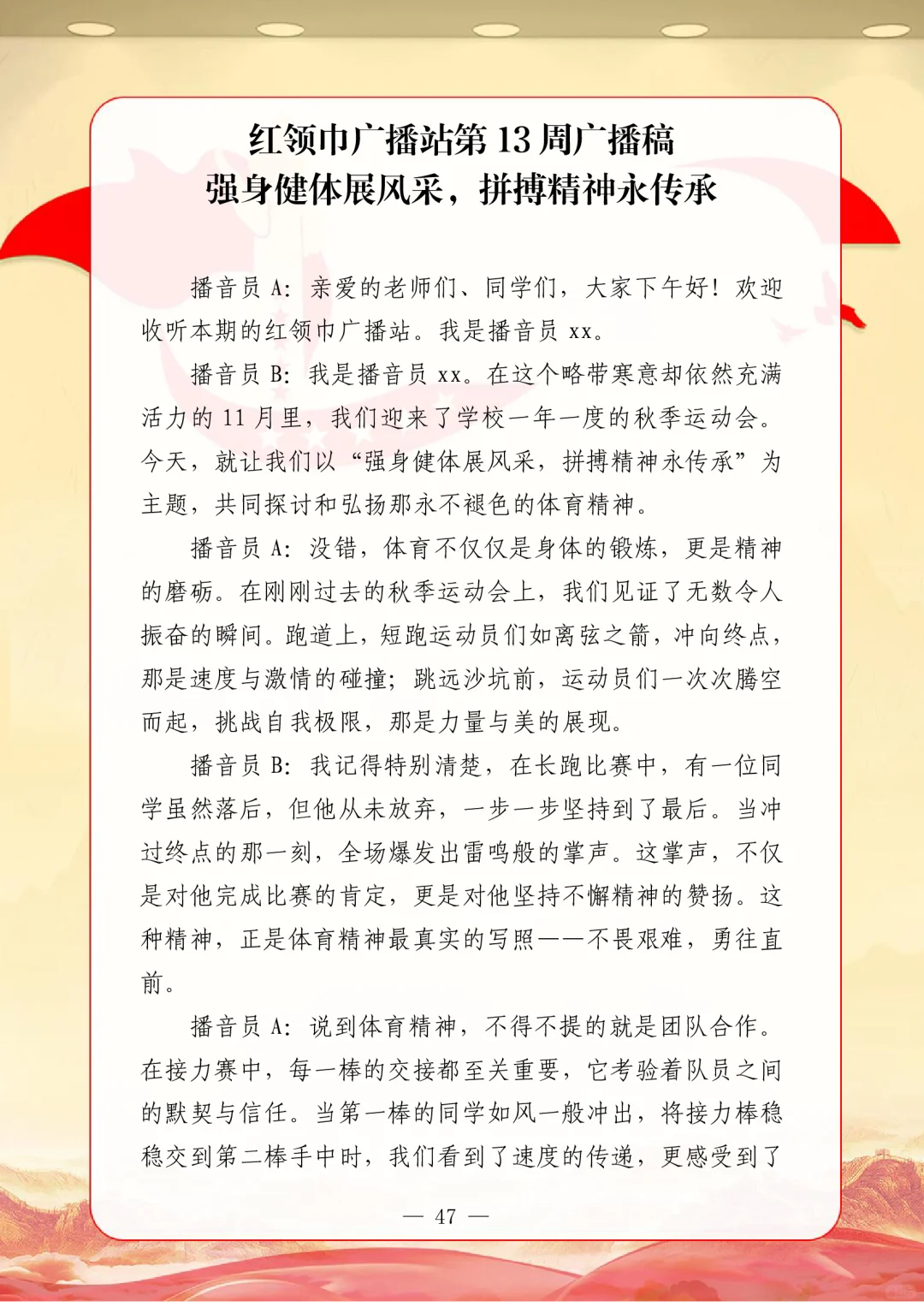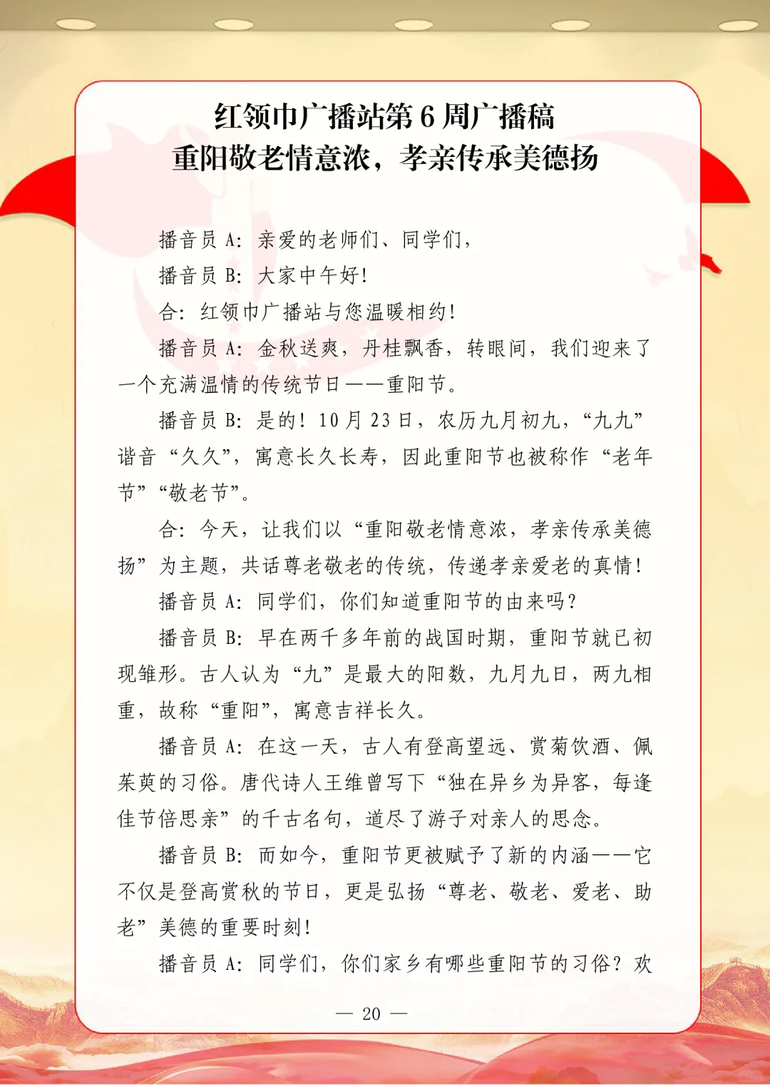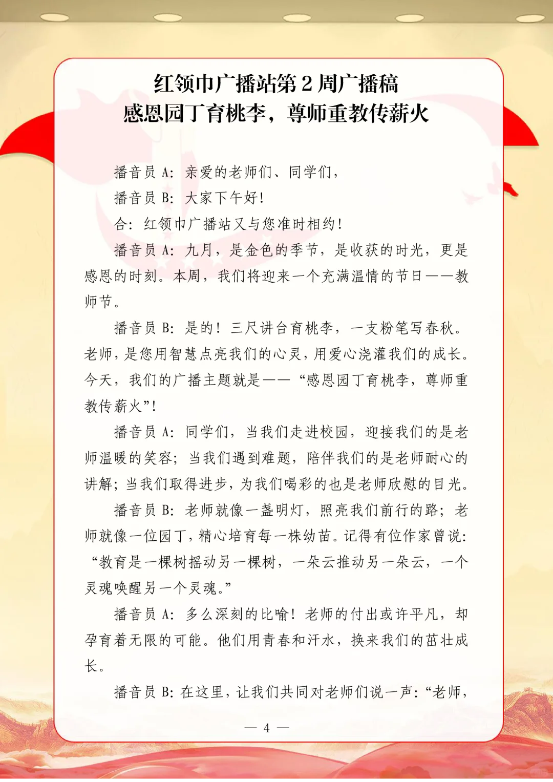 资源简介:年秋季广播站安排表含配套周广播稿学年第一学期广播站安排表含篇广播稿宝子们!秋季学期的广播站主题清单新鲜出炉~从开学到放假,周不重样,每天的课间都有期待感啦!第一周就用“扬帆起航新征程,砥砺奋进向未来”开嗓,新学期的元气直接通过电波传满校园!遇到教师节这周,“感恩园丁育桃李”的主题一响起,谁的眼眶不会悄悄发热呀~传统节日也藏在电波里哦!