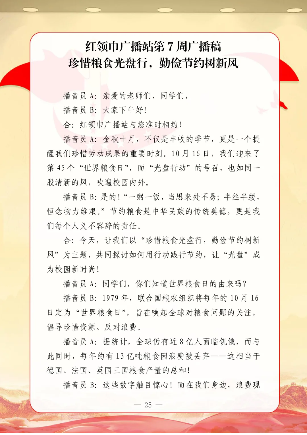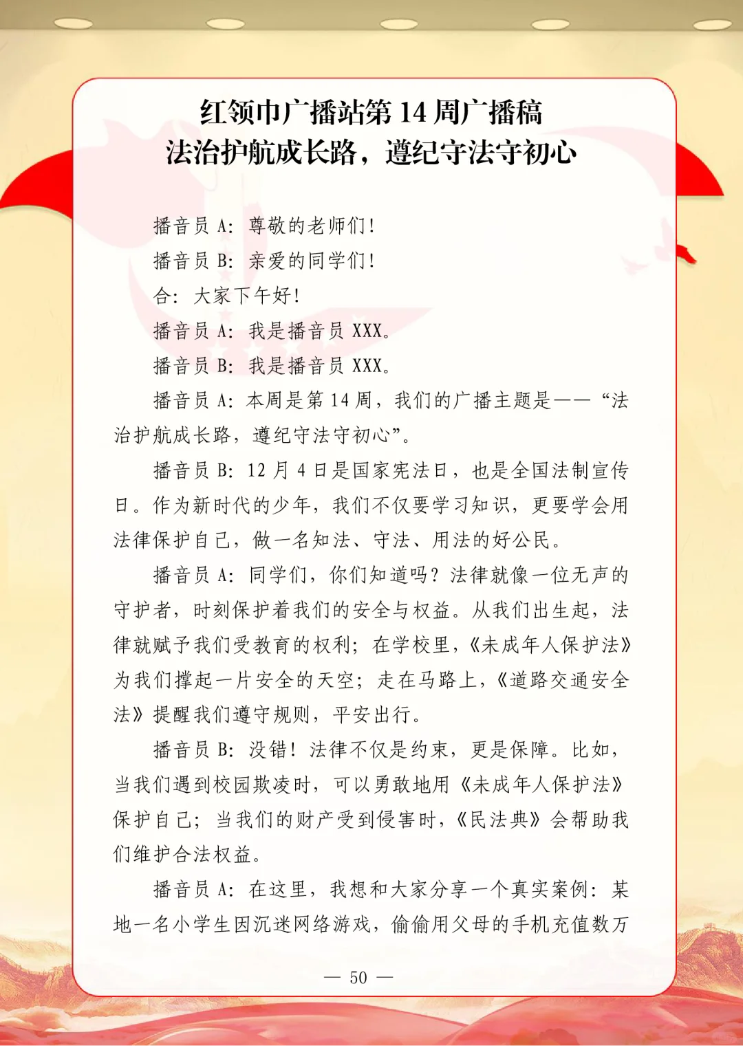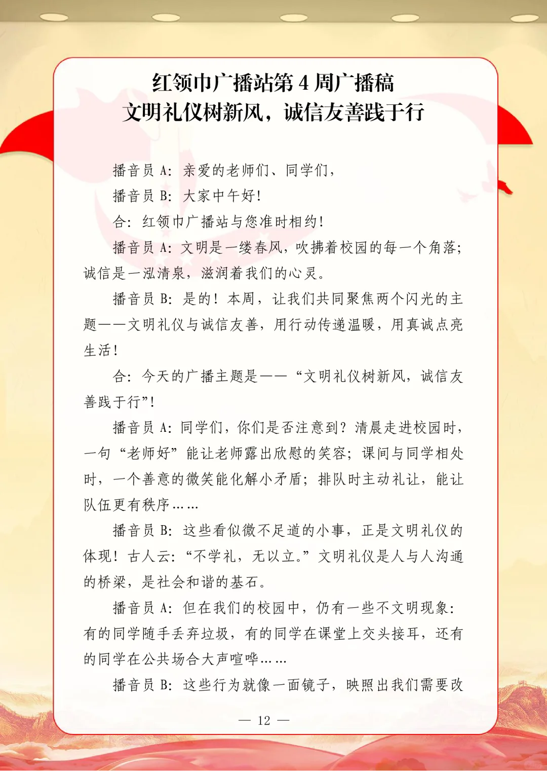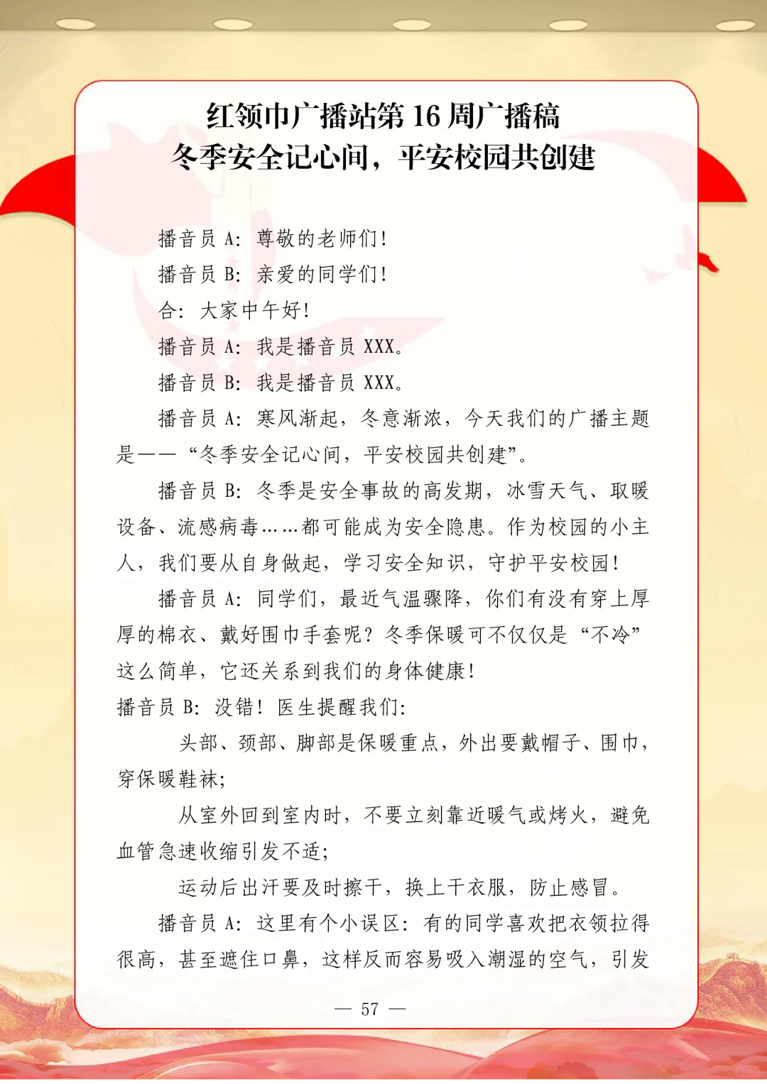资源简介:年秋季广播站安排表含配套周广播稿学年第一学期广播站安排表含篇广播稿宝子们!秋季学期的广播站主题清单新鲜出炉~从开学到放假,周不重样,每天的课间都有期待感啦!第一周就用“扬帆起航新征程,砥砺奋进向未来”开嗓,新学期的元气直接通过电波传满校园!遇到教师节这周,“感恩园丁育桃李”的主题一响起,谁的眼眶不会悄悄发热呀~传统节日也藏在电波里哦!