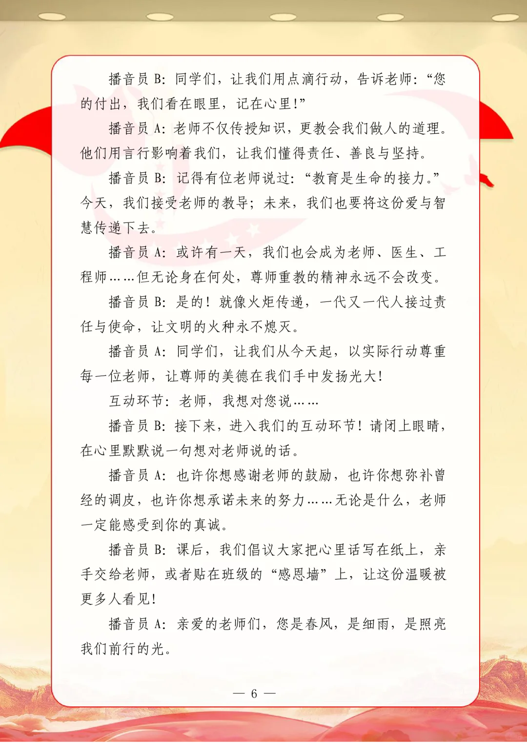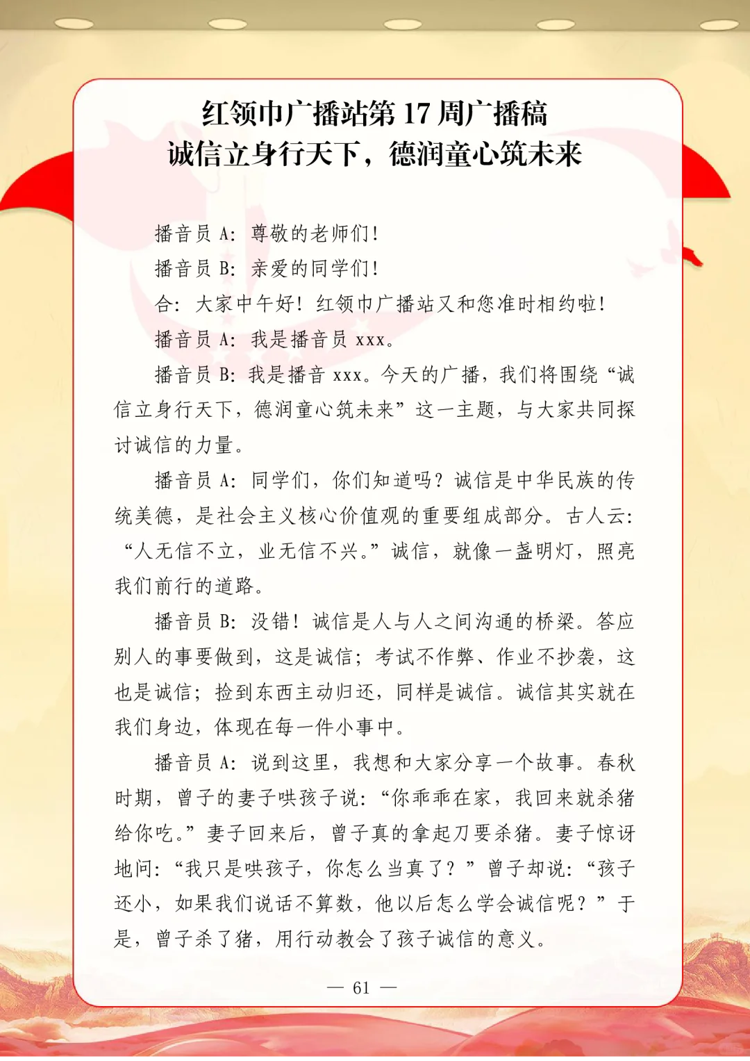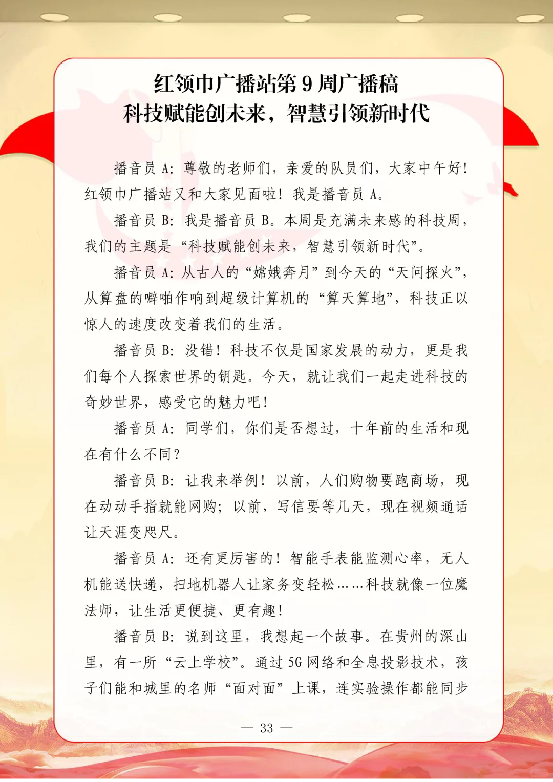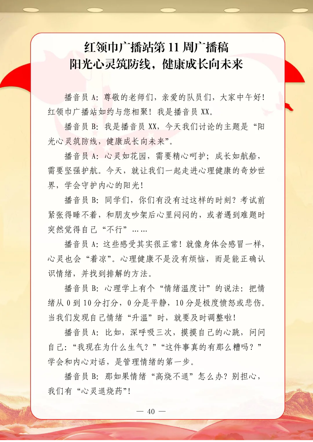 资源简介:年秋季广播站安排表含配套周广播稿学年第一学期广播站安排表含篇广播稿宝子们!秋季学期的广播站主题清单新鲜出炉~从开学到放假,周不重样,每天的课间都有期待感啦!第一周就用“扬帆起航新征程,砥砺奋进向未来”开嗓,新学期的元气直接通过电波传满校园!遇到教师节这周,“感恩园丁育桃李”的主题一响起,谁的眼眶不会悄悄发热呀~传统节日也藏在电波里哦!