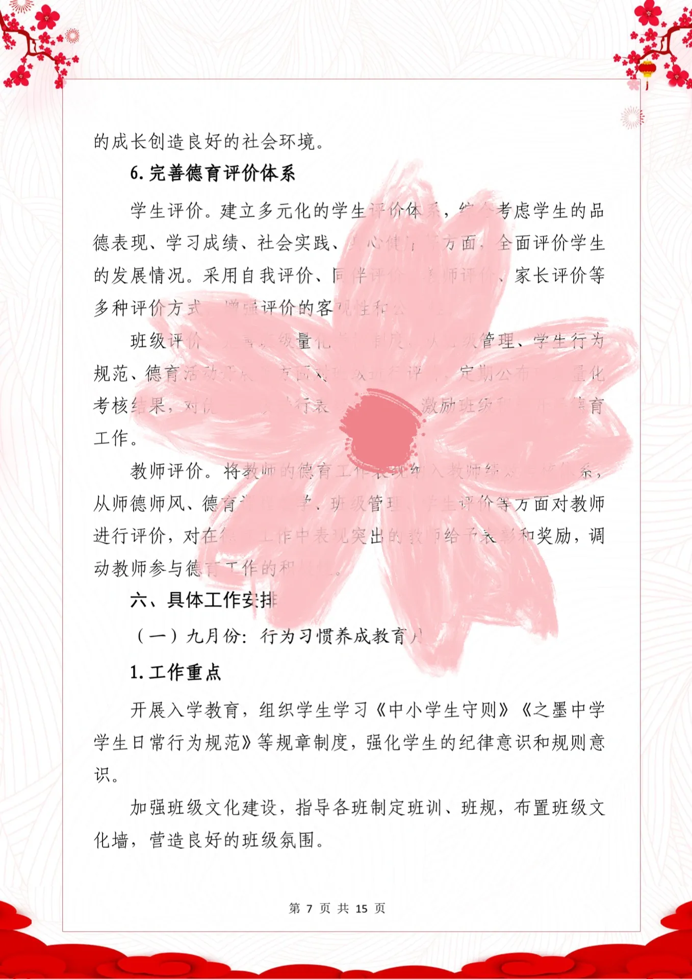 资源简介:中学版本2025年秋季德育工作计划,含月份工作安排表心系桃李勤耕耘,守正创新育栋梁——之墨中学年秋季德育工作计划学年第一学期德育工作计划(中学版本)学年第一学期德育工作安排表(月行事历、中学部本) 少先队大队辅导员德育工作大队辅导员德育工作计划德育工作计划安排表