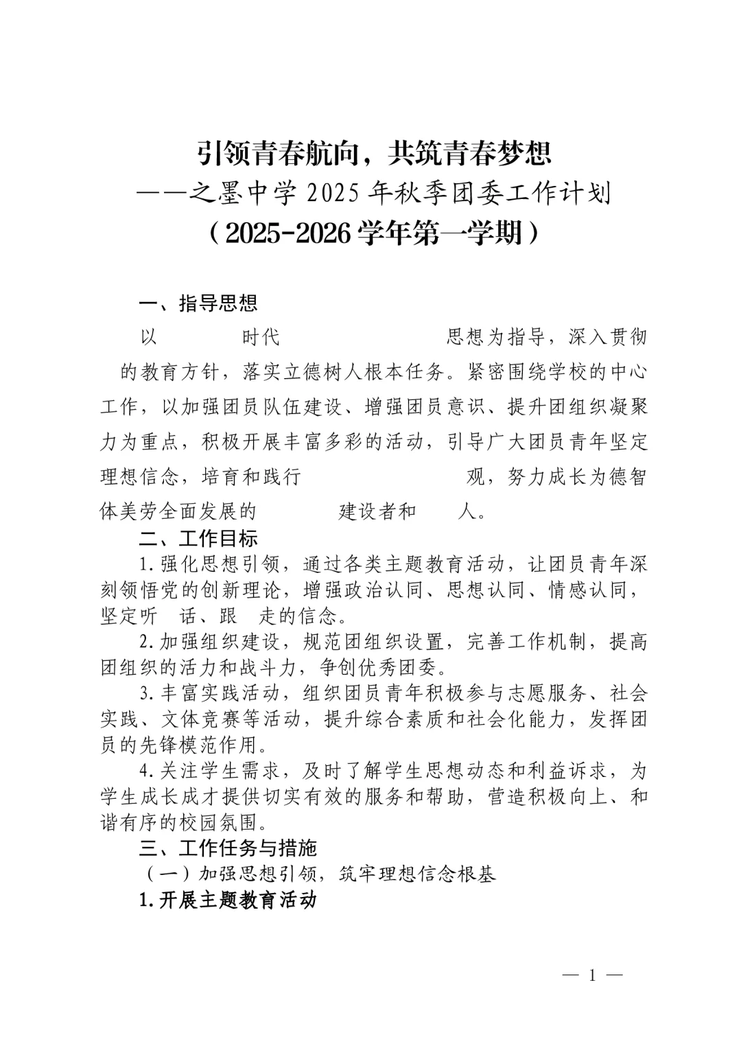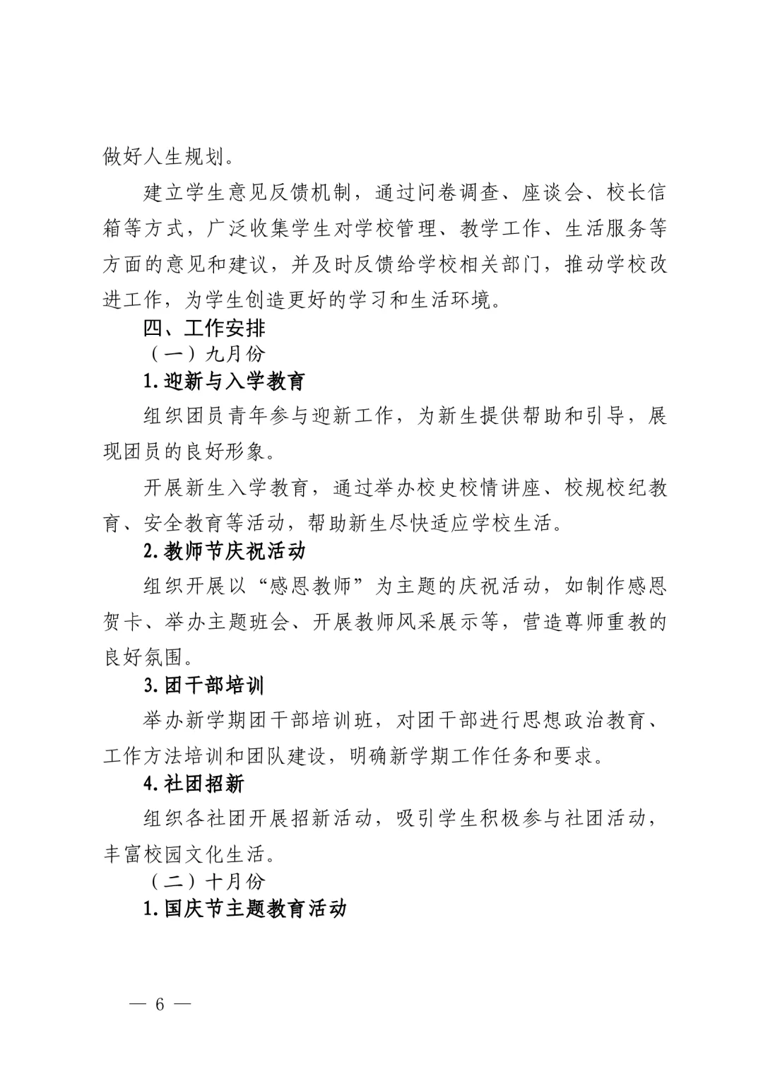 > 2025年秋季团委工作计划及月工作安排表——引领青春航向,共筑青春梦想