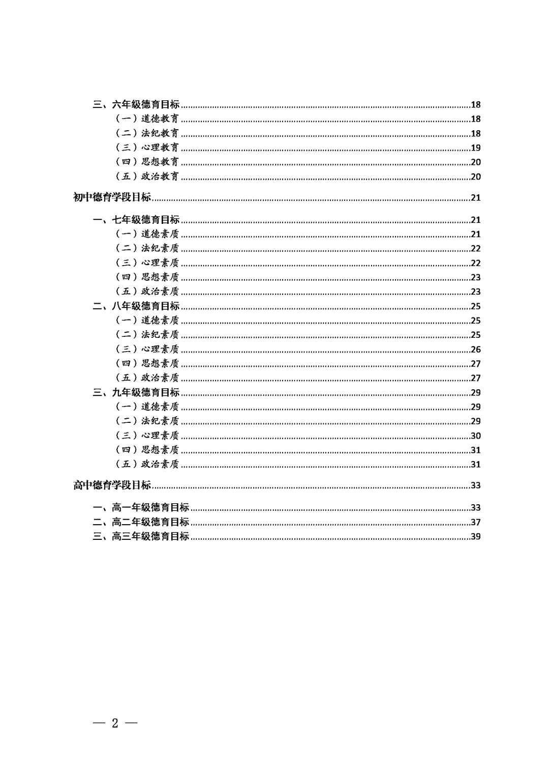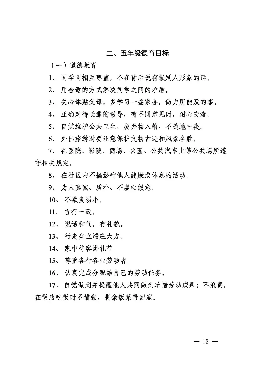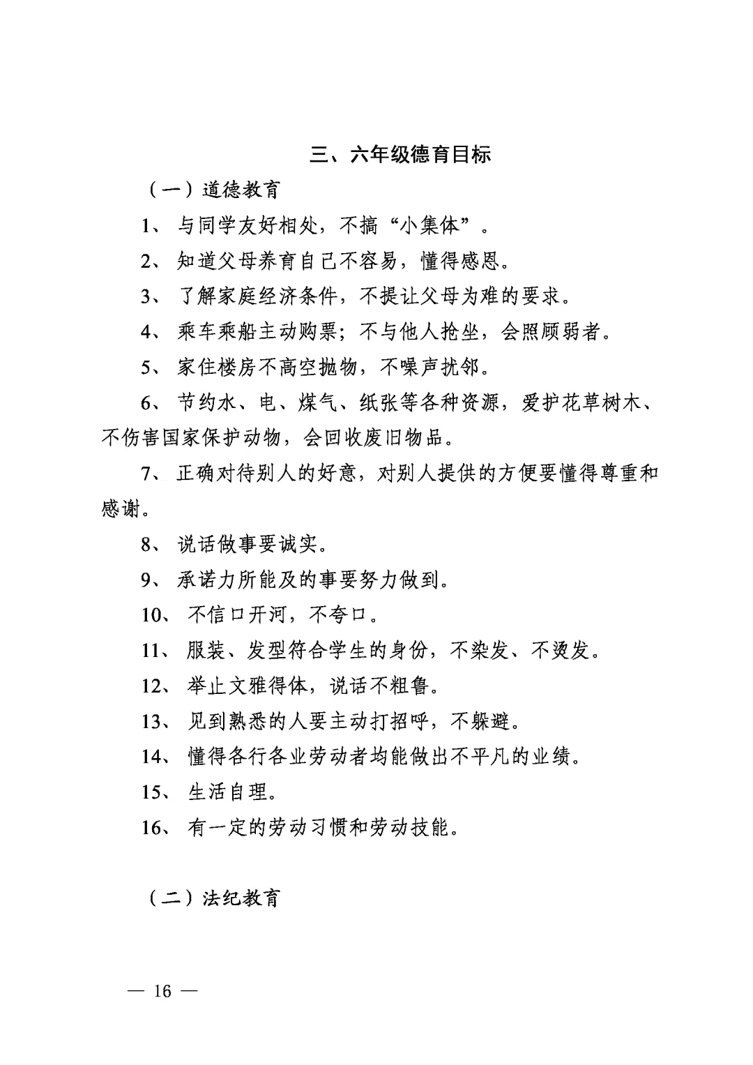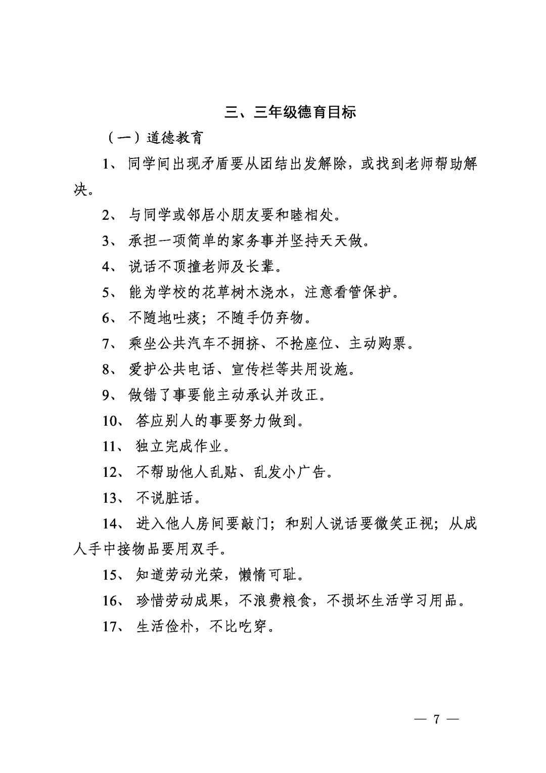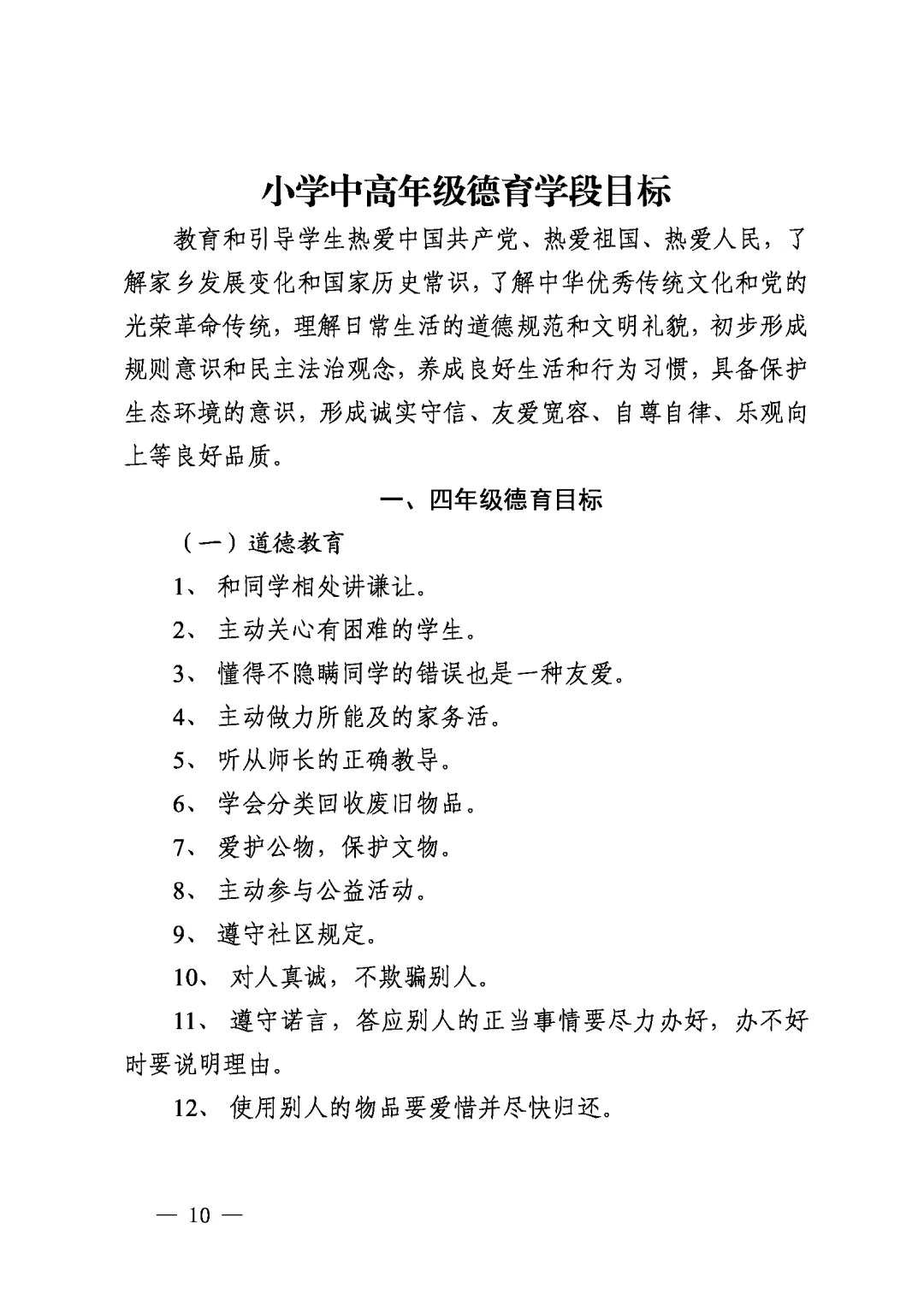 资源简介:小学各年级德育分段目标 初中各年级德育分段目标 高中各年级德育分段目标 小学:教育和引导学生了解家乡发展变化和历史常识,了解优秀传统文化和党的光荣革命传统,理解日常生活的道德规范和文明礼貌,初步形成规则意识和法治观念,养成良好生活和行为习惯,具备保护生态环境的意识,形成诚实守信、友爱宽容、自尊自律、乐观向上等良好品质。 初中德育学段目标:教育…,继承革命传统,弘扬民族精神,理解基本的社会规范和道德