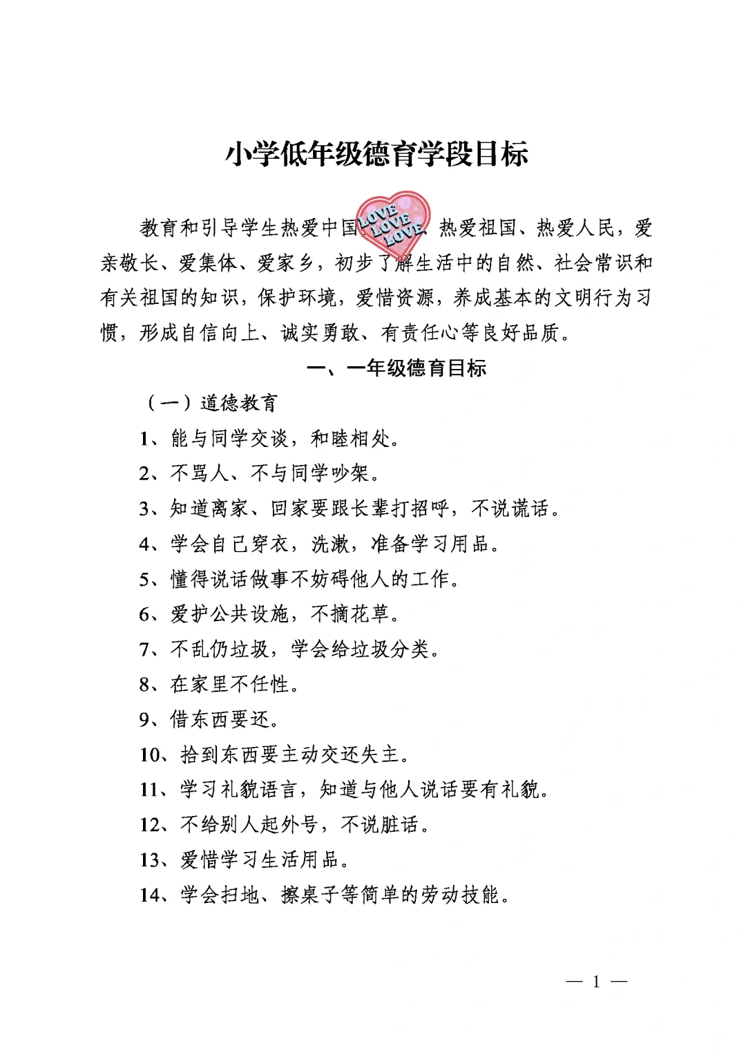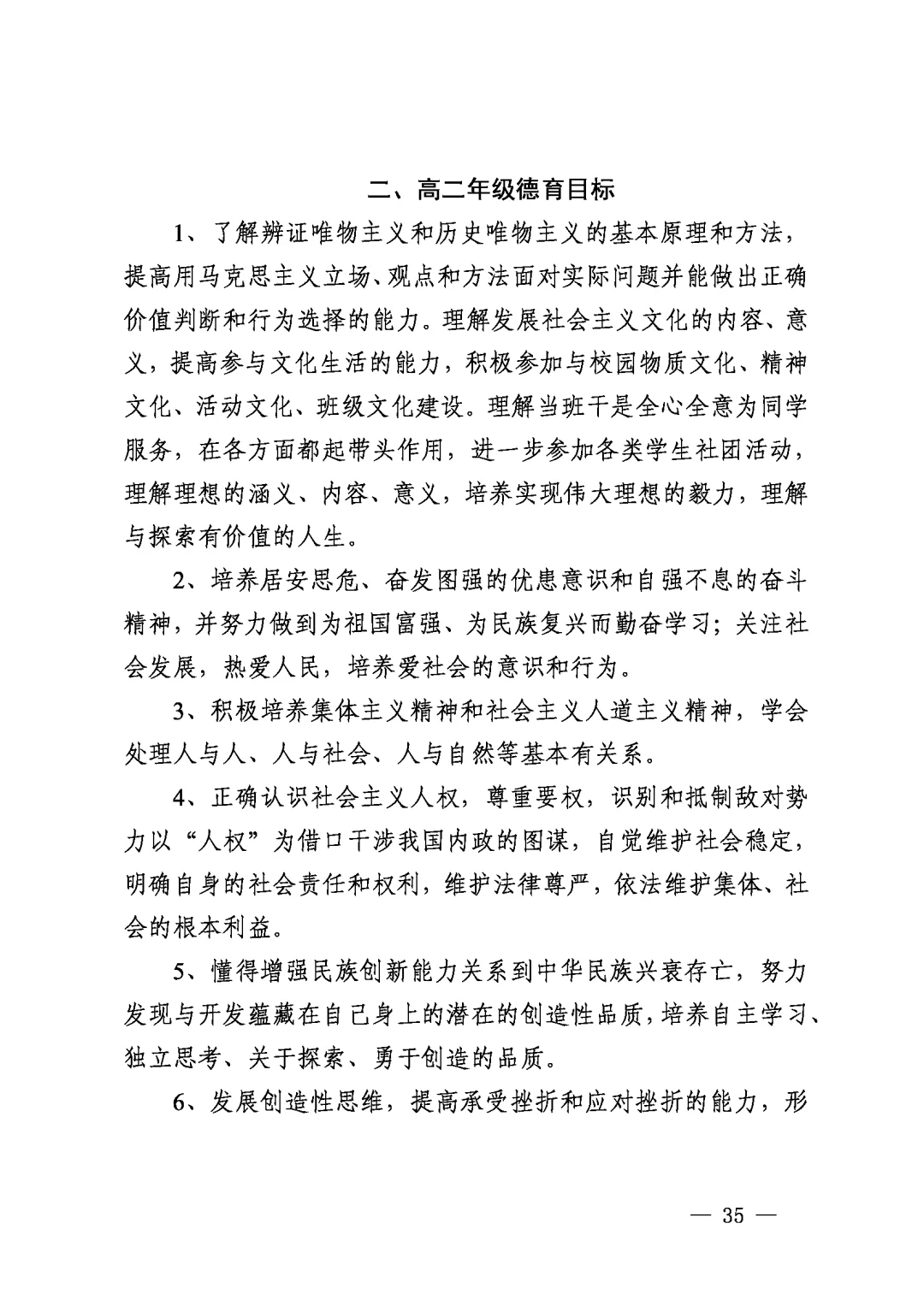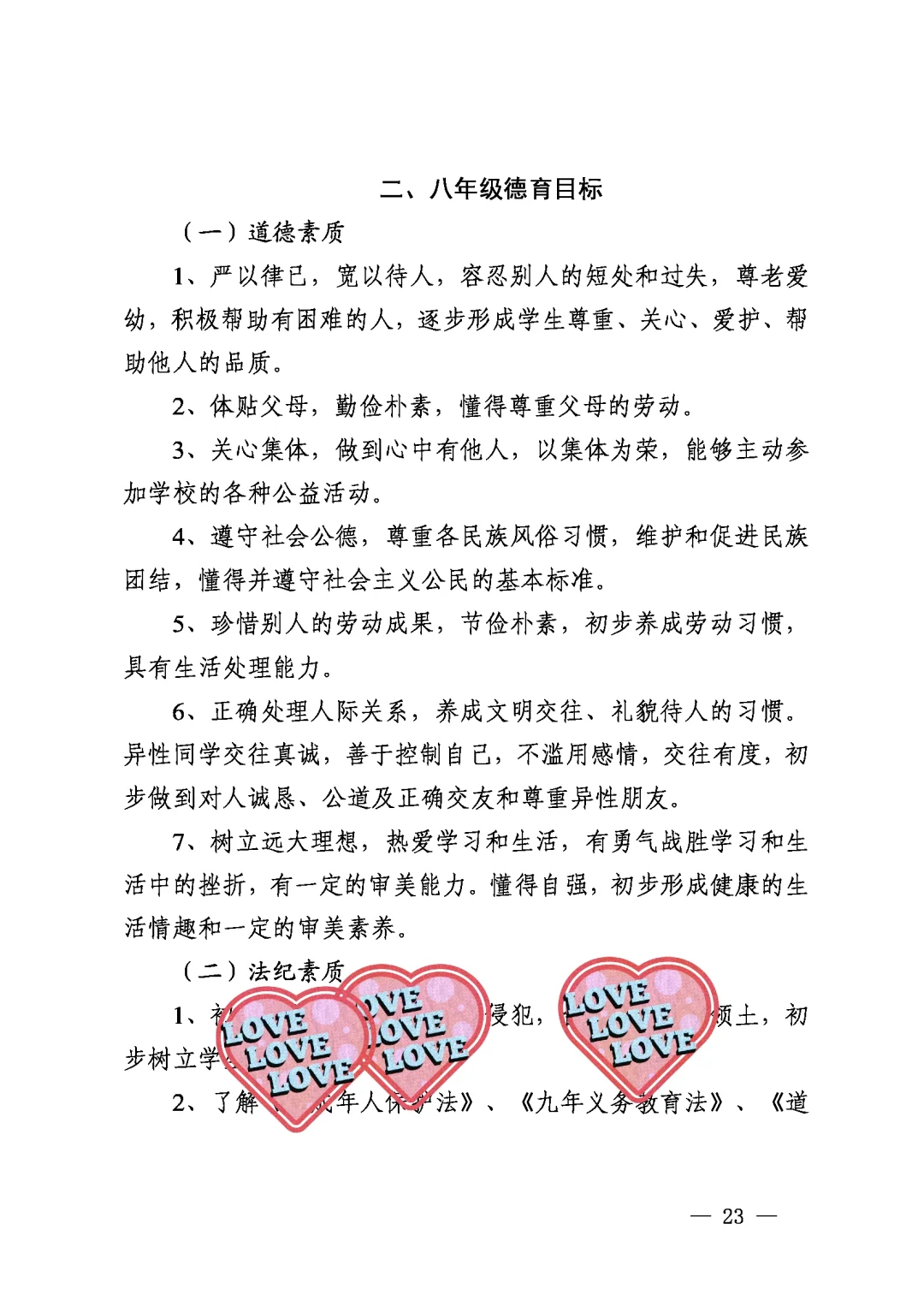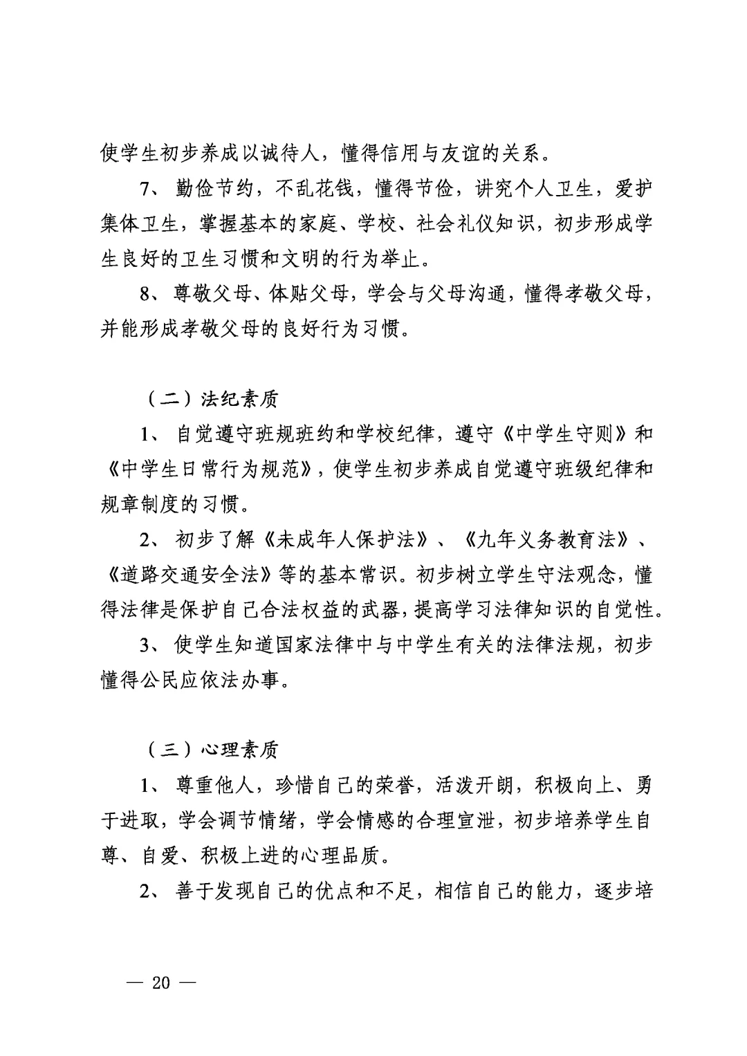 资源简介:小学各年级德育分段目标 初中各年级德育分段目标 高中各年级德育分段目标 小学:教育和引导学生了解家乡发展变化和历史常识,了解优秀传统文化和党的光荣革命传统,理解日常生活的道德规范和文明礼貌,初步形成规则意识和法治观念,养成良好生活和行为习惯,具备保护生态环境的意识,形成诚实守信、友爱宽容、自尊自律、乐观向上等良好品质。 初中德育学段目标:教育…,继承革命传统,弘扬民族精神,理解基本的社会规范和道德