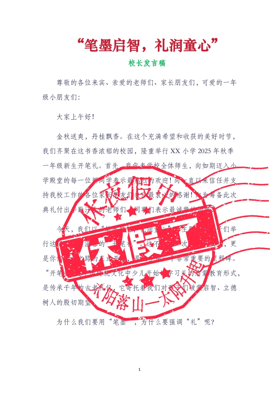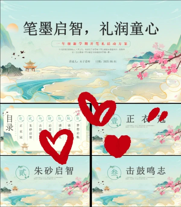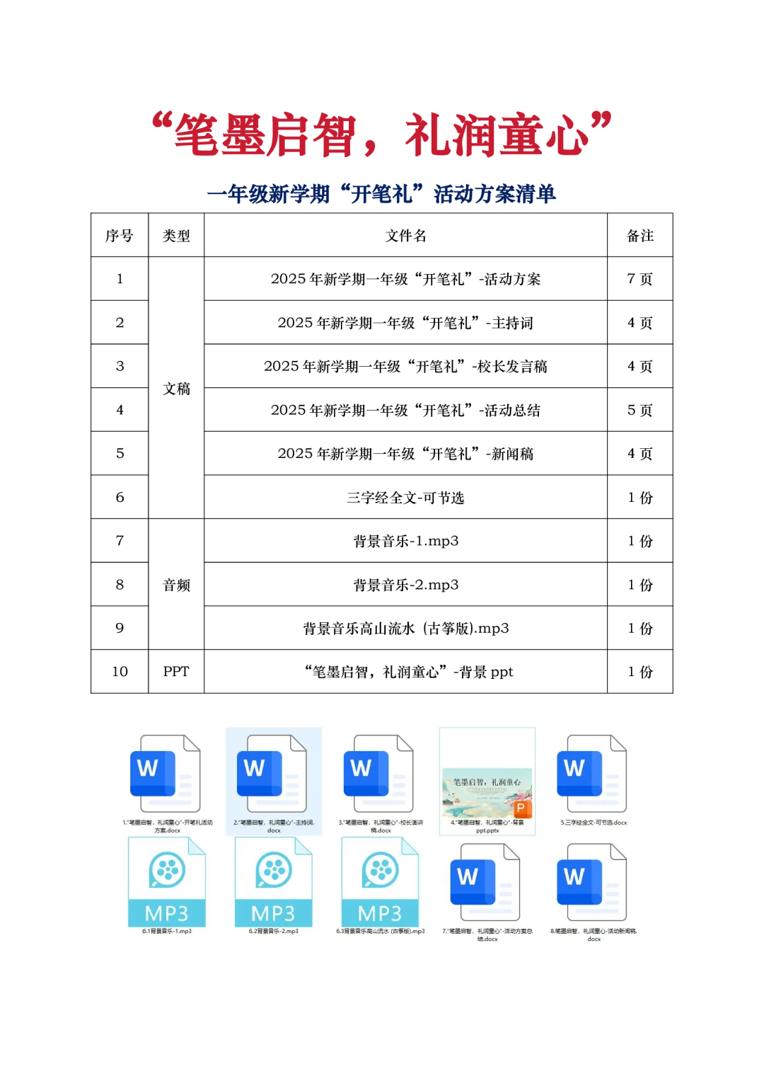 资源简介:2025年秋季开学一年级开笔礼活动 我是这样安排的 具体内容如下: 1.“笔墨启智,礼润童心”-开笔礼活动方案 2.“笔墨启智,礼润童心”-主持词 3.“笔墨启智,礼润童心”-校长演讲稿 4.“笔墨启智,礼润童心”-背景ppt 5.三字经全文-可节选 6.1背景音乐-1 6.2背景音乐-2 6.3背景音乐高山流水 (古筝版) 7.“笔墨启智,礼润童心”-活动方案总结 8.笔墨启智,礼润童心-活