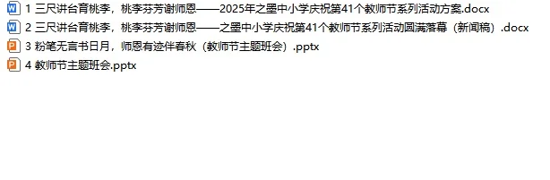 资源简介:2025年教师节主题活动方案 含主题班会PPT 以及活动新闻稿 第四十一个教师节系列主题活动方案 #德育工作 #少先队大队辅导员 #大队辅导员 #学校工会 #教师节活动方案